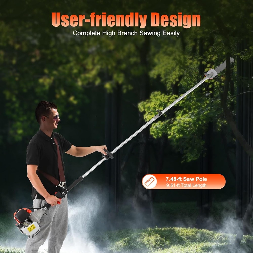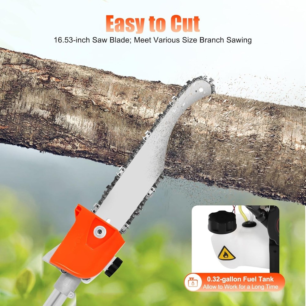 Product Description Description Are you still bothered by the unmanageable high branches in your yard? Then you can try our high branch saw. With it, you no longer need to risk climbing up a ladder or tree to trim branches. With its powerful 52cc engine, it gets the pruning job done easily and quickly. Its compact saw head can easily reach any corner without leaving a single weed or excess leaf behind. It will be your ideal choice! Specification Material: Aluminum Alloy Engine Type: Single Cylinder, Air-cooled, 2-stroke Gasoline Engine Fuel Consumption Rate: 480g/kw.h(1.05lbs/kw.h) Engine Displacement: 52cc Maximum No Load: 9500r/min Maximum Power: 1.25KW/6500RPM Fuel oil Mixture: 25:1 (2T engine oil) Fuel Tank Capacity: 1.2L/0.32gal Machine Weight: About 9kg/19.84lb Pole Length: 2.3m/90.55in Size: 35*35*250cm/13.78*13.78*98.43in (Plus Pole) Packing Size: 35*33*28cm/13.77*12.99*11in Package Included 1* High branch saw 1* Fuel Tank 1* Shoulder Strap Notes 1. It is necessary to add oil to the engine oil tank and gasoline tank to mix, shake it evenly before use 2.Please note that you must use two-stroke oil, not four-stroke oil or other engine oil, otherwise it will easily lead to pulling or other problems. 3.Please allow the slight color difference caused by the shooting light and 1-3 cm error due to manual measurement, and make sure you do not mind before ordering.