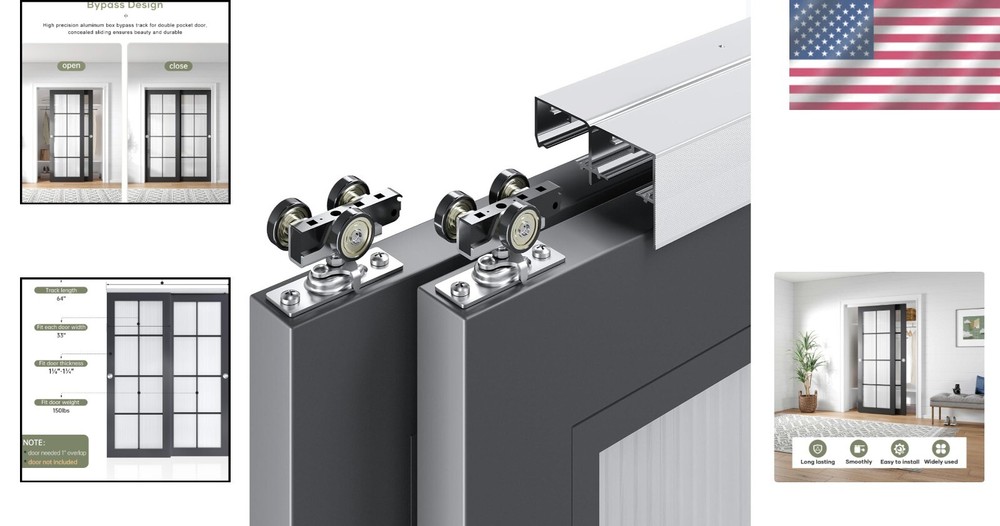 5.3FT Bypass Double Sliding Pocket Door Hardware Kit - Elegant Aluminum Solution ‹ › ‹ › ‹ › ‹ › ‹ › ‹ › ‹ › ‹ › ‹ › 5.3FT Bypass Double Sliding Pocket Door Hardware Kit Elegant Aluminum Solution Features: High precision aluminum box bypass track kit designed for bypass pocket doors. Concealed sliding track ensures beauty and durability. Track can be cut to your desired length for a perfect fit. Ball bearing three wheel rollers slide smoothly and quietly, tested beyond 100,000 rolls for lasting performance. Quick-release locking tab allows for easy installation or removal without running the door off the rail. Designed to fit double 33" wide doors; door needs 1" overlap. Compatible with door thickness of 1-3/8" or 1-3/4" (35mm or 45mm). Each door can support a weight capacity of 150lbs. Package includes: (1) 5.3ft rail, (4) rollers, (1) door stop, (1) floor guide, (2) finger pulls. (DOOR NOT INCLUDED). Benefits: Transform your entryways with an elegant and modern sliding door solution. Enjoy a smooth and quiet operation, enhancing the comfort of your home. Experience versatility with adjustable track length for customized installations. Rest assured with impressive weight capacity, providing durability and trustworthiness. Easy to install, thanks to the comprehensive graphic and text installation manual. Responsive customer service available 24/7 to support your needs. Why Choose Our Bypass Double Sliding Pocket Door Hardware Kit? Elevate your living space with our 5.3FT Bypass Double Sliding Pocket Door Hardware Kit, the perfect blend of elegance and functionality. The high-quality aluminum construction provides not just aesthetic appeal but also promises durability over time. The effortless glide of the ball-bearing rollers ensures a serene environment in your home, while its robust design accommodates doors of substantial weight. Plus, detailed installation guidance simplifies the setup process, making it achievable for anyone. Enhance your home's sophistication and functionality today with this stylish sliding door hardware kit – order now to experience a seamless entrance to elegance! Shipping Free & Fast Shipping - We offer free shipping to most of the USA with a normal delivery time of 3-7 days. However, due to the current situation, additional delivery time (up to 3 weeks) may be required for some items. Alternative Carriers - We may use alternative carriers (e.g. USPS, FedEx, UPS, etc.) to ensure your package arrives safely and on time. Due to the use of multiple carriers, we are unable to provide a tracking number automatically. Handling Time - Orders are processed and shipped within 1-2 business days of receiving cleared payment. Shipping Restrictions - Shipping to Alaska, Hawaii, Puerto Rico, Guam, and other US territories may incur shipping charges or delivery restrictions. Please contact us before ordering, or your order can be refunded/cancelled. State Restrictions - There may be restrictions based on your state of purchase. For example, certain items may not be shipped to California due to state regulations. Contact for Tracking Updates - If you require tracking updates or have any concerns about the delivery of your order, please feel free to contact us, and we will be happy to assist you. Return 30-Day Hassle-Free Returns - We want you to be completely satisfied with your purchase. If you are not, you can return the item within 30 days of receiving it for a full refund or exchange. Easy Return Process - To start a return, simply contact us and we will provide you with a prepaid return shipping label and detailed instructions. Restocking Fee - There are no restocking fees for returns. However, the buyer is responsible for return shipping costs if the return is not due to a seller's error. Refund Processing Time - Refunds will be processed within 5 business days of receiving the returned item in its condition. Payment We accept all major credit cards, PayPal, and Apple Pay for your convenience. Your payment information is secure and encrypted to ensure a safe and seamless transaction. Please complete your payment within 3 days of purchase to avoid any delays in shipping. Feedback Your feedback is extremely important to us. We strive to provide the best products and customer service possible. If you are satisfied with your purchase, please take a moment to leave us a positive review. If you have any concerns or issues with your order, please contact us before leaving negative feedback. We are committed to resolving any problems and ensuring your satisfaction. Contact Us If you have any questions or concerns, please feel free to out to our customer support team. You can contact us through the eBay messaging system. We are available Monday to Friday, 9:00 am to 5:00 pm EST, and we will do our best to respond to your inquiry within 24 hours. Buy it now and enjoy a pleasant shopping experience! Model: Pocket Door Hardware Kit Unit Quantity: 7.68 pounds Suitable For: Pocket Door,Sliding Door,Bypassing Closet Doors,Commercial,Residential Material: Aluminum Features: Concealed,Lift-Off,Self Closing,Soft Close Type: Installation Kit Color: Silver Finish: Satin Number in Pack: 1 Style: Modern Item Weight: 7.68 pounds Unit Type: lb