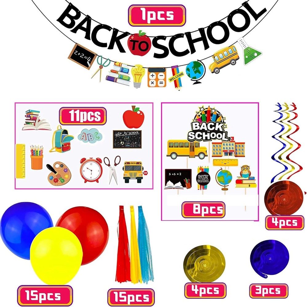 Free eBay listing template designed by dewiso.com Back To School Decorations 54PCS Back to School Party Decorations with Back to School Banner Balloons Cake Topper Back To School Decorations for Classroom Welcome Back to School Decorations for School FREE AND FAST SHIPPING! About this item FESTIVE AND BEAUTIFUL DECOR: If you have a student or teacher who's going to school this year, you know he or she will need an atmosphere welcome to kick off. This back to school party decorations is a nice option,never let you down. ALL WHAT YOU NEED IN 1 BIG PARTY: 1pcs back to school banner,11pcs hanging swrils,15pcs latex balloons ,2pcslarger apple balloons, 8pcs cake topper,15pcs tassels,1pcs glue do,t1pcsribbon,More than enough pieces for a great party. SUPER LARGE BALLOONS BANNER: Back to school school banner is a big banner 4.8’’X6.2’’-Not need DIY.Apple balloons are super lager and support hydrogen.All the balloons could last a long time.Back to school swirls are 11pcs,each is adorable. UNIQUE WELCOME TO SCHOOL THEMED DESIGN: Back to school decorations for classroom is a catching-eye.Double-Printed back to school hanging swril is made of cardboard.High-quality black printed card stock,beautiful enough,it will be a hit at your students party and you will receive countless compliments. WIDE APPLICATION: The back to school banner is suitable for classrooms, offices, elementary schools,high school yards,universities, colleges, kindergartens,outdoor school gymnasiums,back to school decoration, welcome parties, children's show on the first day of school,back-to-school party and classroom decoration. Product We offer a 30-Day Return Policy on items which you are not completely satisfied with. You have the option for a full-refund or an exchange of the item. No returns are available on items shipped outside of the US . Shipping We offer Free Shipping to the US and ship within 2 business days of payment, usually sooner. We use UPS express shipping. That's why your products are usually delivered within 3 days . Contact We try our very best to make sure every customer is completely satisfied. If there's a problem , message us! We're happy to help. 24/7 live chat available.