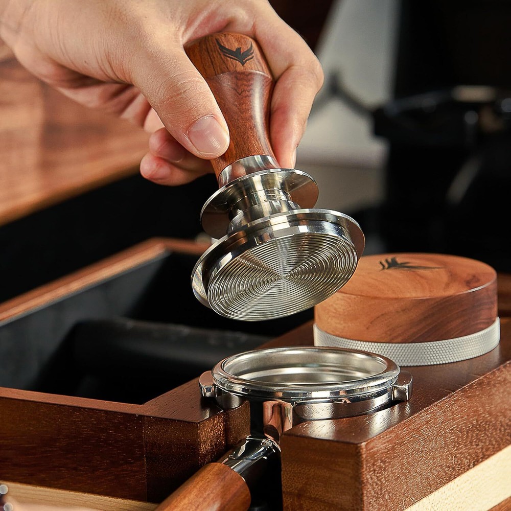 Free eBay listing template designed by dewiso.com 54mm Espresso Tamper for Breville Espresso Machines V2 Rosewood KNODOS Auto Leveling and Double Spring Loaded Design Wooden 30lb Calibrated Coffee Tamper FREE AND FAST SHIPPING! Best Size for Breville uniquely sized at 53.3mm, our tamper base offers a superior fit and better tamping for 54mm Breville portafilters compared to common 53mm coffee tampers. The precision fit ensures an even coffee bed, significantly enhancing espresso flavor and consistency The package includes not only a high-quality calibrated coffee tamper but also a cute portafilter shape keychain, all packaged barista espresso tools in a gift box.Comes with 3 interchangeable 20lb, 25lb and 30lb springs to suit your preference This coffee tamper has auto leveling and a spring-loaded design, which makes it easy to use. It also has a constant block feature that ensures the coffee is consistently Compatible with all 54mm Breville Barista Express, Barista Pro, Barista Touch, Bambino Plus, Infuser, Duo Temp Pro Complete your espresso set with this 54mm coffee tamper with other high-quality Knodos espresso tools for the ultimate coffee experience. Perfectly compatible with Knodos leveling tool, tamping station, portafilter, bean cellar, knock box, dosing funnel and WDT tool Product We offer a 30-Day Return Policy on items which you are not completely satisfied with. You have the option for a full-refund or an exchange of the item. No returns are available on items shipped outside of the US . Shipping We offer Free Shipping to the US and ship within 2 business days of payment, usually sooner. We use UPS express shipping. That's why your products are usually delivered within 3 days . Contact We try our very best to make sure every customer is completely satisfied. If there's a problem , message us! We're happy to help. 24/7 live chat available.
