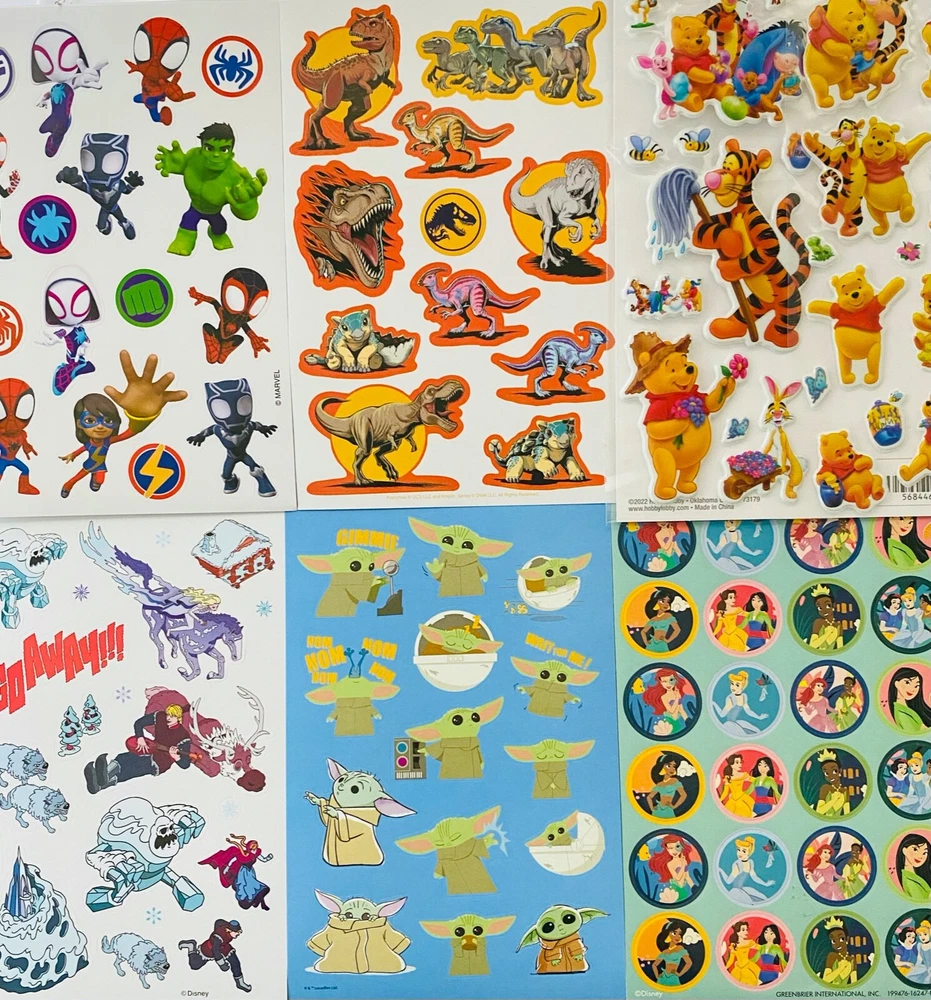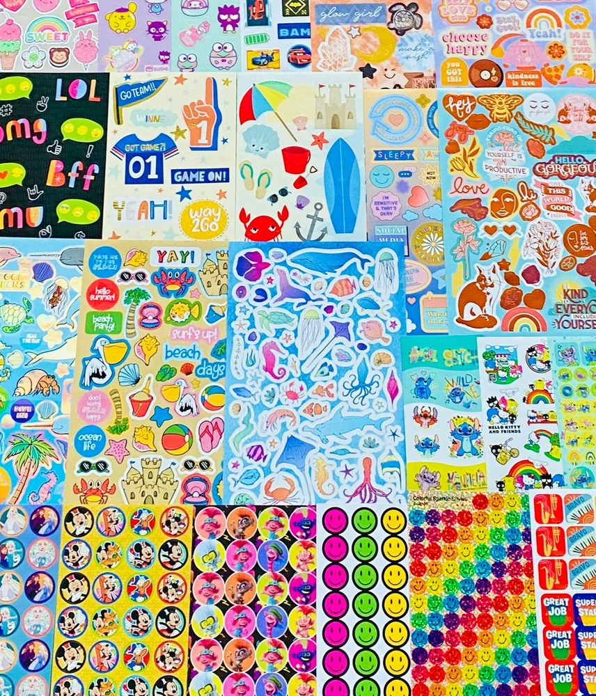 Randomly Selected or Message me with your Sticker Request... Add some fun to your scrapbooking projects with these 55 different Full sheets of stickers. Perfect for kids, children, and teens, these stickers come in a variety of designs featuring your favorite cartoons, characters, shapes, sizes and themes. The stickers are available in a range of types, including puffy bubble foam, glossy metallic, prism 3D, and holographic glitter.