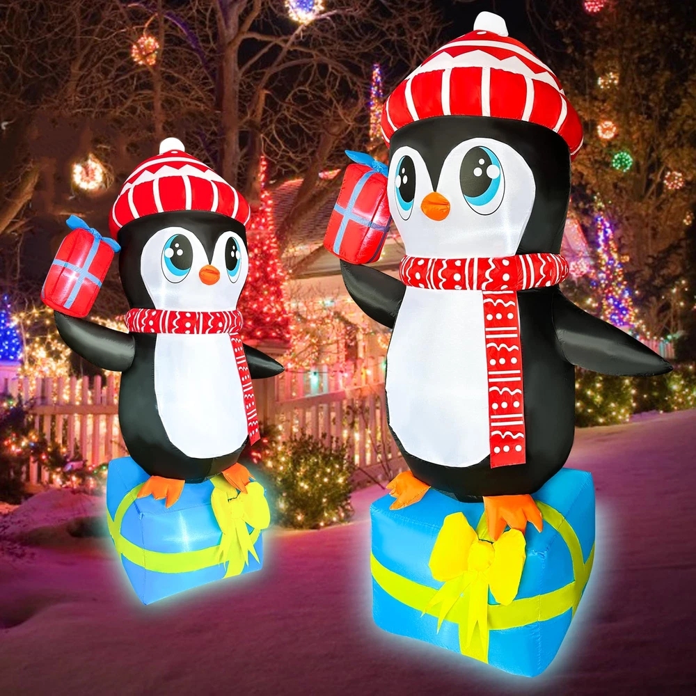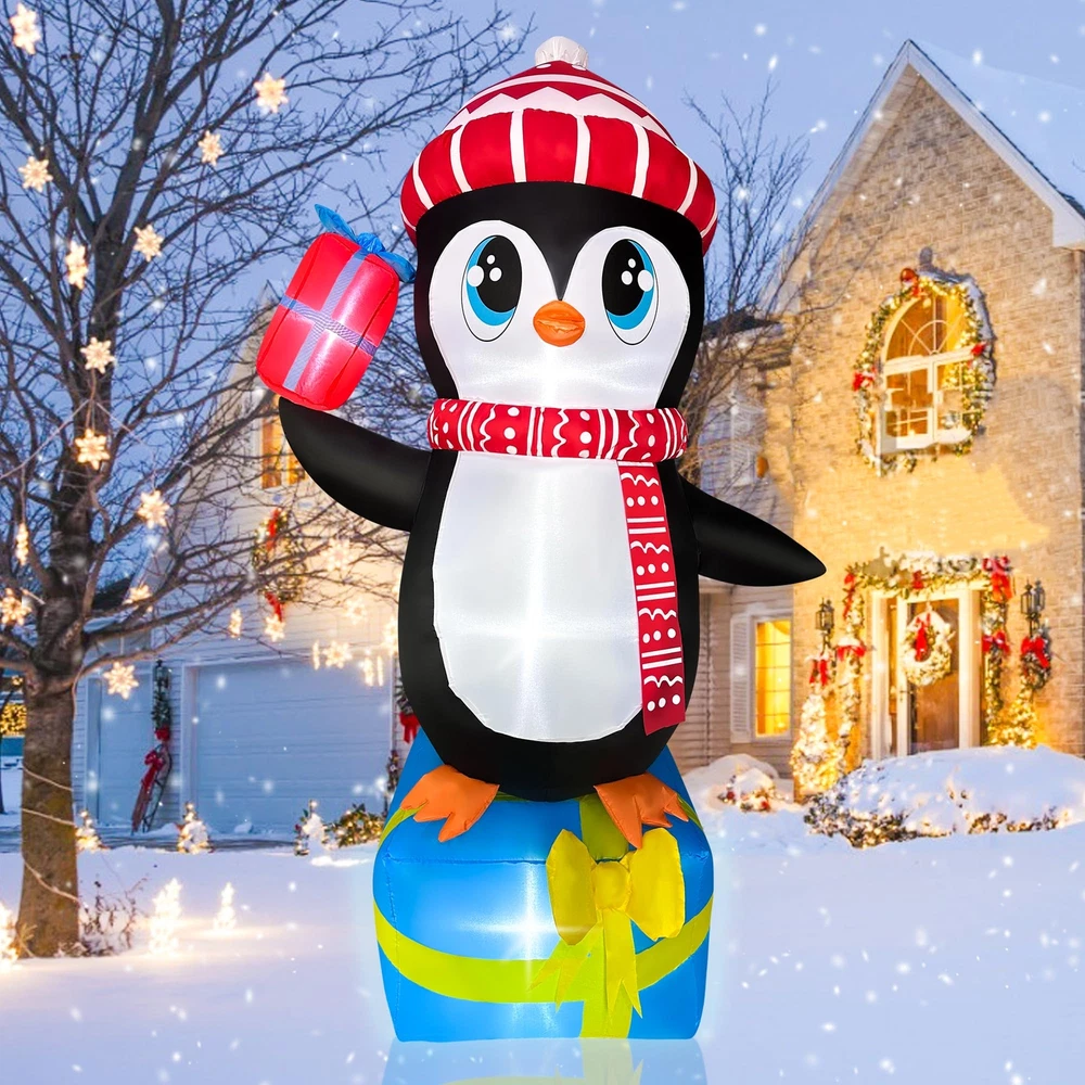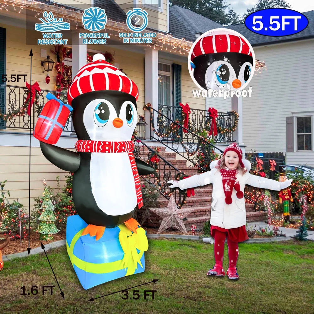 【5.5 FT Christmas Inflatable】Out Cute Penguin wearing hat standing on top of the gift is ideal christmas blow up decorations. The Christmas Inflatables will light up your home and welcome your lovely friend! 【Built-in LED light】Christmas inflatable outdoor decoration equipped with LED light, large and bright enough to illuminate the cheerful atmosphere of Christmas Night! Easy to spot! This inflatable outdoor holiday yard decorations would be an ideal host to welcome your Xmas guests. 【Stable Design & High-quality Materials】The inflatable christmas decorations are designed to be stable and inflatable during the holiday. The christmas blow up yard comes with ropes and stakes to ensure the stability of the inflatables. 【Inflated Quickly&Space-saving】Just plug this christmas inflatables decorations in, it has a built-in fan and in only seconds it will be fully inflated, then secure it to the ground. 【After Service】If you're unsatisfied or have any problems with Xmas Blow Up Yard Decoration please contact the seller through Amazon.