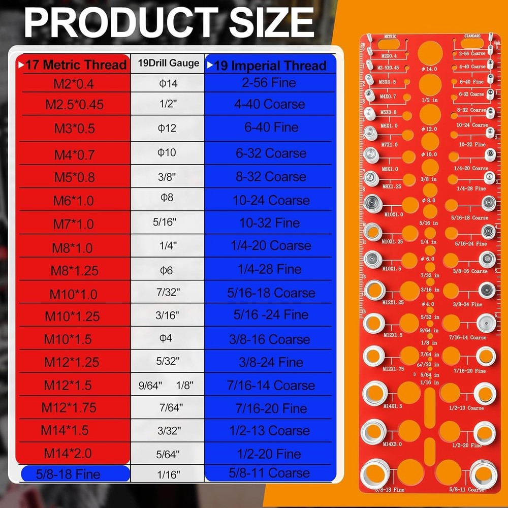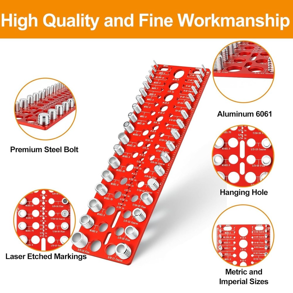 Upgraded 36 Thread Gauge Sae and Metric: Have you ever had to repeatedly dash to the hardware store, just to determine the right bolt or nut size? Now, say goodbye to guesswork with our nut and bolt thread checker. our bolt size and thread gauge covers a wide range, encompassing 17 metric thread sizes from m2 x 0.4 to m14 x 2.0, as well as 19 standard threads, spanning from 2-56 to 5/8 -18 fine. This thread checker should become a must-have tool for your garage, workshop or home storage room Upgraded 19 Drill Bit Gauge: When faced with a bunch of different sizes of bits that are hard to distinguish, our upgraded 19-in-1 Drill Gauge Set is the ideal choice. It includes 6 metric (4mm, 6mm, 8mm, 10mm, 12mm, 14mm) and 13 imperial (1/16“ to 1/2”) drill gauges to ensure you find the size you need quickly and accurately. With a compact design, scales and pre-drilled holes on both sides for easy wall mounting, placement or storage, this thread checker is a handy addition to your toolbox Excellent Quality Screw Thread Gauge: Our bolt identifier board are CNC machined from anodized 6601 Aluminum, and the bolts are made from high quality steel, machined with extreme precision to ensuring each bolt and thread complies with the Go & No Go Class 2B ANSI Standard gauge Precise and clear marking: The bolt identifier board is designed with white lettering on a red background and laser-etched imperial and metric dimensions underneath the bolts and nuts, which are clear and easy to read, making identification of various thread sizes fast, accurate and easy Your must-have Thread Checker Tool: This nut and bolt thread checker is an indispensable tool and gift choice for professionals and a white elephant gift for adults. Its one-piece design ensures that all parts stay securely and organized on the tool, eliminating the worry of misplaced or tangled parts. Whether you are an auto mechanic, carpenter, welder, plumber or shop technician, this comprehensive set of bolt size and thread gauge will be your most reliable companion