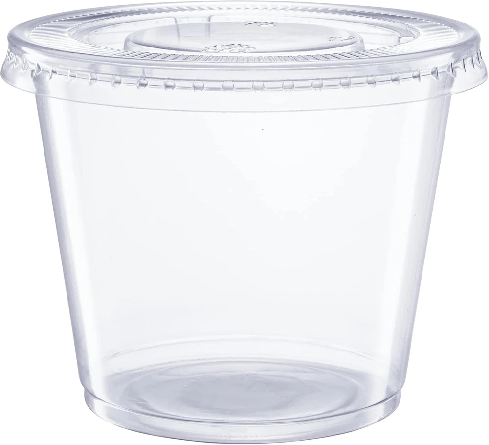 Durable and Reliable: Made from sturdy plastic, these disposable condiment cups with lids are built to withstand handling and transportation without bending or breaking, ensuring a reliable solution for all your portioning needs. Secure Lids: Each jello shot cups with lids comes with a snug-fitting lid to prevent spills and leaks, ensuring that your contents stay fresh and secure whether you're serving or storing. Compact and Practical: Each 5.5 oz. clear cup is designed for small, precise servings, making them perfect for portioning out samples, condiments, and appetizers at events or gatherings. The transparent color allows easy visibility of contents. Easy Cleanup Condiment Cups: Designed for single-use, these condiment containers with lids offer quick and easy cleanup after events or meals, saving you time and effort on washing and storing reusable items. Generous Pack Size: Each pack includes 100 plastic condiment cups with lids with matching lids, providing a substantial quantity for serving multiple guests or handling a variety of portioning needs in one go. Product Description