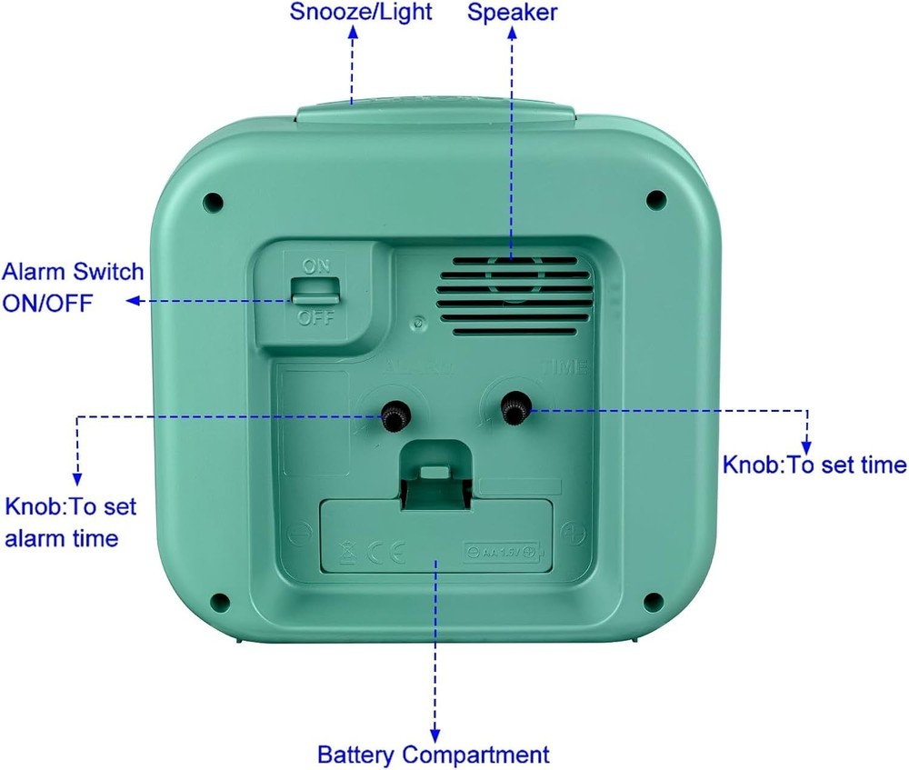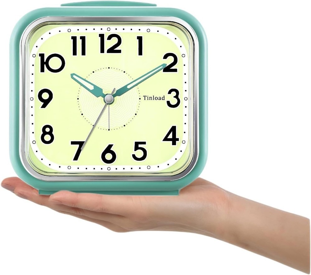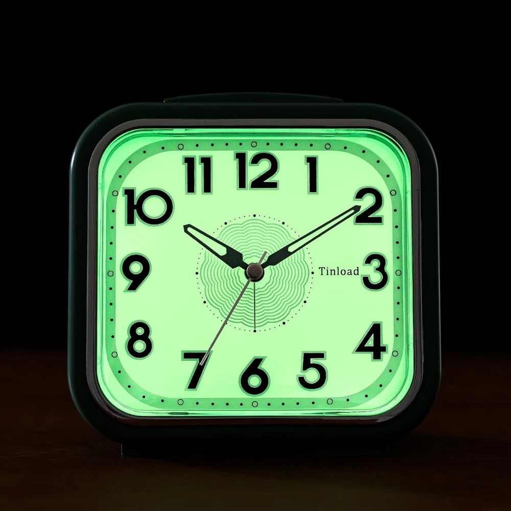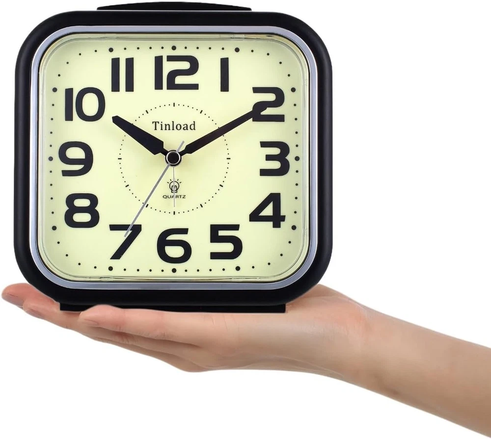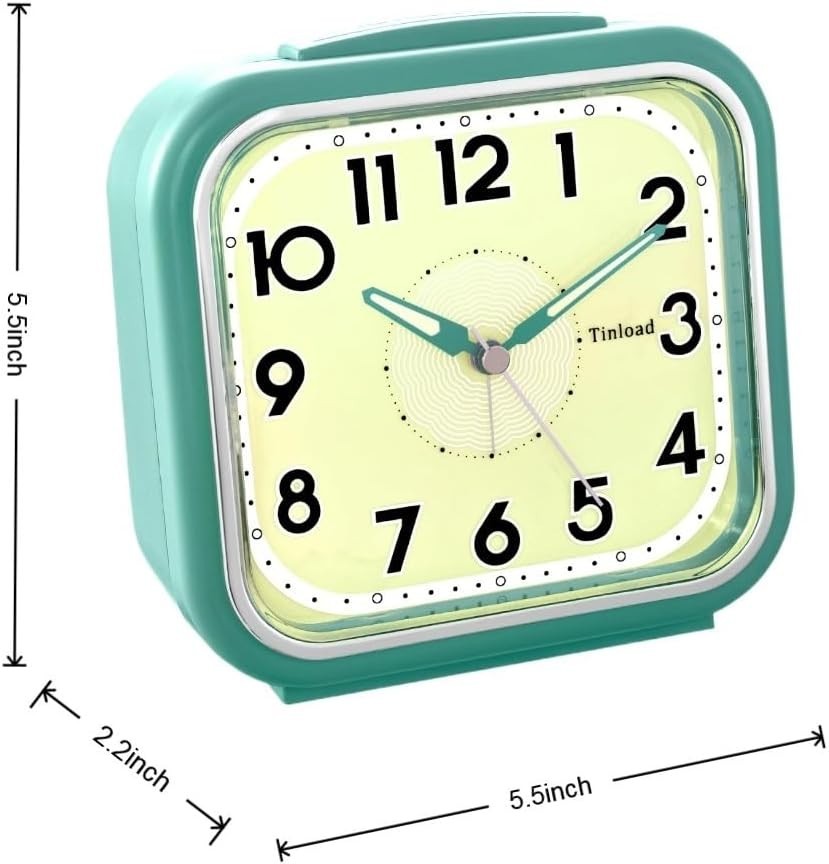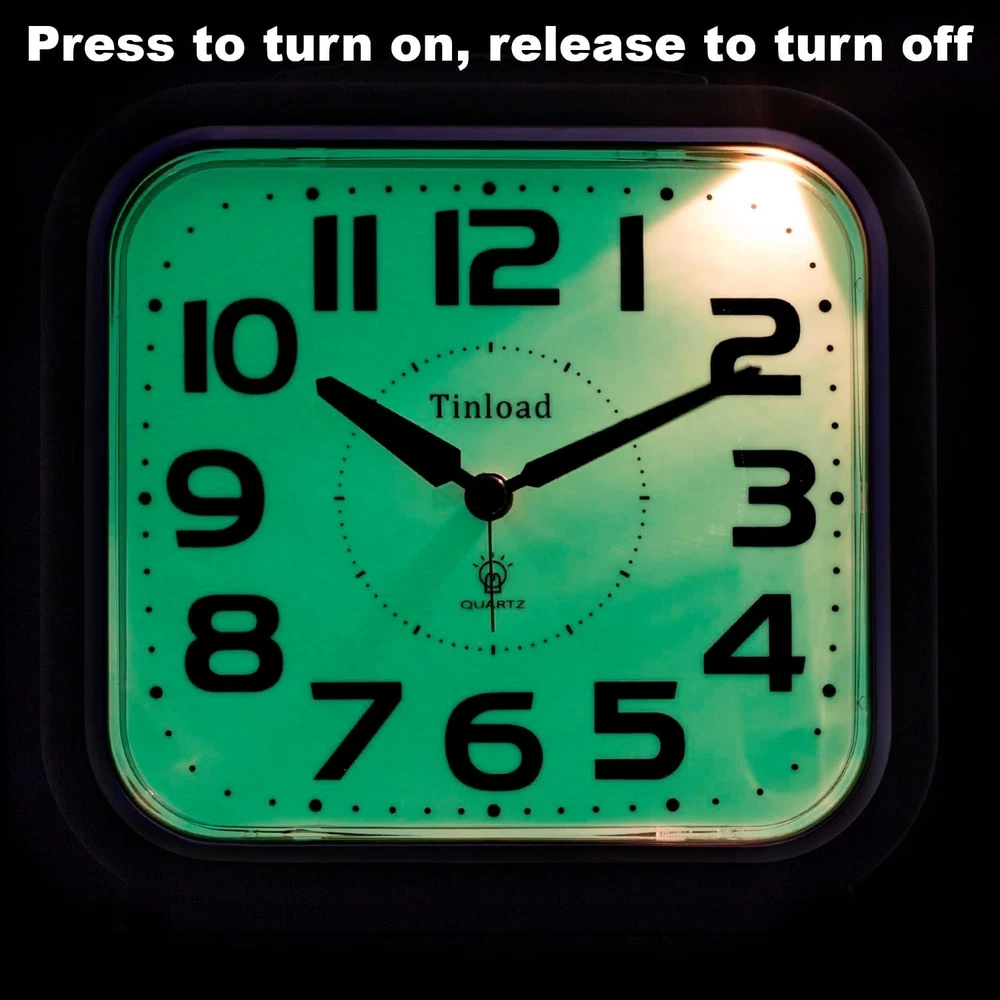 Glow in Dark dial --After just 10 minutes of sunlight exposure, the glow-in-the-dark feature stays active for 6 hours. The dial remains clearly visible for the first 1-2 hours, then gradually dims while maintaining enough illumination to help you locate the alarm clock in the dark - no fumbling required. Large Size-- Size: 5.5" x 5.5" x 2.2",runs on 1 "AA" Battery (not included). Alarm clock stands up at an angle, high quality plastic, square face with white dial, black Arabic numerals, good decoration for tabletop, desk & shelf, bedrooms. Also large size screen and clear bold digits to display time, perfect alarm clock for elderly. Completely Silent-- Super quiet concise design alarm clock without annoying tick tock sound, ideal for those who need complete silence to fall asleep. Snooze and Manual Light-- Snooze and light button locates on easy-to-find top place. Hold button down for 5 minutes snooze or to light up the clock face on demand to see the dial momentarily in the darkness. PRESS TO LIGHT- NO auto-light.