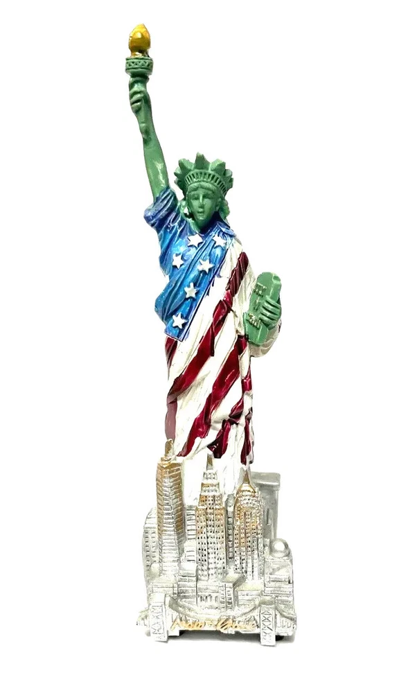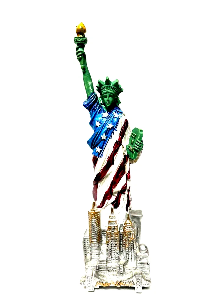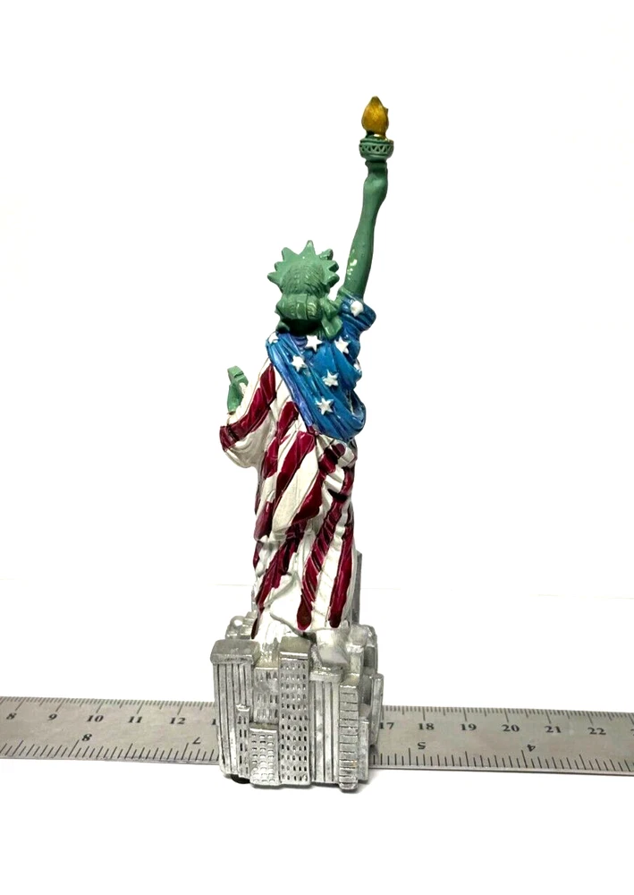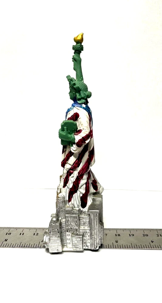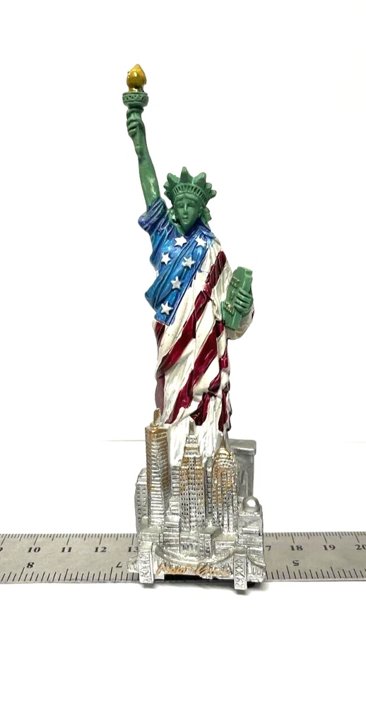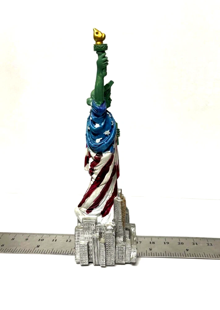 5.5" Statue of Liberty With Flag Replica, Figurine, Souvenir from New York City. 5.5 Inch Statue of Liberty with USA Flag. 5.5" high from base to top of torch. Thick molded poly resin construction. Ship out with Poly Bubble wrap. Great NYC Souvenirs gifts!!