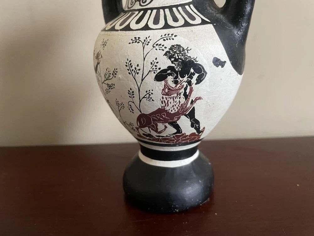 VASE HAS MINOR DAMAGE AND A SMALL CHIPPED PIECE. PLEASE CHECK PHOTOS!! This vintage vase is a beautiful piece of art hand-painted in Greece. Measuring 5.5 inches in length, it is the perfect size for display in any room. The multicolor design adds a touch of elegance to any decor. The vase is made in Greece, adding to its unique and authentic charm. It is a great addition to any collection, and its features include a hand-painted design. This vase is perfect for those who appreciate vintage art and want to add a touch of sophistication to their home.