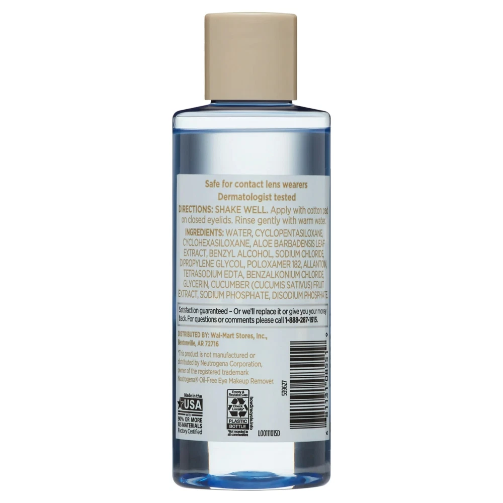 Treat your eyes with the care they deserve with Beauty Oil-Free Eye Makeup Remover. It provides gentle cleansing for your eyes with aloe and cucumber extracts to help soothe your skin. This eye makeup remover removes waterproof mascara, eyeliner, and eyeshadow, and is safe enough for individuals who wear contact lens, so you can use it worry-free. The gentle cleanser is oil-, fragrance-, and paraben-free and comes in an easy open/close bottle for your convenience. Remove your makeup in a gentle easy way with Beauty Oil-Free Eye Makeup Remover. Beauty understands that beauty isn't just skin deep. With a large selection of the latest beauty products Beauty helps you be your best you. Beauty Oil-Free Eye Makeup Remover, 5.5 Fl oz: Compare to Neutrogena Oil-Free Eye Makeup Remover Oil-free Removes waterproof mascara Gentle cleansing with aloe and cucumber extracts to help soothe your skin Fragrance and paraben free Safe for contact wearers Dermatologist tested info: