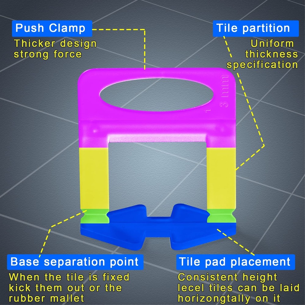 Products include: 5500-Piece Leveling Spacer Clips 1*Pcs 16 oz Rubber Mallet Product advantages: 1. When laying, prevent the tiles from moving and make the gap between the tiles even. 2. After laying, improve the flatness of the tiles and make them more beautiful! 3. Reduce the difficulty of construction, save the time of installation personnel, novices can practice. Tips: 1. Before placing the tiles, remember to erase some cement on the edges of the tiles. Don't fill the tiles with cement. After placing the clamp, this will prevent the cement from being wrapped in the clamp. Curing will affect the removal of the clamp. 【What You Get】:5500pcs 1/8 inch tile leveling spacer clips and 16 oz Rubber Mallet - Durable Eco-Friendly Rubber Hammer Tips.There are other tile leveling system kits in store looking forward to your purchase! 【What You Get】We offer 1-year warranty and lifetime service for a risk-free experience. If you have any questions, don't hesitate to contact us. 【16 oz -Hammer】:Double-sided solid rubber head,High-strength fiberglass handle core ,Outer polyethylene sheath protects handle core from mis-hits,Rubber handle so hands never loose 【Disposable Tile Clips】1/8"(3mm)Tile Clips Suitable for 1/8" (3mm) to 1/2"(12mm) thickness of the tile, allows for a 1/8"(3mm) minimum grout joint. 【Easy to Use and Efficient】: Novices can also use it easily. It will hold the tiles firmly and is very easy to install and remove. 4 Tile Clips and wedges are recommended for one tile; 6 or 8 tile spacers and wedges are recommended for larger tiles.【24 Hours】: Note, After waiting 24 hours, kick or use a rubber mallet to remove the clips of the tile leveler. Wedges are reusable! 【High QualityTile Leveling System Wedges】tile leveler Clips adopt a brand new PVC material.Wear-resistant and compressive, high bearing capacity, not easy to break【Suitable for all tile types】 :Very suitable for floor/wall tile installation, can be used for leveling all tile types, such as porcelain, ceramic, marble, and all-natural stone.
