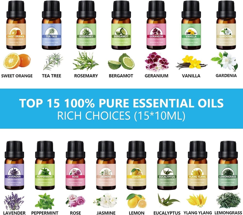 【Multifunctional Essential Oil Diffusers】❤ You'll get one 550ml large capacity essential oil diffusers with 15 bottles Natural essential oils, and equipped remote. Our essential oil diffuser can be used as an aromatherapy essential oil diffuser/night light. Uses Ultrasonic technology to atomize, It also includes a convenient auto shut-off feature. 【Easy to Use & Simple to Operater】❤ Drop essential oils into aromatherapy diffuser, you can easily set up time, mist and light by this remote control .You can have 15 light modes, 7 colors of ambient light (Dark/bright) & auto- color cycle, 2 fog intensity settings, 4 timer settings (1H/3H/6H/ON), all of which can be done in a matter of seconds. 【Ultra Quiet Design Diffuser】❤ Deep sleep, run steady and noiselessly . Our diffusers for essential oils large room work noise low than 30 dB, help you and your child sleep better, let your family enjoy a quiet fragrance. 【15 Essential Plant Oils】❤ TOP 15 natural essential oils. The dark bottle will help keep the oils fresh and also guard against light degradation. No harsh ingredients, No additives, NO fillers. We value safety, quality in offering the high quality aroma oil products. There is an essential oil instruction manual in the packaging box for you to use these 15 natural essential oils. 【Superior Safety】❤ Our oil diffuser run for 15 hours. Fresh and humid air. Easy to clean, does not contain bisphenol A. When the time is up or the water is out, the diffuser will automatically close. This means that it is safer for us, especially for children. Multi-functional Essential oil humidifier be built for family life. Your perfect gift.