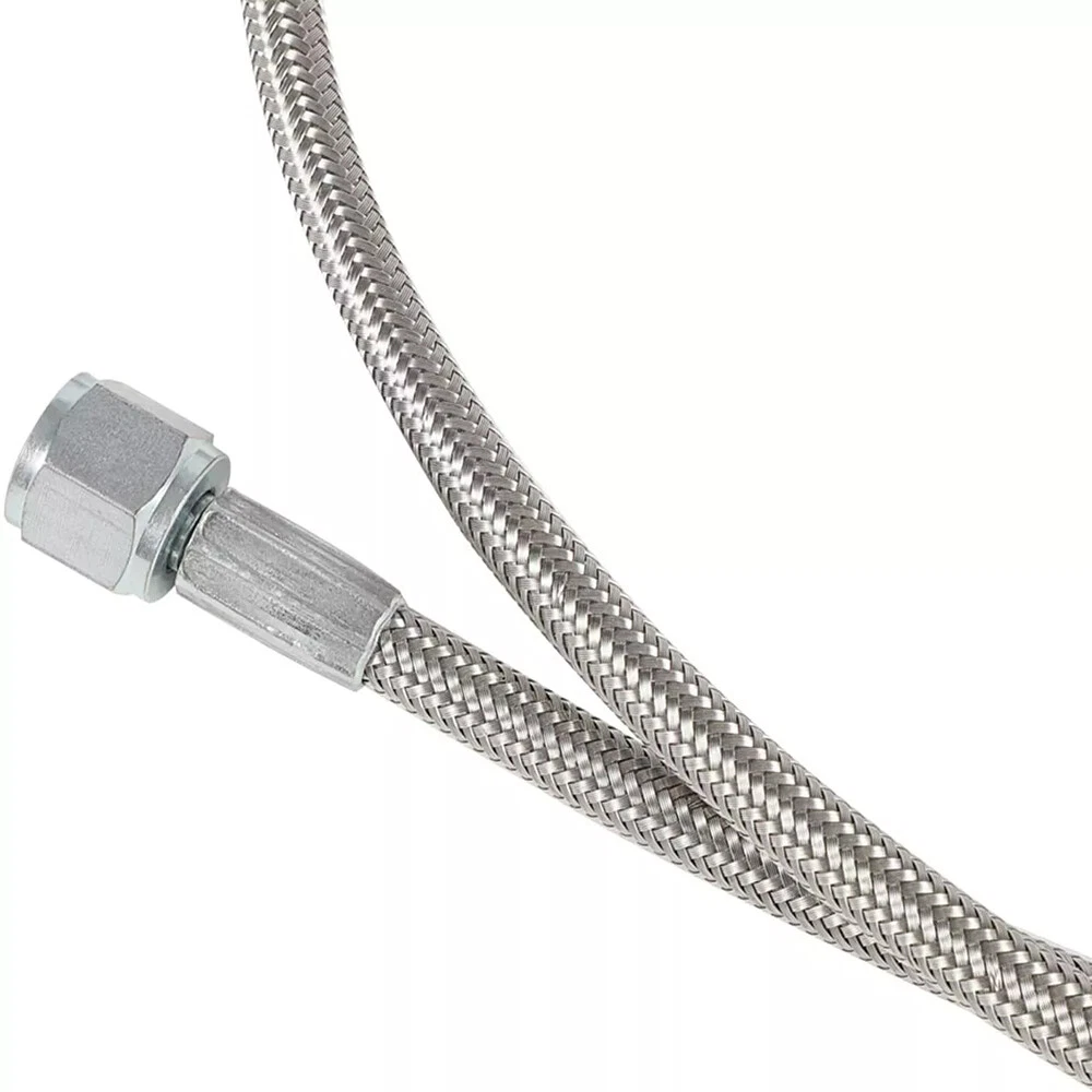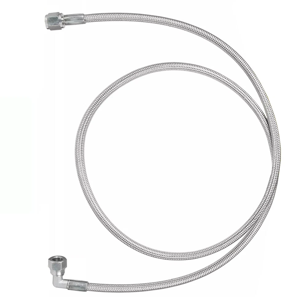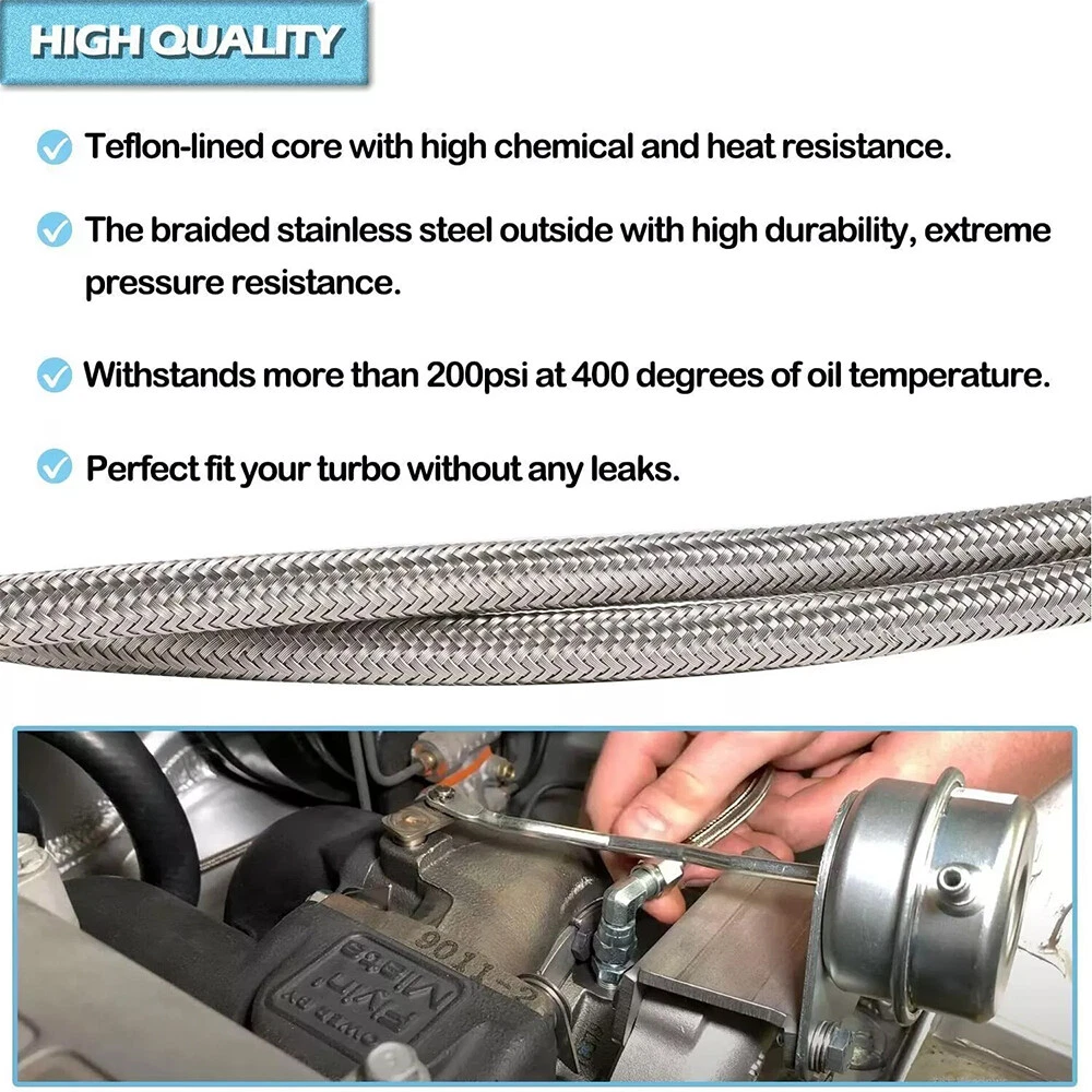 Function This steel braided turbo oil feed line connects your turbo chargers oil gallery to the engine, it drains the oil away from the bearings inside the turbo charger. Features This line is 60 inches length, and the hose end is 4AN(0.4375” OD., comes with 1 Straight End and 1 90 Degree End. Material We choose best quality materials to ensure top quality, Teflon lined core with heavy-duty stainless steel braided jacket wrapped on line, top quality stainless steel made hose ends. Performance The premium materials ensure the oil feed line could withstand more than 200psi at 400 degree Oil Temperature. Function: Premium grade hose offers a seamless transfer of lubricant to and from the engine's turbocharger; Prevents blown oil seal effectively caused by excessive oil pressure. Manufactured to OEM specification, meet or even exceed OEM standard in function, performance and quality. This 4AN hose transport oil to the turbocharger as the oil simultaneously cools and lubricates the moving parts, preventing the turbo's internals from overheating and subsequently failing and effectively preventing blown oil seal caused by excessive oil pressure. Fitment: 4AN hose ends are with 1 straight end and 1 90 degrees end with swivel fittings for an easy install. This 4AN 90 degree straight hose withstands more than 200psi at 400 degrees of oil temperature. Braided Stainless Steel Lines are specially designed to work in any automotive project Features: 1. This steel braided turbo oil feed line connects your turbo chargers oil gallery to the engine, it drains the oil away from the bearings inside the turbo charger 2. This line is 60 inches length, and the hose end is 4AN(0.4375” OD., comes with 1 Straight End and 1 90 Degree End 3. The premium materials ensure the oil feed line could withstand more than 200psi at 400 degree Oil Temperature 4. We choose best quality materials to ensure top quality, Teflon lined core with heavy-duty stainless steel braided jacket wrapped on line, top quality stainless steel made hose ends Package included: 4AN hose ends are with 1 straight end and 1 90 degrees end with swivel fittings