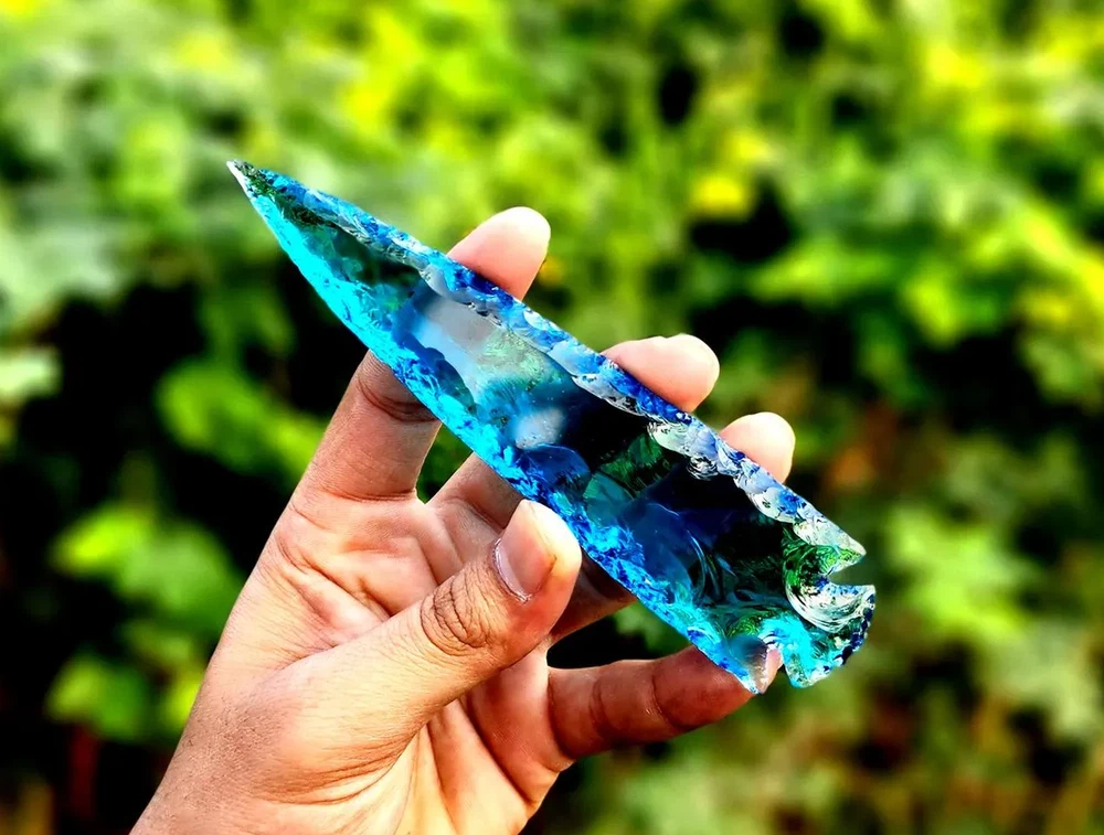 Description: Rare Blue Aqua Obsidian Arrowhead – A Stunning Handmade Crystal Masterpiece Discover the beauty and rarity of this 5.5-6" Blue Aqua Obsidian Crystal Arrowhead. Skillfully hand-carved, this gemstone combines elegance and craftsmanship, making it a perfect choice for crystal enthusiasts, artisans, and collectors. Its shimmering aqua hues and sleek arrowhead design make it ideal for display, energy healing, or as a unique and thoughtful gift. Product Features: Premium Blue Aqua Obsidian: A rare and mesmerizing gemstone with calming energy and captivating color. Handmade Arrowhead Design: Each piece is meticulously crafted for a unique and flawless finish. Versatile Usage: Suitable for jewelry making, home décor, or spiritual practices. Healing Properties: Believed to enhance clarity, emotional balance, and spiritual growth. Perfect Gift: A one-of-a-kind present for special occasions, crystal lovers, or artisan crafters. Why Choose This Blue Aqua Obsidian Arrowhead? This arrowhead showcases a rare gemstone paired with intricate craftsmanship, blending aesthetic appeal and metaphysical properties. Whether for personal use or gifting, it’s a piece that stands out in any collection. Suggested Uses: Jewelry Making: Transform it into a striking pendant or focal piece for custom accessories. Energy Healing: Use it as a tool for meditation, chakra alignment, or emotional healing. Decorative Accent: Add an ethereal touch to your home or altar space. Gift Idea: An unforgettable and meaningful gift for crystal enthusiasts or spiritual practitioners.