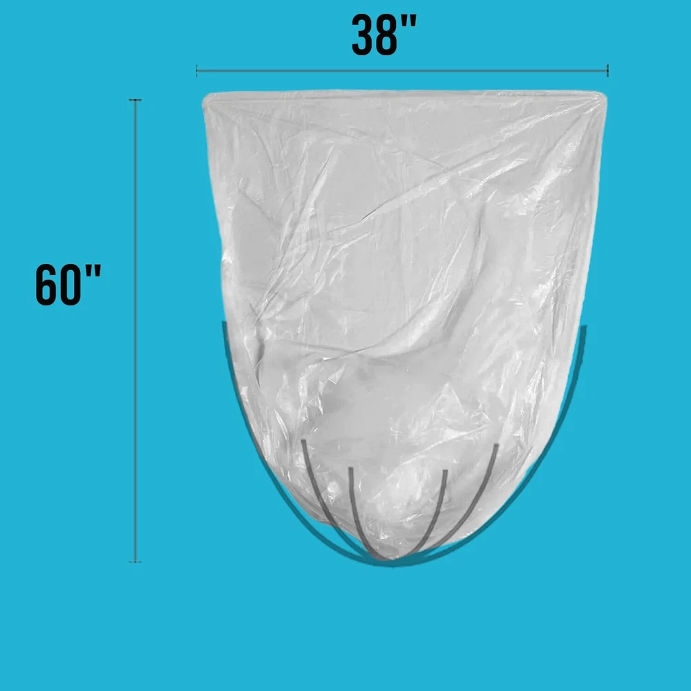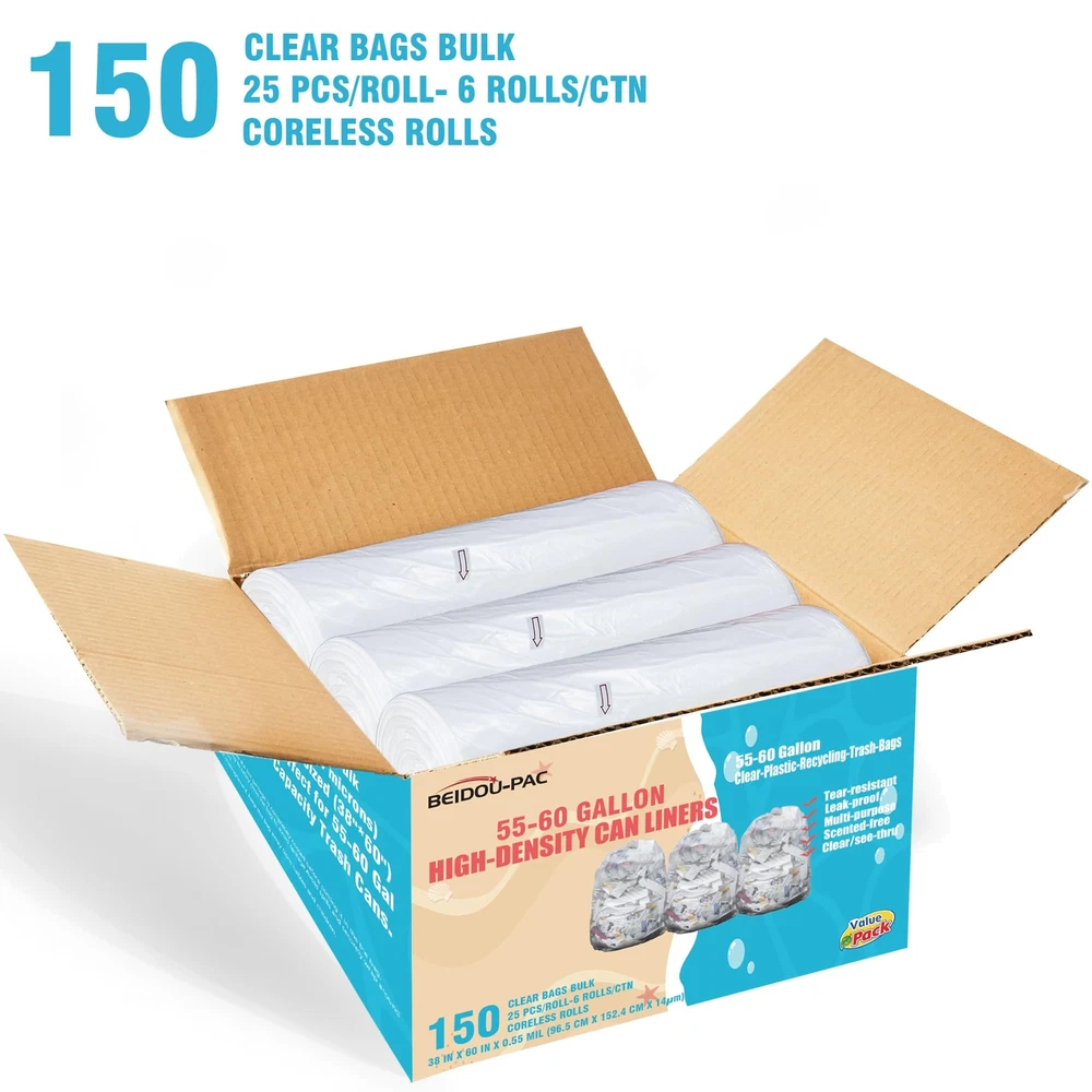 55-60 Gallon-Clear-Plastic-Recycling-Trash-Bag 1, Product information: 55-60 gallon large clear plastic recyclable garbage bags, Size: 38"* 60"x 14 mic, Total 150 clear bags bulk (25 PCS/ROLL , 6 CORELESS ROLLS/CTN), Perfect for 55-60 Gal Capacity Office, commercial, industrial or residential waste. 2, High-density polyethylene film, sturdy and durable,Unscented, Hygienic and Safe. 3, High quality customized garbage bags design, Star seal at the bottom can increase the load carrying capacity, leak-proof trash bin liners does not break or tear easily. 4, Open simply and easily, Coreless rolls in dispenser box for easy use and neat storage, easy to pull apart and easy to open.It can also be used as a gift wrapping. 5, Smart Ideas for Your Home, Commercial, Industrial:This Clear bag is great for use in various settings such as home, kitchen, outdoor industrial garbage can liner for custodians, landscapers, lawn bags, outdoor bins and more. see through bags bulk value pack, With our bulk options, you'll have plenty of bags for months to come.