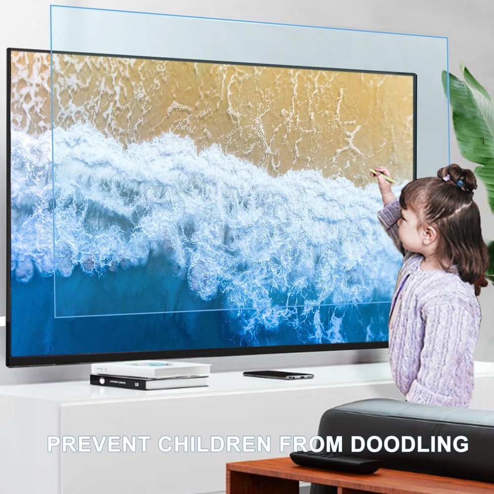 Ultra Clear Screen Protector - matte Blue light screen protector for monitor blocks 85% of the harmful wave length of blue light between 380nm~480nm and also blocks 100% of UV light. TV Matte Protective Film Material: Matte PET High Quality Materials Features: Anti-reflective / Anti-radiation / Anti-myopia, Etc Applicable products: TV monitor screen protector Size: 55-75Inch Please allow the protector size with a tiny difference Features: Ultra Clear/Filter out Blue Light/Anti-Glare/Protect eyesight. Scratch coating that protect your TV from Child and Pets. Guarantee Bubble Free Installation. Easy to apply and remove. Package includes: 1x TV Screen Protector Blue light filtering technology: TV screen protector blocks harmful blue light between 380nm-495nm and provides 100% UV protection. The blue - light blocking helps reduce eye strain, Protect your eyes. High light transmittance does not affect the picture quality: The TV screen film high-definition transparent material is used to protect the screen while not affecting the picture quality of the TV, without affecting the original appearance design of the TV, simple and beautiful. Matte anti-reflective surface: The matte material design not only reduces screen reflection and glare, but also effectively prevents fingerprint residue and scratches, keeps the screen clean and tidy, and extends the service life. Multiple sizes available: A variety of specifications and sizes are available for 55-75inches, which can be selected according to the size of the TV to ensure the best fit. Please measure the screen size before purchase to get a perfect fit. Note: For outdoor use, the TV screen protector has specific guidelines. It must be used under the eaves or in a shaded area. Indoor and outdoor use should also avoid direct sunlight on the screen, and after installation, adjusting the screen brightness to the highest.