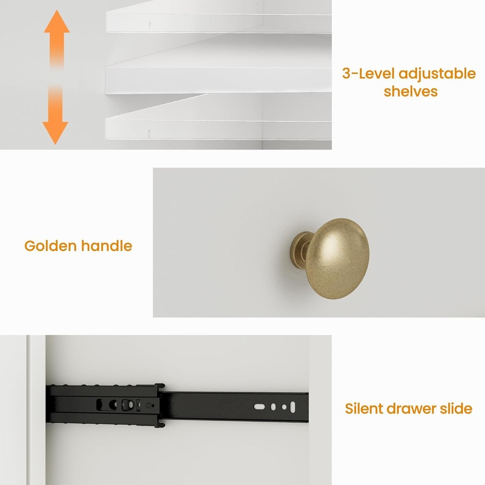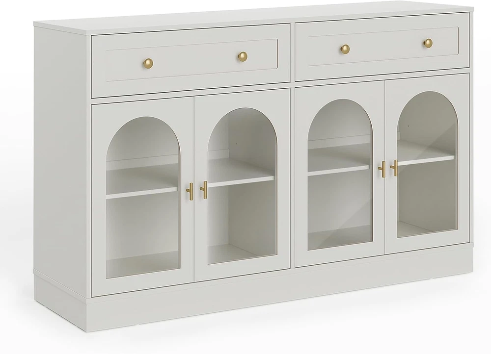 Product Description About this item Ample Storage Space: Two extra-large, spacious drawers provide easy storage for snacks and favorite items. The cabinet features three adjustable shelves to accommodate items of varying heights, while the wide tabletop offers plenty of space for small appliances like coffee machines or decorative items such as vases. Stylish Charm & Slient Design: The vintage white painted finish paired with antique golden metal handles and the unique arched transparent acrylic doors exude retro charm! The soft-close door design minimizes noise during use, making it perfect for quiet spaces and reducing impact damage. Combining practicality and style, it seamlessly enhances any home decor. High-quality Materials: Crafted from high-quality MDF, this sideboard cabinet is built to be sturdy and stable. It has passed strict TSCA and EPA standards, ensuring safety and reliability. The sustainable materials not only offer a smooth finish but are also durable, easy to clean, and maintain—designed for long-lasting use. Versatile Use: This accent cabinet boasts a unique style that fits seamlessly into any space, helping you stay organized and clutter-free. The sideboard is not only suitable as a coffee bar cabinet in your kitchen or dining room but also as a console table for your living room or home office. It's the ideal addition to enhance your home decor! Easy Assembly: Includes clear installation instructions and all necessary accessories, including anti-tip hardware for added stability. Assembling this buffet cabinet is a breeze. Enjoy professional customer service before and after your purchase—reach out anytime, and we’ll resolve any issues within 24 hours.