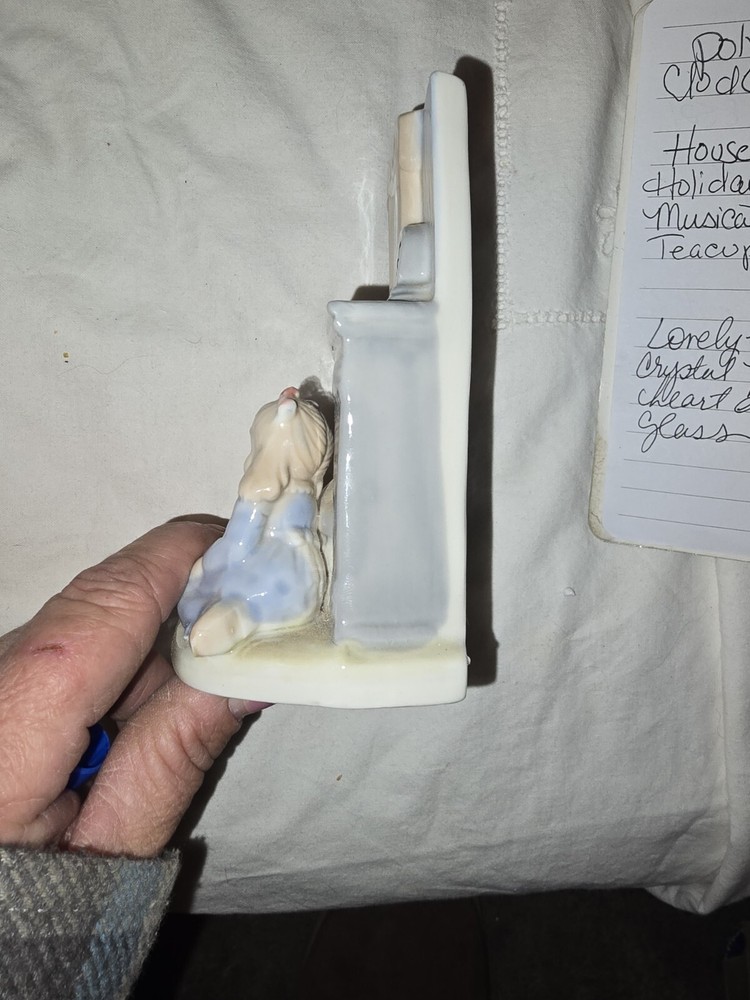 This vintage porcelain figurine depicts a girl sitting in front of a fireplace, measuring 5.5 inches in length. The delicate and intricate details of the piece make it a perfect addition to any collection of decorative collectibles. Made of high-quality porcelain, the figurine is a great representation of the girl's character and charm. The item is ideal for collectors who appreciate vintage porcelain pieces and would like to add this lovely figurine to their collection.