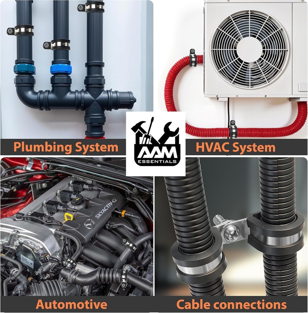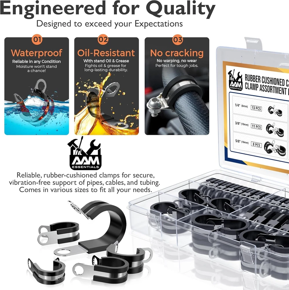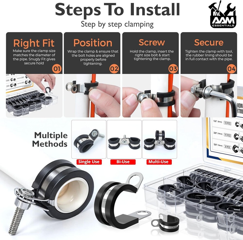 55 pcs cable clamps-304 Stainless Steel-Rubber Cushion Wire clamps-6 sizes 1/4" 5/16" 3/8" 1/2" 5/8" 3/4"-Assortment kit for pipe & wire mounting. Product Details Manufacturer: AAM ESSENTIALS Item Weight: 1.01 pounds Package Dimensions: 9.65 x 7.91 x 1.54 inches Country of Origin: China Item model number: CC_55PCS Material: Stainless Steel Item Package Quantity: 55 Included Components: Clamps Batteries Included?: No Batteries Required?: No Material: Stainless Steel Brand: AAM ESSENTIALS Tensile Strength: 1000 PSI Manufacturer: AAM ESSENTIALS Corrosion Resistance: 304 stainless steel cable clamp that Stands up to rust and moisture for outdoor applications. Easy to adjust or modify the clamps to fit specific needs without compromising the strength. Bright, polished surface gives aesthetic appeal over the time. All Sizes+3 Extras: We understand the need. Rubber clamp assortment kit include 6 size options (12pcs) 1/4”- (10pcs) 5/16"-(10pcs) 3/8"-(8pcs) 1/2”- (8pcs) 5/8"-(4pcs) 3/4"- Total count 52pcs + 3pcs extra Non-Slip Grip: The rubber lining of wire cable clamps provides a secure hold even while under heat or pressure variations. This provides extra safety helps in reducing noise caused by vibration. Rubber cushion prevents direct contact between clamp & wire provide protective insulation. Fast Clamping: Installing a wire clamps for cables is quick & effortless. Simply set the clamp, align the holes, secure with screws. This basic setup saves both time and effort. Concise portable box with size detail chart provides greater convenience. Heavy-Duty-Clamps: Automotive, HVAC, plumbing, electrical, marine, and industrial applications all benefit from its wide usage. These Rubber clamps are essential for organizing and supporting systems. Durable solution for both residential and commercial needs.
