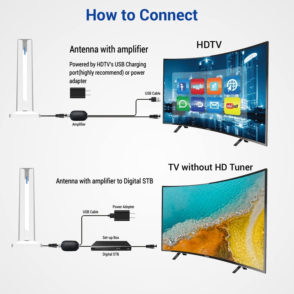 💯👍【Full Free HDTV Channels】 Without the need for hefty TV bills. Access news, sitcoms, kids' shows, and sports programs, including ABC, CBS, NBC, CNN, Fox, Univision, and more , using this amplified HD digital TV antenna on any digital-ready TV. 💯👍【Up to 6000 Miles Range 】 Equipped with an advanced Smart IC Chip and powerful signal booster, these HDTV antennas offer a range of up to 6000 miles . 💯👍【16.4FT Reinforced】 Coaxial cable is composed of a solid center conductor, dielectric insulation, three aluminum shielding layers, and a durable outer layer, bringing superior HD reception and powerful signal reliability . 💯👍【Easy to Install】 Just connect to the AN/IN ports of the HDTV or set-top box, and power the antennae by plugging the USB connector into a charging port on the HDTV or into an outlet with a power adapter. 💯👍【Support Outdoor & Indoor】 The digital antenna not only supports indoor and outdoor use but also can be used in bad weather. It is not affected by thunderstorms. Product Specification Type Indoor TV Antenna Color white V.S.W.R ≤2.0 Gain 25dBi Bandwidth 70MHz Power Capacity 50w Cable Length 5m/16.4FT Input Impendence 75Ω Polarization Type Vertical Working Temp -40~85 ℃ Connect Type IEC Male/F Male Frequency Range (MHz) VHF174-230 UHF470- 862 Package Included 🎁1 x TV Antenna 🎁1 x Using Manual