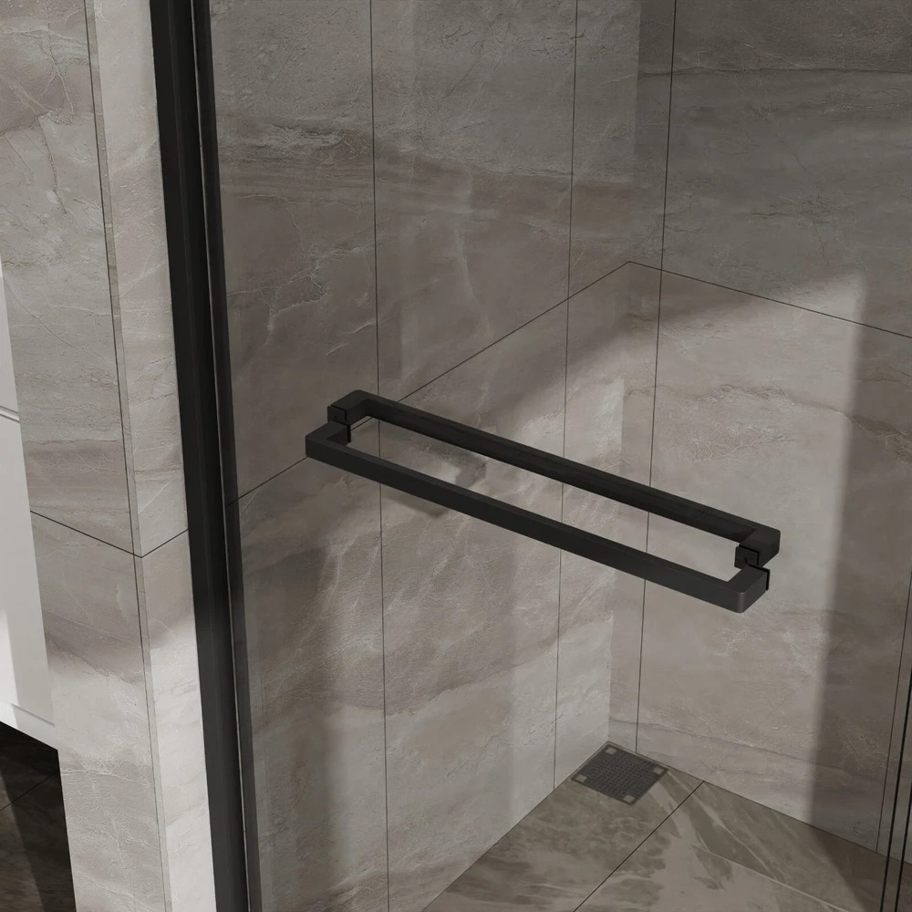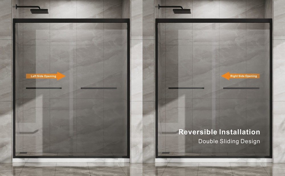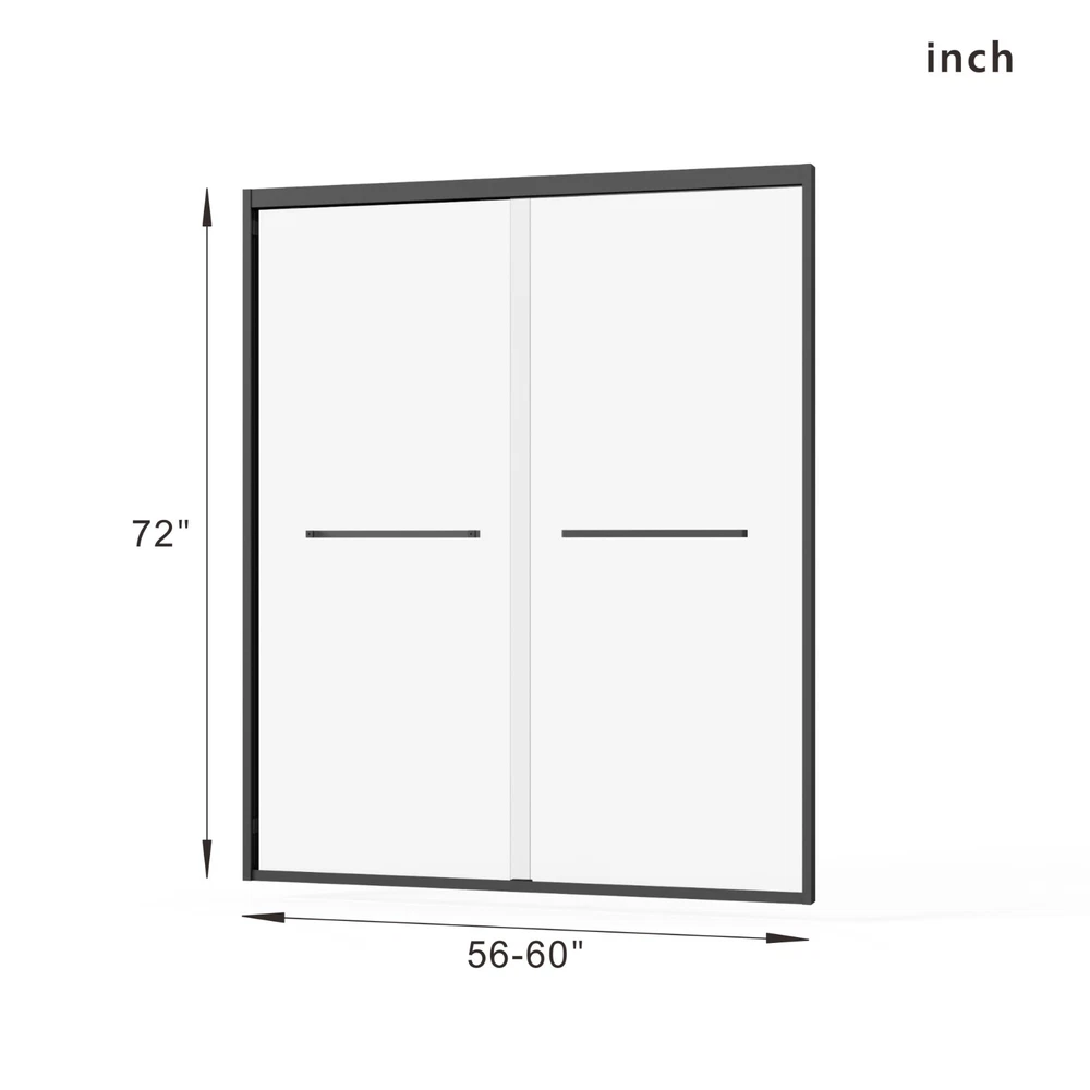 (56-60)x72" Double Sliding Glass Shower Door, Matte Black, 6mm Tempered Glass Product Features · Premium Construction & Safety - Crafted from 1/4" (6mm) SGCC clear tempered glass, this sliding shower door ensures exceptional durability and safety. The glass is reinforced with an explosion-proof coating to prevent shattering, providing a safe and clear view for years. · Perfect Dimensions for Your Bathroom - Designed to fit standard shower spaces, the door measures 60" in width and 72" in height, offering a spacious and convenient showering area. The reversible sliding design allows installation with either left or right door opening, making it adaptable to your bathroom layout. · Advanced Waterproof & Anti-Splash Design - Engineered with a splash-proof threshold and professional-grade waterproof sealing strips, this door effectively keeps your bathroom floor dry by preventing water leakage and splashing, ensuring your bathroom stays clean and dry · Durable & Smooth Sliding Operation - Featuring a sturdy aluminum alloy frame and high-quality stainless steel rollers, the door slides smoothly and quietly. The corrosion-resistant materials ensure long-lasting durability, offering a premium feel and reliable performance. · Easy Installation & Comprehensive Instructions - Installation is a breeze with all necessary hardware and a detailed step-by-step guide included. The door’s reversible sliding function and customizable setup make it easy to fit your space, whether you prefer a left or right-opening design. Description Using 6mm tempered glass Double swing design he advantages of using 6mm tempered glass in shower enclosures include: High Strength: Tempered glass is 4-5 times stronger than regular glass of th The shower doors feature a left-right double swing design (or dual-direction opening), offering enhanced convenience and flexibility. This allows users to open the door in either direction, adapting to bathroom layouts, saving space, and ensuring effortless entry/exit. Its user-friendly mechanism is ideal for compact spaces or accessibility needs.