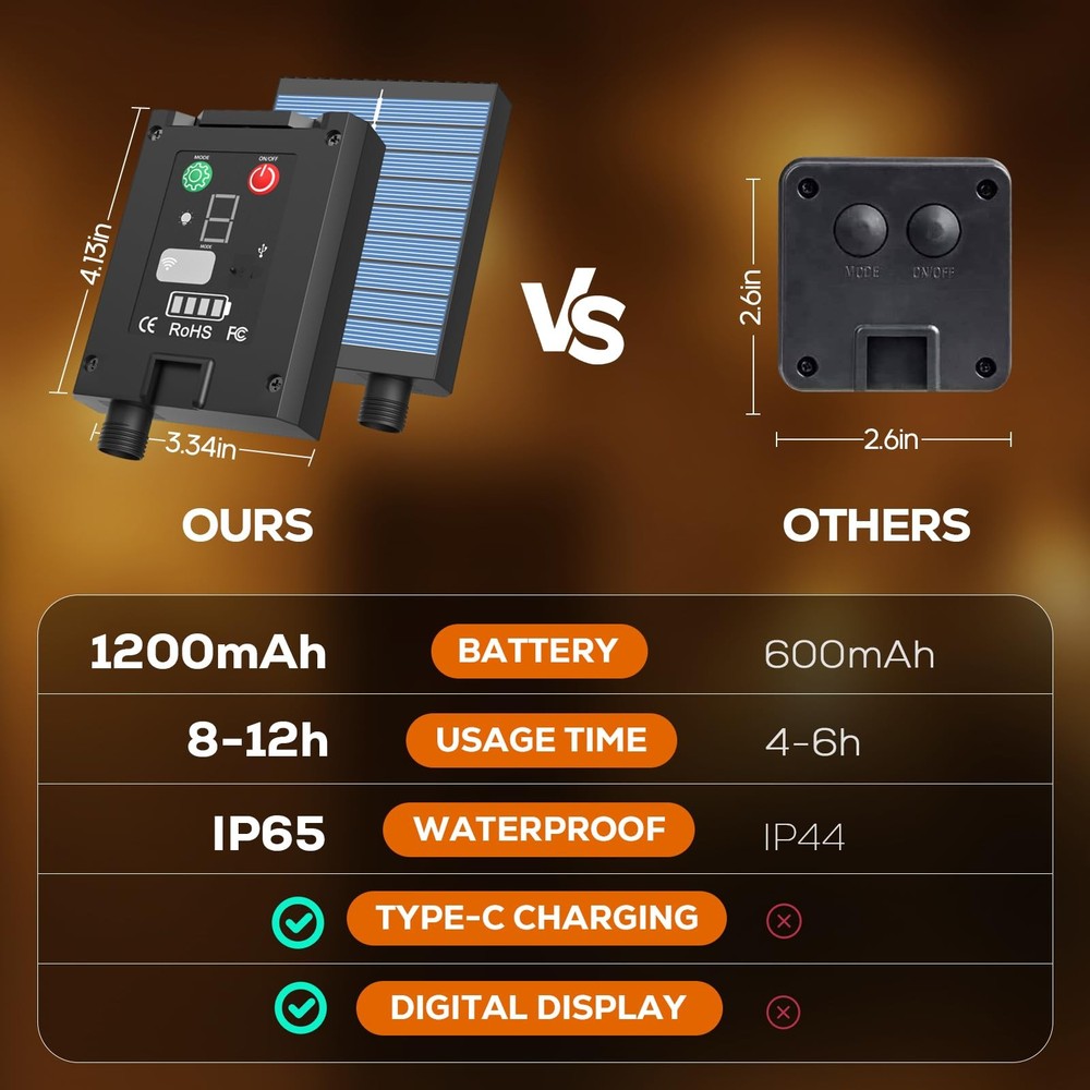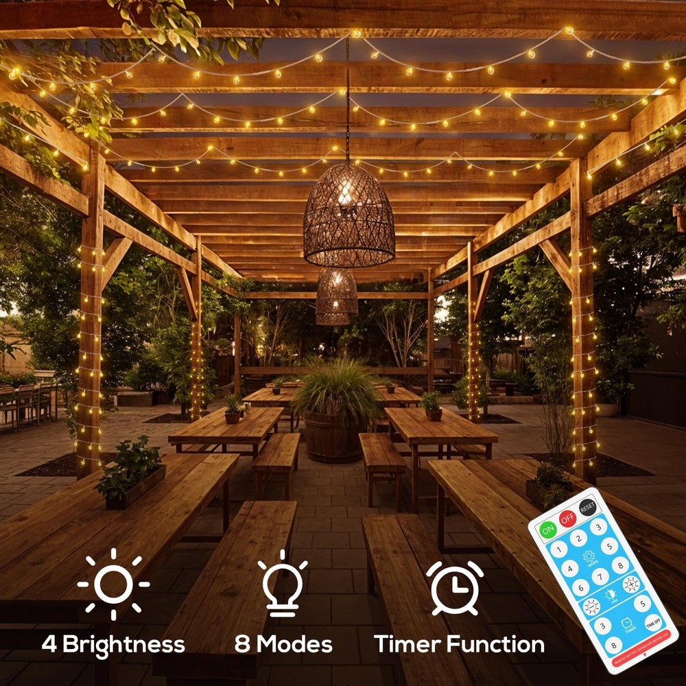 These solar string lights are fantastic! The 1200mAh battery keeps them glowing all night, and the USB-C charging option is super handy. Love the 8 lighting modes and memory function—no need to reset every time. The remote makes it easy to switch settings, and the IP65 rating means they handle rain like a champ. Perfect for patios, gardens, or any outdoor space—bright, durable, and hassle-free!