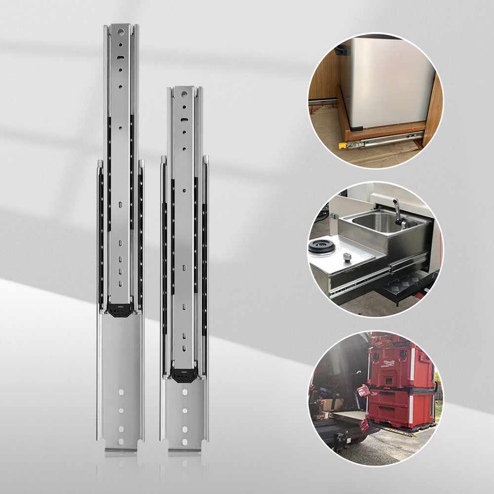 Specification Style: Simple, Modern Material: Cold Rolled Steel Q235 Color: Silver Quantity: 2 Surface Treatment: Galvanized Finish Load-Bearing Capacity: 226.8kg/500lbs Slide Length: 142.24cm/56in Slide Width: 7.6cm/3in Package Size: 145*18*6cm/57.09*7.09*2.36in Gross Weight: 14kg/30.11lbs Package Included 1 Pair of Heavy-Duty Drawer Slides 56 Inch Heavy-Duty Drawer Slides Galvanized Finish Surface Treatment Silver New Installation Steps. 1. Find Two Horizontal Lines in the Installation Position on Both Sides of the Cabinet, and Fix the Outer Fixed Slides to the Horizontal Lines on Both Sides with Screws; (Note: the Positioning of Both Sides Must Be Parallel). 2. Completely Pull the Slide Rail, and Fix the Drawer to the Inner Fixed Rail with Screws According to the Horizontal Line. 3. the Installation Is Finished. Specification Style: Simple, Modern Material: Cold Rolled Steel Q235 Color: Silver Quantity: 2 Surface Treatment: Galvanized Finish Load-bearing Capacity: 226.8kg/500lbs Slide Length: 142.24cm/56in Slide Width: 7.6cm/3in Package Size: 145*18*6cm/57.09*7.09*2.36in Gross Weight: 14kg/30.11lbs Package Included 1 Pair of Heavy-duty Drawer Slides Notes Please Note That in Order to Ensure the Safety of Users, the Heavy-duty Slide Rails Cannot Be Disassembled. Please Note That Screws Are Not Included in the Package, You Need to Purchase Your Own M4 and M6 Half-round Head Screws. Please Note That the Installation Gap on Both Sides Should Be More than 20mm/0.79in. Please Allow the Slight Color Difference Caused by the Shooting Light and 1-3 Cm Error Due to Manual Measurement, and Make Sure You Do Not Mind Before Ordering. Payment Delivery details Terms of sales About us Contact us Payment We accept ebay payment 。 Fees such as import duties, taxes are not included in the item price or shipping costs. These charges are the buyer's responsibility. Delivery details Shipping: 2-9 working days to: USA Terms of sales We maintain high standards of excellence and strive for hundred percent customer satisfaction. Feedback is very important to us. We hope that you contact us immediately before you give neutral or negative feedback, so that we can address your concerns. It is impossible to address issues if we do not know about them! About us Your satis faction is our ultimate goal. We work hard to earn your trust and future business. Our certified technicians have tested each item before shipping. The unit comes with 1 year limited warranty on all manufacturing defects. a) If you receive a defective item, you may return it or ask for a discount. Please contact us within 14 days after you receive the package. b) What you returned must be intact and in its original packaging as re? u. Customer is responsible for shipping costs of the returned item. c) We will cover the cost of shipping back t with the shipping rate indicated in the registration page. We will send you a new unit or refund the full payment you paid. Thank you. Contact us Business Hour Business Hour: Monday To Friday: 8:30 AM to 5:00 PM (Beijing China time) Due to time zones, our reply to your questions may not be immediately. But within above working time, we will reply your email within 24 hours. If it's non-workdays, please kindly be patient and wait till Monday. Please contact us with ebay message. Please feel free to contact us if you have any questions. Monday To Friday: 8:30 AM to 5:00 PM (Beijing China time) Due to time zones, our reply to your questions may not be immediately. But within above working time, we will reply your email within 24 hours. If it's non-workdays, please kindly be patient and wait till Monday. Please contact us with ebay message. Please feel free to contact us if you have any questions. Features Fast sjipping, High-quality Material, 3 years warranty Warranty Three years Highlights Easy installation, Fast shipping, High quality Manufacturer Warranty 3 Years Country/Region of Manufacture Unknown Brand Unbranded Type Ball Bearing Style Modern Material Cold Rolled Steel Q235 Color Silver Quantity 3 Surface Treatment Galvanized Finish Load-Bearing Capacity 226.8kg/500lbs Item Width 7.6cm/3in Item Length 142.24cm/56in Package Size 145*18*6cm/57.09*7.09*2.36in Gross Weight 14kg/30.11lbs UPC Does not apply
