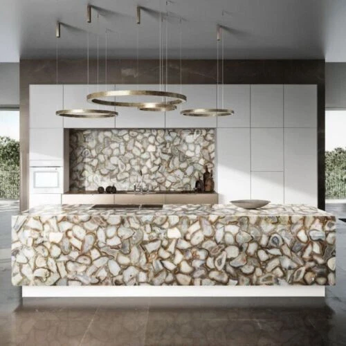Welcome To Unique-Handicrafts Shop Description Very unique Art by Indian Artist ,Coffee/Side Table top Used Material: Natural Agate Stones Arts Size: 56"x24" inch Color: As Photo Shape: Rectangle Pattern: Handmade Room: Bedroom, Dining Room, Hallway, Home Office/Study, Kid’s Bedroom, Kitchen, Laundry/Utility Room, Living Room,Patio, Playroom Packaging: Wood & Foam Export Packing Shipping: Air Can Be customize ,Please Message us your desired Size 1. It can be used as a Dining Table, Guest table, coffee table, center table top in show room as well as a gift for your loved ones. 2. The table top is made in Agra India & fully handmade. 3. The top will be delivered by FedEx or DHL free of cost door to door. 4. If there is any local tax,custom duties or Vat will be paid by the buyer at the destination. 5. The parcel is dispatch with proper packing & fully insured covering all kind of risk. 6. To maintain the table top is simple soap & water & dry cotton cloth. 7. If You Are Looking Something Customize, Let Us Know We Will Make For You As Per Your Design, Size & Shape. 8.Table top does not includes any wooden, marble stand or base if you like to buy marble or wooden base or stand that will be charged extra. Marble Agate Table Tops We are Manufacturer & Exporter of marble agate table tops. These marble agate table tops have different shapes like Round Table top, Octagonal Table Tops, Rectangle / Dining table tops, Square Table tops, Chess Table tops, Taj Mahal Table tops, Custom Designs Table tops also make marble Table top Base and Stand. Then we can be used as dining tables, coffee tables, Center tables, conference tables, chess boards, reading tables, bar tables , Garden table, side and corner tables or any other use as per the indoor and outdoor decor. They can also be placed outdoors in the garden, as marble is stain free, offers great resistance to the forces of nature, and can withstand heavy temperatures. We also meet customized requirement and offer our marble table tops at industry leading prices. About Agate Stone- Agate is a rock consisting primarily of cryptocrystalline silica, chiefly chalcedony, alternating with microgranular quartz. It is characterized by its fineness of grain and variety of color. Although agates may be found in various kinds of host rock, they are classically associated with volcanic rocks and can be common in certain metamorphic rocks. Ancient use of agate stone Agate is one of the most common materials used in the art of hardstone carving, and has been recovered at a number of ancient sites, indicating its widespread use in the ancient world; for example, archaeological recovery at the Knossos site on Crete illustrates its role in Bronze Age Minoan culture. Types Of Agate 1. Fortification Agate This is the most common and distinctive type of agate. In these agates, bands crystallized into concentric layers that more or less follow the shape of the cavity. The banding resembles an aerial view of a fort 2. Water-Line Agate (also called water-level or onyx) During its formation, silica-rich solution either entered the cavity slowly laying one band at a time, excess water drained out leaving a small amount of silica to settle out into separate bands, or the vesicle filled under low pressure. In any case, the silica crystallization in water-level agates is controlled by gravity in one orientation, forming a stack up of parallel bands. 3. Shadow Agate Some agates exhibit a shadow effect in which there is what appears to be movement across the agate layers when the specimen is rocked back and forth (or your orientation to the specimen moves). This optical effect only occurs when there are alternating translucent and opaque bands. It is caused when light goes into the agate, but is not reflected out. 4. Tube Agate Tube Agate During the formation of some agates, parallel projections of tiny hair-thin mineral rods grow first within the silica gel, around which later the chalcedony agate micro-crystals form. In some cases the inclusions remain, but sometimes they weather away leaving hollow tubes that subsequently fill in with silica. 5. Eye Agates This mysterious agate characteristic is believed to be formed when most of the silica gel drains from the cavity, leaving only a droplet that “beads up” on the inside wall of the cavity. This droplet crystallizes into solid chalcedony “eyes”. In some cases, crystal growth will continue from this droplet in a manner similar to the formation of stalactites in caves. Later, the pocket fills in with the usual deposition of chalcedony microcrystals. 6. Plume Agate These agates initially had formations on their outside layer that formed prior to the deposition of chalcedony bands. They are filament growths of mineral inclusions that resemble ferns or feathers. 7. Geode Agate Geode Agate In some cases the supply of silica-rich water runs out before the entire cavity fills in. When there is a hollow center within a crystalline outer fill, the specimen is considered a geode. Not all geodes have agate banding, but many do. Also, the inner layers can form into several different types of silica mineral crystals and may even have other types of mineral crystals. 8. Moss Agate Moss Agate Moss agates have clusters of mineral inclusions that resemble plants, trees, or landscapes. Most moss agate inclusions are comprised of iron or manganese oxide. In some cases, the inclusions inhibit chalcedony banding allowing the mineral clusters free reign to grow within the silica gel. 9. Seam Agate Seam agates for in cracks within host rock, rather than in rounder pockets. The bands form in parallel rows that follow and fill in the crack or seam.