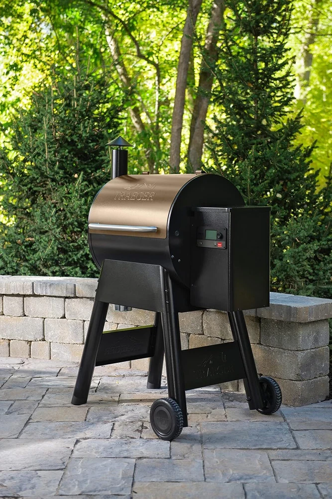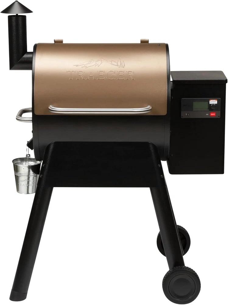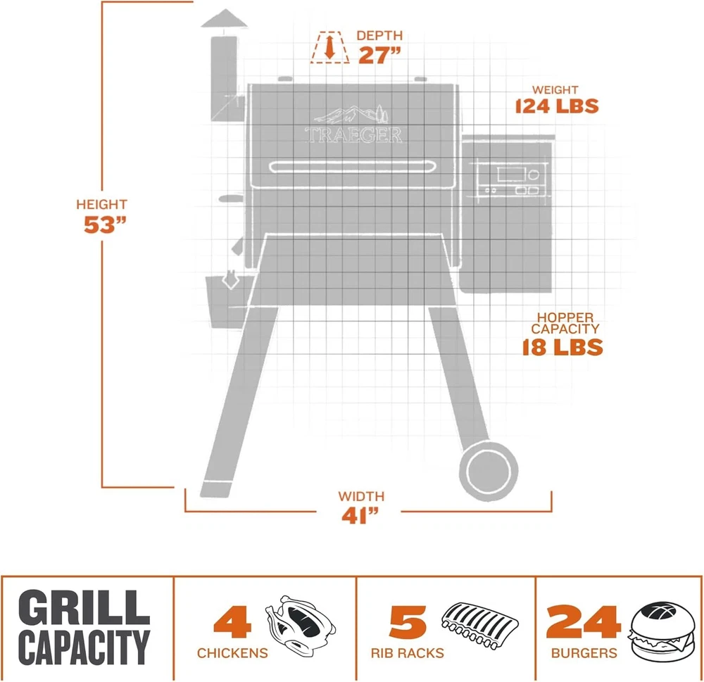 About this item NEVER USE GAS OR CHARCOAL AGAIN: Traeger created the original wood-pellet grill as the ultimate way to achieve wood-fired taste; The Pro 575 takes it to the next level with precise temperature control. 500 °F Max Temp WIFIRE TECHNOLOGY: WiFIRE technology connects your grill to home WiFi and the Traeger app allows the user to control the grill from anywhere. VERSATILE BARBECUE COOKING: The Pro 575 pellet grill offers 6-in-1 versatility to grill, smoke, bake, roast, braise, and BBQ all on the same grill; The Porcelain grill grates makes clean up a breeze THE MARKET LEADER IN PELLET GRILLS: The Traeger Pro Series is the best-selling pellet grill; The upgraded Pro 575 with D2 drivetrain starts quicker, heats up faster, and puts out better quality smoke BUILT FOR FAMILY COOKING: 575 sq in of grilling space that can accommodate twenty four burgers, five rib racks, or four chickens effortlessly; The built-in meat probe allows you to cook to perfection Model Name Pro Series 575 Power Source Electric Color Bronze Outer Material Alloy Steel Item Weight 149 Pounds Product Dimensions 27"D x 41"W x 53"H Inner Material Steel Fuel Type Wood Pellet