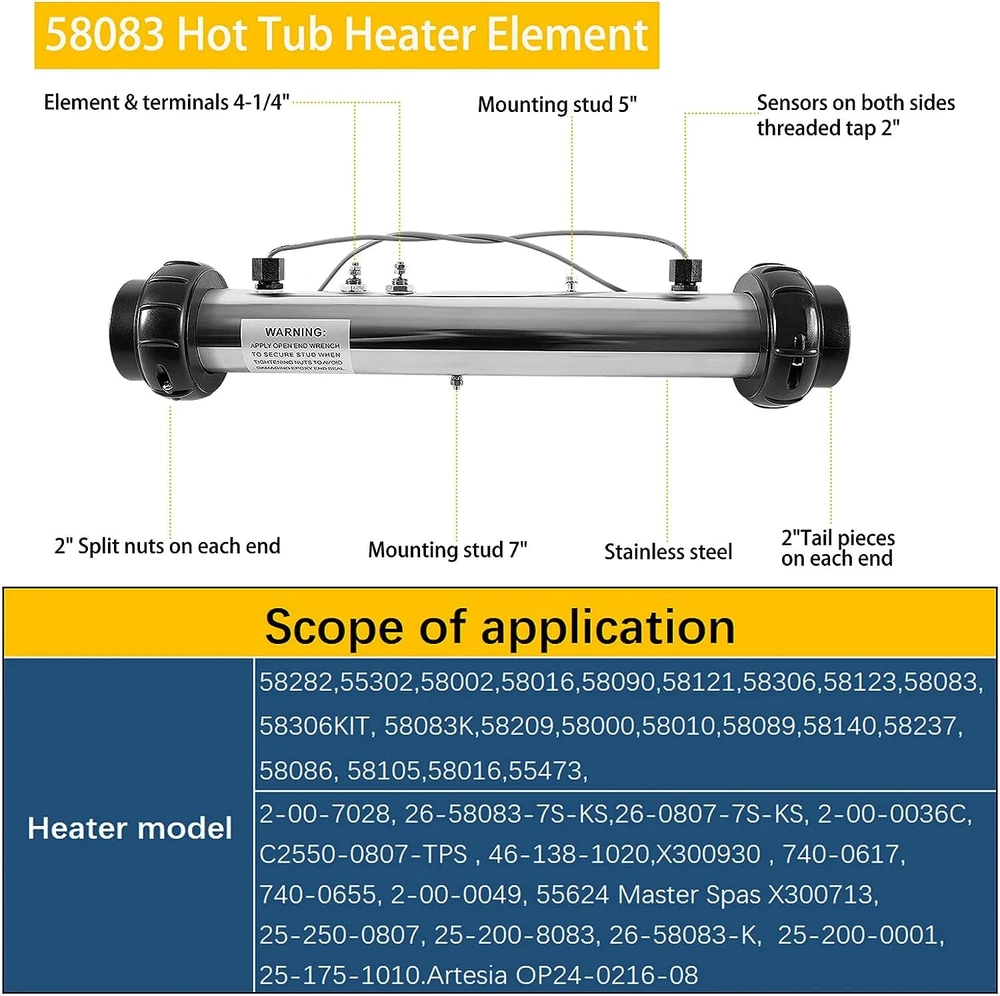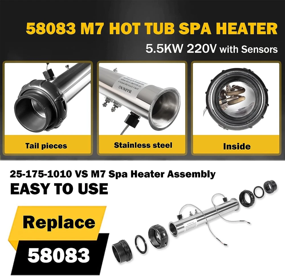 FITMENT: This heater is suitable for Balboa BP Series control systems, such as BP501G1, BP501G3, BP2000G1, BP7, as well as for Balboa VS Series and EL2001 Series control systems, such as VS501Z, VS510SZ, VS520SZ, and EL2001M3. FEATURES: 58083 M7 Heater Assembly Replacement Heater fits for Balboa BP, VS, and EL2001 Control Systems 5.5KW 220 Volt W/Sensors 25-175-1010 FITMENT: This heater is suitable for Balboa BP Series control systems, such as BP501G1, BP501G3, BP2000G1, BP7, as well as for Balboa VS Series and EL2001 Series control systems, such as VS501Z, VS510SZ, VS520SZ, and EL2001M3. FEATURES: 1)Multiple Model Replacements-- It can replace multiple models, including 2-00-7028, 58306, 58306KIT, 58083, 58083K, 26-58083-7S-KS, 26-0807-7S-KS, 2-00-0036C, C2550-0807-TPS, 58209, 58000, 58010, 58123, 58089, 58086, 58105, or X300930, 46-138-1020, 58016, 55473, 58140, 740-0617, 740-0655, 2-00-0049, 55624 Master Spas X300713, 58016, 25-250-0807, 25-200-8083, 26-58083-K, Artesia OP24-0216-08, 25-200-0001, 58237 (5.5KW 825 15IN 1.5 inch), 25-175-1010, and others. 2)Superior Material-- Equipped with a 316 stainless steel heater housing and a 5.5KW Incoloy Flo-Thru heater element, it also supports Balboa OEM M7 dual sensors. 3)Easy to Use-- The 58083 M-7 Heater Assembly can be used as a replacement heater for spas or hot tubs, featuring its own sensors, front-mounted design for user convenience, and easy servicing. 4)Satisfaction Guarantee-- The product offers a 100% satisfaction guarantee. If you're not completely satisfied with this tool set, you can return it for a full refund within 30 days. It also comes with premium support and a 12-month warranty. PRODUCT DESCRIPTION: PACKAGE INCLUDED: 58083 M7 Heater Assembly Item Specifics Brand NO-Auto Warranty 1 Year MPN NOQP1652 Type Temperature Control Panel Fitment For Balboa VS, EL, TS, GS, BP Control Systems OE/OEM Part Number 58083 Material 316 stainless steel Compatible Brand For Balboa Manifold Length 15 inch Manifold Diameter 2 inch Kilowatt Rating 5.5KW / 1.375 KW Voltage Rating 240V / 120V Number in Pack 1 Single item or Set Single item Item Length 8 in Item Height 8 in Item Depth 8 in Color Silver Features Easy Installation Model 58282, 55302, 55473, 58002, 58016, 58086, 58089, 58090 Payment 1. Payment methods accepted: Payoneer . Our Payoneer account allows you to pay by credit card, debit card and your paypal balance. 2. We ship items to Your Ebay address .Please make sure your Ebay address is correct before you pay, cause it cannot be changed once the order shipped out. Shipping 1. Item will be shipped out within 1-2 business day after clear payment received. 2. Please make sure shipping address on your ebay account is correct & up-to-date. 3. All of our items are shipped from our AU warehouse. 4. Please feel free to contact us by email if you cannot get your order in time. Please read the shipment and payment detail carefully before you bid. Returns 1. Return to us within 30 days from the delivery date for exchange or refund. Refund will be given as Money back or item exchange (buyer's choice). 2. Return shipping fee is the responsibility of buyer unless the return is a result of our mistake. 3. If you need return, please contact our customer service representative, let us know the detailed problem and send us some pictures for confirmation. Contact Us Please contact us via ebay using" Contact member ". We will respond within 1 business day or less.Thank you for your understanding. Our office hours is as below : - 9:00 a.m. to 6:00 p.m. (GMT +8) of Monday to Friday - 9:00 a.m. to 1:00 p.m. (GMT +8) of Saturday And our office is closed on Sunday and public holidays. We apologize for the late reply during the holidays.Please contact us via ebay using" Contact member ". We will respond within 1 business day or less. Please include your ebay item number or order number in all communications. DESCRIPTION PAYMENT SHIPPING RETURN POLICY CONTACT US Shop Category Store Home Car & Truck Accessories Motocycle Accessories Boat Parts ATV &UTV Truck Accessories Oil Filter Wrench Caps Home & Garden Business & Industrial Parts Automotive Tools & Supplies Personal Watercraft Parts RV&Trailer&Camper Accessories Sporting Goods Tools, Hardware & Locks Jewelry & Watches Performance & Racing Parts Collectibles Other Hot Item R50864/ R161382 Gear Shift Knob for John Deere Tractors 1020 2020 2640 2755 4430 USD 13.85 Extended Run Fuel Gas Cap For Honda Generator EU2000i EU2200i Fit 1/4"NPT Line USD 10.50 Waterproof Generator Cover w/ Storage Pocket for Honda Eu2000i Eu2200i Generator USD 17.30 KK-4835 Porter Cable Oil Free Air Compressor Piston Rod Kit A02743 for Craftsman USD 78.20 Upgraded Pressure Washer Seal Kit Used on Some Medium Frame Pressure Washer Pump USD 25.15 Picture New List Item 7208419 Hydraulic Bucket Tilt Cylinder fits Bobcat S220 S250 S300 S330 T300 T320 USD 373.75 Brake Master & Slave Cylinder Kit A51976 L25419 For Case 430 450 450B 450C 480 USD 166.11 DG61003 Regular Duty Dial Gage Holder Mag Base w/Metal Fine Adjust Replacement USD 88.67 Agri-Fab 43791 Hose Adapter For Leaf Vacuum Shred N Vac Replace 63375, AF-43791 USD 31.50 For Pentair Max-E-Thermostat Ignition Control Module MasterTemp Pool 42001-0052S USD 164.06 Help & Info Payment Policy Shipping Policy Return Policy FAQ About Us 58083 M7 Heater Assembly Replacement Heater fits for Balboa BP, VS, and EL2001 Control Systems 5.5KW 220 Volt W/Sensors 25-175-1010 FITMENT: This heater is suitable for Balboa BP Series control systems, such as BP501G1, BP501G3, BP2000G1, BP7, as well as for Balboa VS Series and EL2001 Series control systems, such as VS501Z, VS510SZ, VS520SZ, and EL2001M3. FEATURES: 1)Multiple Model Replacements-- It can replace multiple models, including 2-00-7028, 58306, 58306KIT, 58083, 58083K, 26-58083-7S-KS, 26-0807-7S-KS, 2-00-0036C, C2550-0807-TPS, 58209, 58000, 58010, 58123, 58089, 58086, 58105, or X300930, 46-138-1020, 58016, 55473, 58140, 740-0617, 740-0655, 2-00-00
