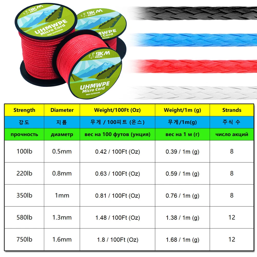 High Strength 580lb Braided UHMWPE Micro Cord 100% UHMWPE Micro Cord 100% UHMWPE Micro Cord with endless uses for outdoor applications. 0.5mm~1.6mm diameter, hollow braid, yielding high strength, with self-lubricating smooth surface and unbeatable abrasion resistance, UHMWPE Micro Cords excels most as whipping twine to bind rope ends and spliced eyes for extra security; durable stitching cord for webbings; tough sewing thread and repair cord for heavy canvas, tarps, backpacks, load-bearing equipment; Emergency fishing line and utility cords outdoors. Best cords for anywhere extra protection from abrasion is required. UHMWPE is highly resistant to abrasion and wears, largely extending the abrading period when compared to nylon and polyester. Go for UHMWPE micro cords as whipping twine or repair cords when your ropes or load-bearing equipment tend to abrade quickly due to intense rubs against woods and rocks. GO LIGHTER! 15 times stronger than steel wire on strength to weight basis, made of 100% UHMWPE (also known as different trade names, Dyneema, Spectra by different manufacturers), the micro cords are much less bulky and lighter than most other utility cords while delivering higher strength. The exceptional string helps you GO LIGHTER outdoors without compromising strength and performance. UV RESISTANT! UHMWPE retains its super performance after long-term exposure to UV. Extremely high resistance to UV, enhanced by PU coating over the cords, superior to Aramid (Kevlar, Technora, Twaron) and to most high-tech fibers. Qualified for most outdoor applications, especially as the best repair cords for marine uses. Kite Line The most loved stunt kite line as it is, with <1% stretch at working load, UHMWPE micro cords are of the least stretch for receiving quick responses from kites and resist deformation under load for longer service life. Property of zero water absorption helps survive its unbeatable quality through the damp environment (kite flying at the beach). Self-lubricating smooth surface lets cord less prone to tangle, and makes sewing and stitching a snap. SPECIFICATION Material: 100% UHMWPE Fiber (Ultra High Weight Molecular Polyethylene) UHMWPE is known as different trade names, like dyneema, spectra by different manufacturers Elongation at break: 4.8% Fusion point: 266~277 °F / 130~136 °C safe working temperature is below 176 °F / 80 °C Packaging: On Spool Recommended safe working strength(WLL): 70% of its original strength. Approximately ±2~3% deviation exists in measurement.