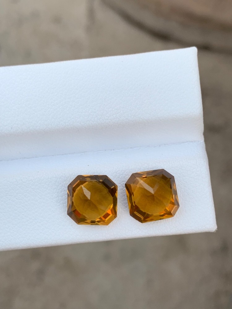 This is a set of two excellent cut natural Citrine gemstones from Africa. The gemstones have a honey color and an Ascher shape, with a size of 9.3mm x 9.3mm x 6.6mm. They are transparent with Loupe Clean clarity and are untreated. The gemstones are certified upon request and are handmade. They are suitable for wholesale purchase.
