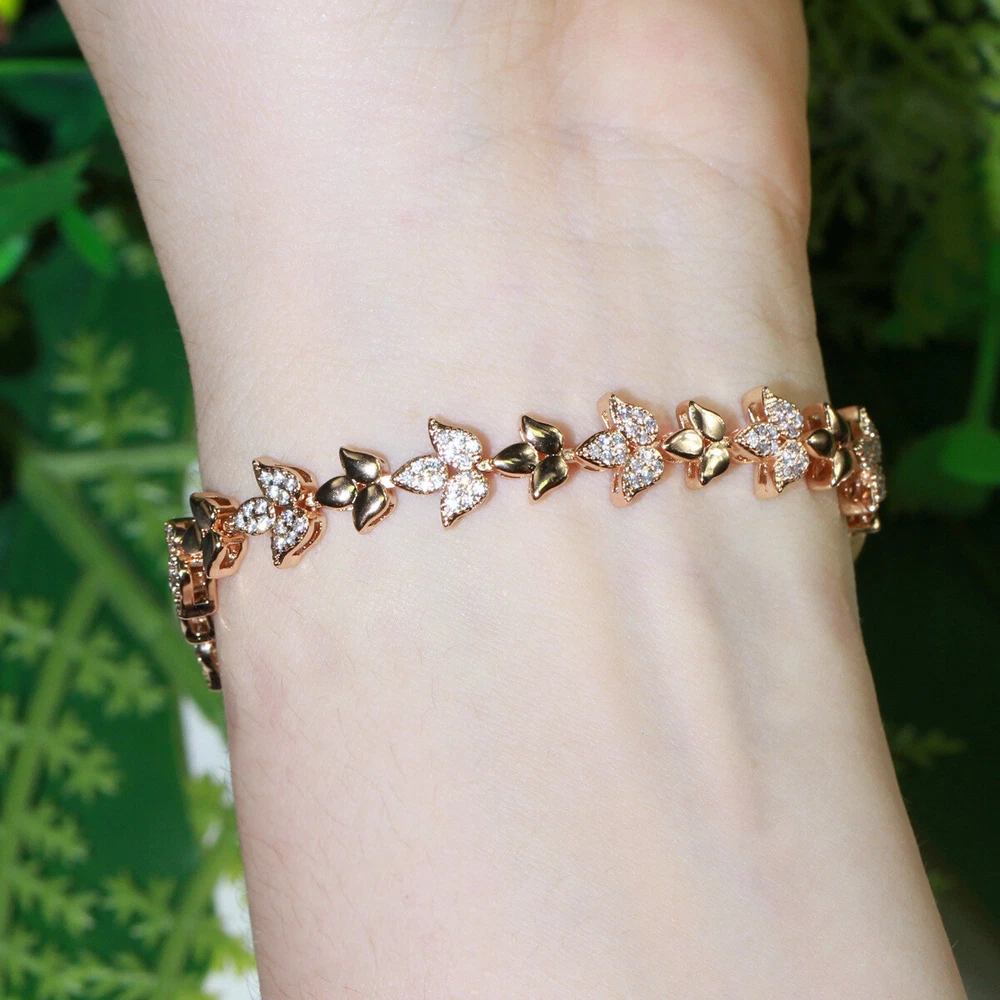 585 Rose Gold Plated Cubic Zirconia CZ Leaf Tennis Chain Link Bracelet Jewelry Specifications: 1. Condition: New 2. Material : Cubic Zirconia 3. Bracelet Size : 18.6 cm Features: 1. Cubic Zirconia High Quality Material - Diamond-like Brilliance , Prong Setting and CZ Stone are stable. 2. A Perfect Jewelry Gift for Women , Girls , Mother , Wife , Lover , Fiancee , Friends . 3. Suitable for Various Occasions: Ideal for Wedding, Prom, Pageant, Parties, Homecoming, Black Tie Formal Affairs, Holidays , Birthday , Christmas , Valentine's Day , Anniversary and Special Occasions. Package Includes: 1Pc Bracelet Payment Delivery details Terms of sales & Feedbacks About us & Contact us Our commitment Payment 1. We only ship item to your Ebay verified address . Please Make sure all address are the same 2.Please leave note in ebay when making the payment if you have any special request (colors/size). Delivery details We only send items to the registered eBay address.Items will be shipped within 2 business days from the date payment is received (not include public holiday and weekend) . As per eBay regulations, import duties, taxes, and customs charges are the buyer's responsibility. Please check with your country's customs office to determine what these additional costs may be prior to bidding or buying. Terms of sales & Feedbacks After-Sale Please contact us to request a return/replace/refund authorization .It will be best if you use ebay message to contact me. 1, Return and replacement request is available only the requests within 30 days after parcel received. 2, Returning the item as the same condition as received. Situation and solution Defectives ---Please contact us and provide a photo of the defective part. After situation confirmed,we will offer you refund/return/replacement according to the situation Not as Described ---Please contact us and provide a photo of the wrong part. After situation confirmed,we will offer you refund/return/replacement according to the situation Not Received ---Please undersatnding shipping on the way was out of our control ,because of the busy shipping season,holidays,bad weather or force majeure etc. It may be delay for days. But if it took too much time and not deliveried, Please message me, I will offer you solution for it. Feedbacks 1. If you are satisfied with our service, please leave us a + Good feedback and rate the details of the transaction (DSR) with a. . When you rate the shipping time part please take international transit into consideration.] Your recognition will make us more confident to develop business and serve you better. 2. Please contact us first if you have any problem with the items,we will solve it in time ! 3. Please do not leave Neutral or Negative Feedback before you contact us, Thanks For Your Business ! About us & Contact us Working time: Chinese time(Eastern eight zones):Monday to Friday ,9:00 am to 6:00 pm. We do not work on chinese legal holiday. Message reply: We will reply all messages within 24 hours of business time. Please contact us via ebay message, it was the best way for both you and us to solve problems. Any questions or anything you need, please feel free to contact us. Our commitment 1.Wholesale price will be offered to you if you need in bulk ! 2.About Size