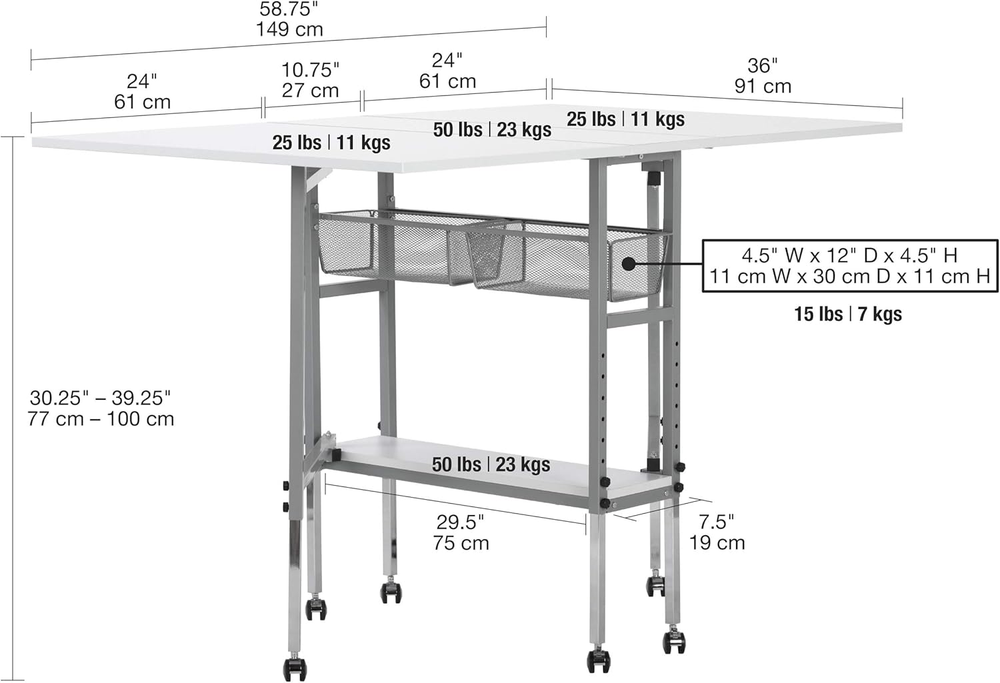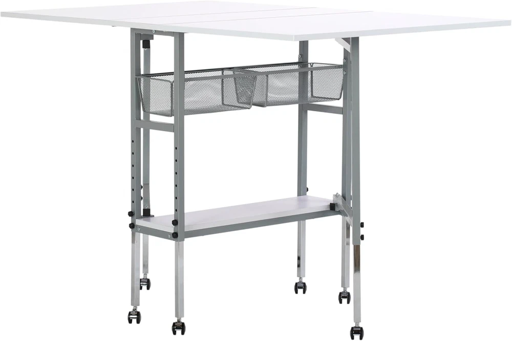 Store New Arrivals Add to Favorite View Feedback Contact Hobby and Cutting Table - 58.75" W X 36.5" D White Arts and Crafts Table with 2 Mesh Storage Drawers, Silver/White Description Item model number 13374.0 Item Weight 58 Pounds Minimum Height 30.25 Inches Assembly Required Yes Color Silver/White Finish Type Polished Material wire mesh and metal Country of Origin China Global Trade Identification Number 00017342133747 Product Dimensions 36"D x 58.75"W x 39.25"H Base Type Casters Frame Material Alloy Steel Is Discontinued By Manufacturer No Maximum Height 39.25 Inches HOBBY & CUTTING TABLE: Stylish design features a 58.75" wide and 36.5" deep tabletop when fully extended; Perfect for spreading out and diving into a variety of creative projects, including sewing, writing, crafting, and cutting fabric OFFERS STORAGE SPACE: Includes two slide-out, metal mesh storage drawers and a lower shelf, so you can store fabric, art supplies, and more without the clutter; Allows you to organize supplies and keep them close while working ADJUSTABLE TABLETOP HEIGHT: Tabletop height can be adjusted from 29.75 inches to 38.75 inches; Provides back relief on longer art projects and creates a versatile workspace no matter the project; Knob adjusts height in 1.5" increments SUSTAINABLE DESIGN: The powder-coated frame and thick tabletop make this sewing table with drawers durable and ready for years of use; Includes six floor casters for mobility and four lock for stability DIMENSIONS: OVERALL: 58.75" W x 36.5" D x 29.75" - 38.75" H (easily folds to 12.25" W); CENTER TOP: 10.75" W x 36.5" D; FOLDING PANELS: 24" W x 36.5" D; DRAWERS: 7.75" W x 14" D x 4.5" H; BOTTOM SHELF: 7.75" W x 29.5" D The Sew Ready Hobby and Cutting Table makes finding a place to create easier than ever. Designed with a 58.75" wide and 36.5" deep tabletop when fully extended, this cutting and hobby desk creates the perfect space for spreading out art supplies as you create, sew, cut fabric, adjust patterns, and work on different hobbies. Organize your sewing supplies and keep them handy with the two mesh fabric storage drawers and convenient lower shelf. This crafts table adjusts heights to help provide back relief and comfort while working on longer artistic projects. Make your space your own with the Sew Ready Hobby and Cutting Table. Overall Dimensions: 58.75" W x 36.5" D x 29.75" - 38.75" H (easily folds to 12.25" W) Center Top Dimensions: 10.75" W x 36.5" D Folding Panels Dimensions: 23.75" W x 36.5" D Two Slide-Out Wire Mesh Drawers Dimensions: 7.75" W x 14" D x 4.5" H Bottom Shelf for Storage Dimensions: 7.75" W x 29.5" D ABOUT US We offer the best prices around on high quality products. Our E-store includes media such as books, movies, music and games while offering electronics, toys, sporting apparel, clothing, tools, general home, garden items and more. SHIPPING We are always working hard to ensure your package arrives as soon as possible. Please understand that some factors like weather, high postal traffic, and the performance of shipping companies are outside of our control. We offer free shipping to the lower 48 states and ship within 2 business days of payment, usually sooner. We do not accept P.O. Boxes. Please provide a physical address. For shipping outside of the continental USA, we only use eBay's Global Shipping Program.The item is shipped to KY and then sent to the rest of the world. International customers are responsible for all duties and taxes. Continue to check out in order to calculate costs for shipping the item to your country. Messages regarding eBay's Global Shipping Program MUST be directed at eBay EXCLUSIVELY. RETURNS We offer a 30-Day Return Policy on items which you are not completely satisfied with. You have the option for a full-refund or an exchange of the item. No returns are available on items shipped outside of the USA. PAYMENT We accept PayPal. CONTACT US This page content is yet to come Please ad us to your favorite seller and visit again later Thank You CUSTOMER SATISFACTION We try our very best to make sure every customer is completely satisfied. If there's a problem, message us! We're happy to help. WE ACCEPT Copyright © 2021 AutoDS. | All Rights Reserved