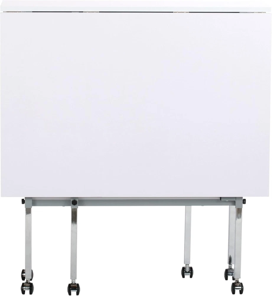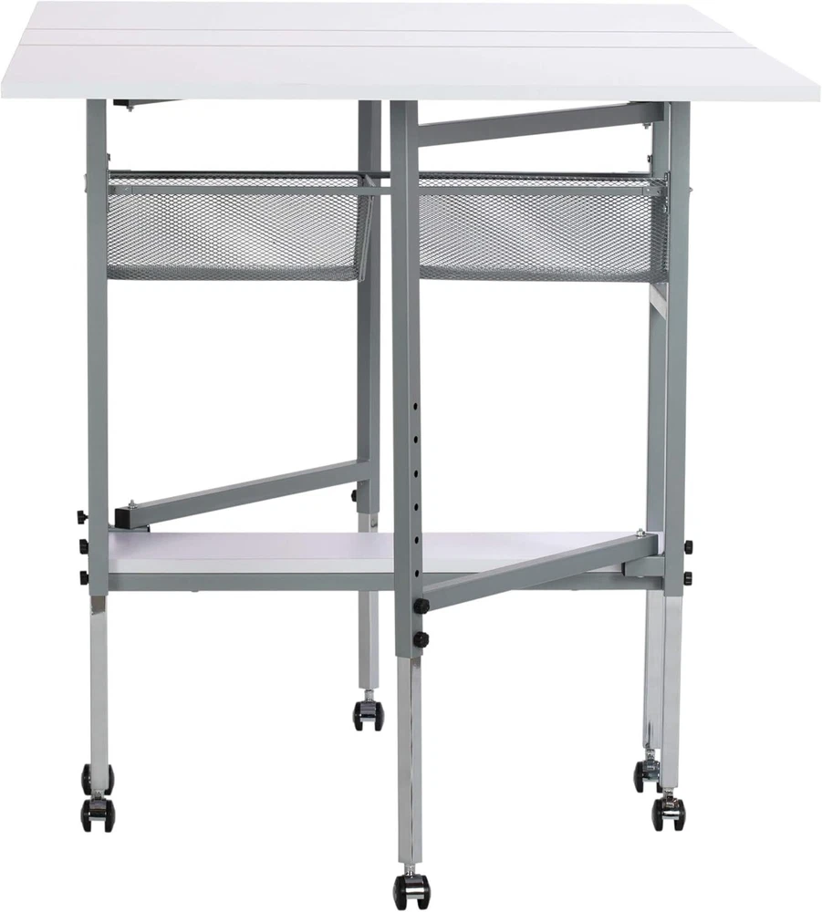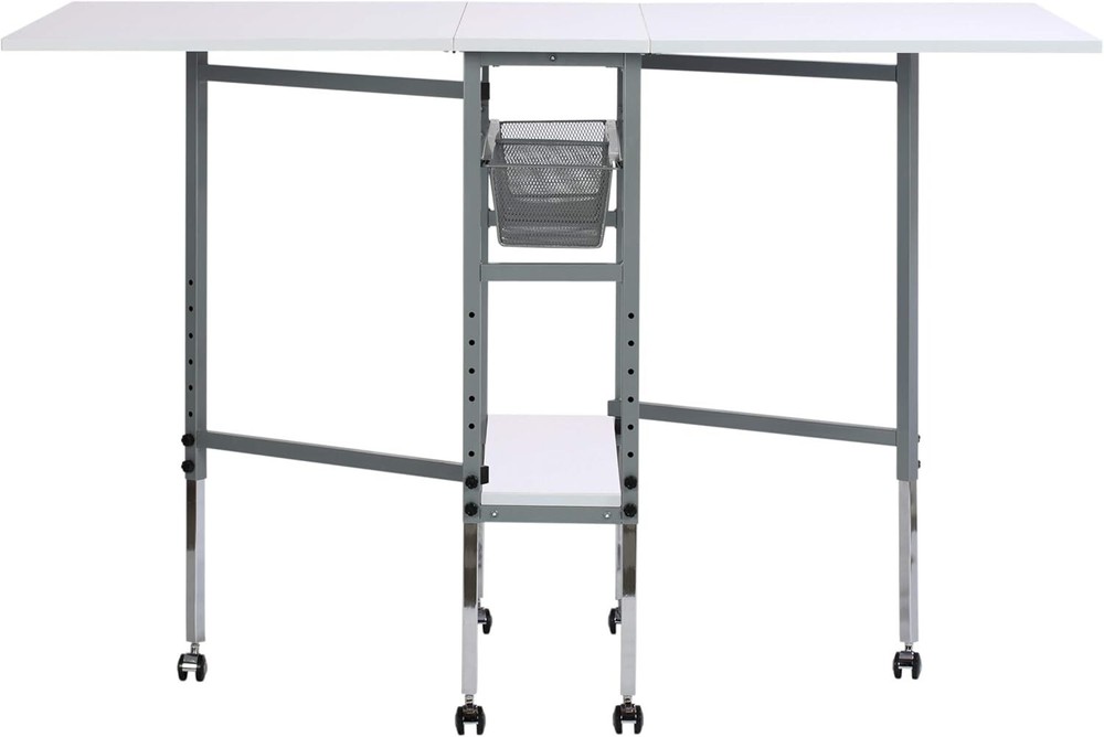 Hobby and Cutting Table - " W x " D White Arts and Crafts Table with 2 Mesh Storage Drawers, Silver/White HOBBY & CUTTING TABLE: Stylish design features a " wide and " deep tabletop when fully extended; Perfect for spreading out and diving into a variety of creative projects, including sewing, writing, crafting, and cutting fabric OFFERS STORAGE SPACE: Includes two slide-out, metal mesh storage drawers and a lower shelf, so you can store fabric, art supplies, and more without the clutter; Allows you to organize supplies and keep them close while working ADJUSTABLE TABLETOP HEIGHT: Tabletop height can be adjusted from inches to inches; Provides back relief on longer art projects and creates a versatile workspace no matter the project; Knob adjusts height in " increments SUSTAINABLE DESIGN: The powder-coated frame and thick tabletop make this sewing table with drawers durable and ready for s of use; Includes six floor casters for mobility and four lock for stability DIMENSIONS: OVERALL: " W x " D x " - " H (easily folds to " W); CENTER TOP: " W x " D; FOLDING PANELS: 24" W x " D; DRAWERS: " W x 14" D x " H; BOTTOM SHELF: " W x " D The Hobby and Cutting Table makes finding a place to create easier than ever. Designed with a " wide and " deep tabletop when fully extended, this cutting and hobby desk creates the perfect space for spreading out art supplies as you create, sew, cut fabric, adjust patterns, and work on different hobbies. Organize your sewing supplies and keep them handy with the two mesh fabric storage drawers and convenient lower shelf. This crafts table adjusts heights to help provide back relief and comfort while working on longer artistic projects. Make your space your own with the Hobby and Cutting Table. Overall Dimensions: " W x " D x " - " H (easily folds to " W) Center Top Dimensions: " W x " D Folding Panels Dimensions: " W x " D Two Slide-Out Wire Mesh Drawers Dimensions: " W x 14" D x " H Bottom Shelf for Storage Dimensions: " W x " D