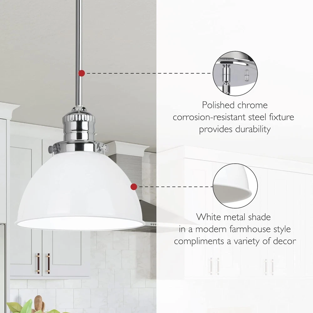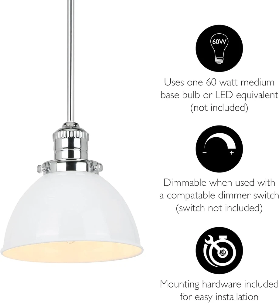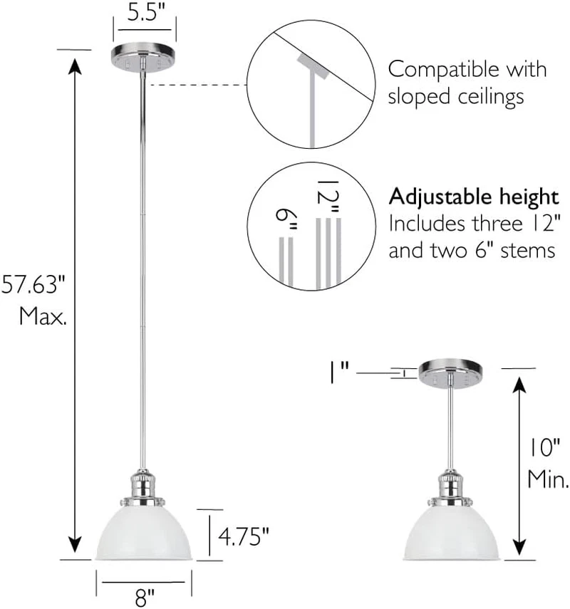 Store New Arrivals Add to Favorite View Feedback Contact 588327-PC Savannah Pendant Light Fixture with Satin White Shade, Polished Chrome Description Light Source Type LED Item model number 588327-PC Style 1-Light Number of Items 1 Power Source AC/DC Fixture Type Non Removable Number of Light Sources 1 Control Method App Warranty Type 10 Year Limited Theme Rustic/Modern Farmhouse Batteries Included? No Lighting Method LED Specification Met UL Controller Type Push Button Unit Count 1.0 Count Room Type Kitchen Finish Polished Assembly Required No Switch Type Push Button Material Alloy Steel Installation Type Semi Flush Mount Model Name Savannah Light Finish Type Polished Specific Uses For Product Any Room Included Components Mounting Strap, Ground Screw, Mounting Screw, Wire Connector, Outlet Box Screw, Lock Nut, Screws, Rods, Metal Shade Item Package Quantity 1 Indoor/Outdoor Usage Indoor Brightness 900 lumen Country of Origin China Light Color White Water Resistance Level Not Water Resistant Batteries Required? No Item Weight 2.31 pounds Light fixture form Pendant Special Features Adjustable Height Special Feature Adjustable Height Part Number 588327-PC Shade Color White Mounting Type Ceiling Mount Color Polished Chrome Wattage 60 watts Bulb Base E26 Voltage 120 Volts Plug Format A- US style Recommended Uses For Product Indoor Shade Material Metal Warranty Description 10-year limited warranty. Size Pendant Product Dimensions 8"L x 8"W x 57.63"H Number Of Pieces 1 Modern Farmhouse Pendant Light: Stunning polished chrome finish pairs perfectly with satin white metal shades and complements a variety of design decors Adjustable Height: Includes (2) 6-inch and (3) 12-inch standard adjustable rods for varied hanging heights Versatile Ceiling Placement: Pendant light compatible with sloped ceilings, up to 45-degree angle Sturdy and Durable: Corrosion resistant steel construction Ease of Use: Easy to install, clean, and maintain The Design House 588327-PC Savannah Pendant Light Fixture features an effortless blend of rustic and modern farmhouse styles. Stunning polished chrome finish pairs perfectly with a satin white metal shade. The simplistic charm complements a variety of design decors. Constructed of steel, this pendant ceiling light unites beauty with durability. Uses one (1) 60 Watt medium base bulbs or LED equivalent (not included). Add a compatible dimmer switch for dimming capability to create the perfect atmosphere (dimmer switch sold separately). This model boasts versatility, effortless cleaning, and easy installation. The pendant light is the perfect task light for your kitchen island or bar area. ABOUT US We offer the best prices around on high quality products. Our E-store includes media such as books, movies, music and games while offering electronics, toys, sporting apparel, clothing, tools, general home, garden items and more. SHIPPING We are always working hard to ensure your package arrives as soon as possible. Please understand that some factors like weather, high postal traffic, and the performance of shipping companies are outside of our control. We offer free shipping to the lower 48 states and ship within 2 business days of payment, usually sooner. We do not accept P.O. Boxes. Please provide a physical address. For shipping outside of the continental USA, we only use eBay's Global Shipping Program.The item is shipped to KY and then sent to the rest of the world. International customers are responsible for all duties and taxes. Continue to check out in order to calculate costs for shipping the item to your country. Messages regarding eBay's Global Shipping Program MUST be directed at eBay EXCLUSIVELY. RETURNS We offer a 30-Day Return Policy on items which you are not completely satisfied with. You have the option for a full-refund or an exchange of the item. No returns are available on items shipped outside of the USA. PAYMENT We accept PayPal. CONTACT US This page content is yet to come Please ad us to your favorite seller and visit again later Thank You CUSTOMER SATISFACTION We try our very best to make sure every customer is completely satisfied. If there's a problem, message us! We're happy to help. WE ACCEPT Copyright © 2021 AutoDS. | All Rights Reserved