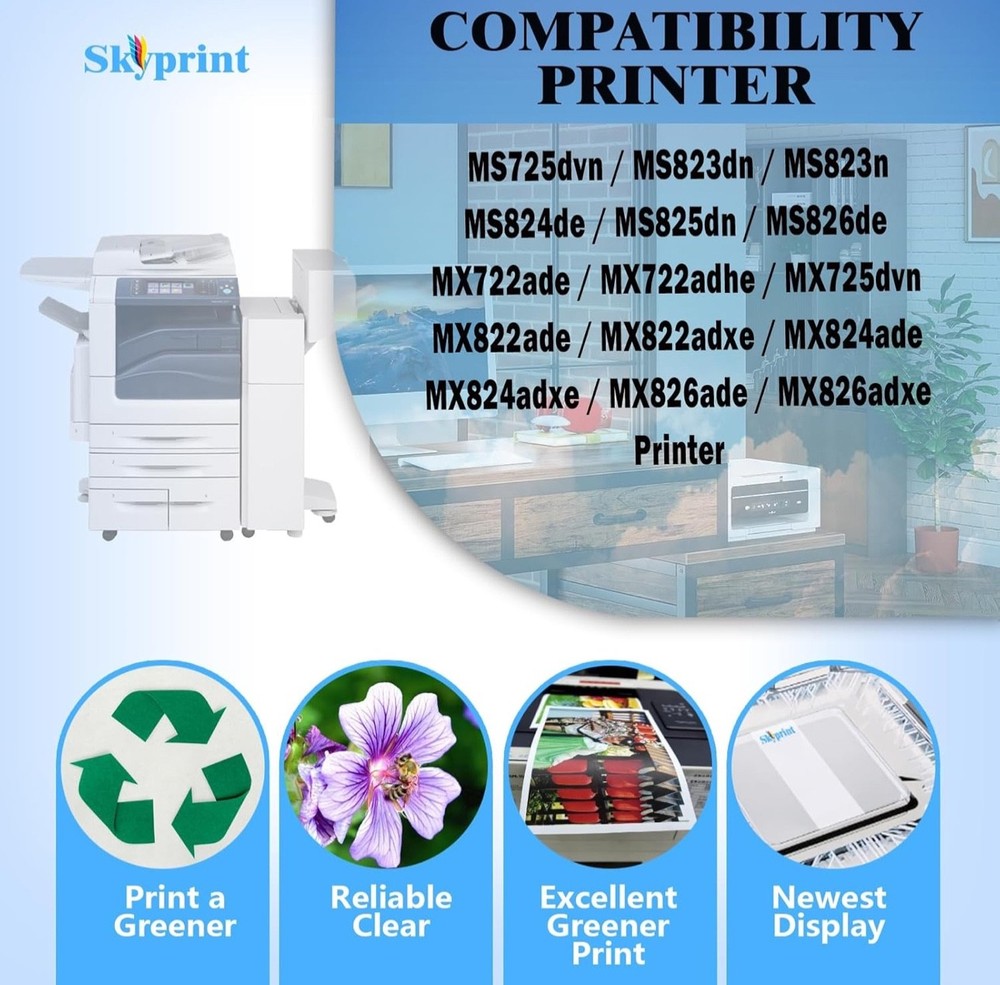 #2456 58D1U00 Black Ultra High Yield Toner Cartridge Campatible Lexmark 58D1U00 58D1U0E Black Toner Cartridge Work for Lexmark MS823 MS725 MS825 MS826 MX722 MX725 MX822 Printer Brand SkyPrint Color Black Compatibility Options Compatible MS725dvn, MS823dn. MS823n, MS824de, MS825dn, MS826de, MX722ade, MX722adhe, MX725dvn, MX822ade, MX822adxe, MX824ade, MX824adxe, MX826ade, MX826adxe Page Yield 55000 Manufacturer SkyPrint Product Quantity:1-pack 58D1U00 Black Toner Cartridge 58D1U00 Ultra High Yield Toner Compatible With Printers:Lexmark MS725dvn, MS823dn. MS823n, MS824de, MS825dn, MS826de, MX722ade, MX722adhe, MX725dvn, MX822ade, MX822adxe, MX824ade, MX824adxe, MX826ade, MX826adxe Printer High Page Yield:up to 55,000 pages per 58D1U00 black toner at 5% coverage of A4 Letter SkyPrint 58D1U00 toner cartridges come with intelligent chips that automatically recognize and provide printing, Not damaging the machine,Shake the toner cartridge horizontally 2-3 times before use to evenly distribute the toner When purchasing 58D1U00 toner cartridge, please confirm if your printer model meets the requirements