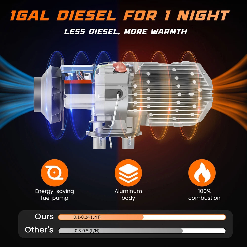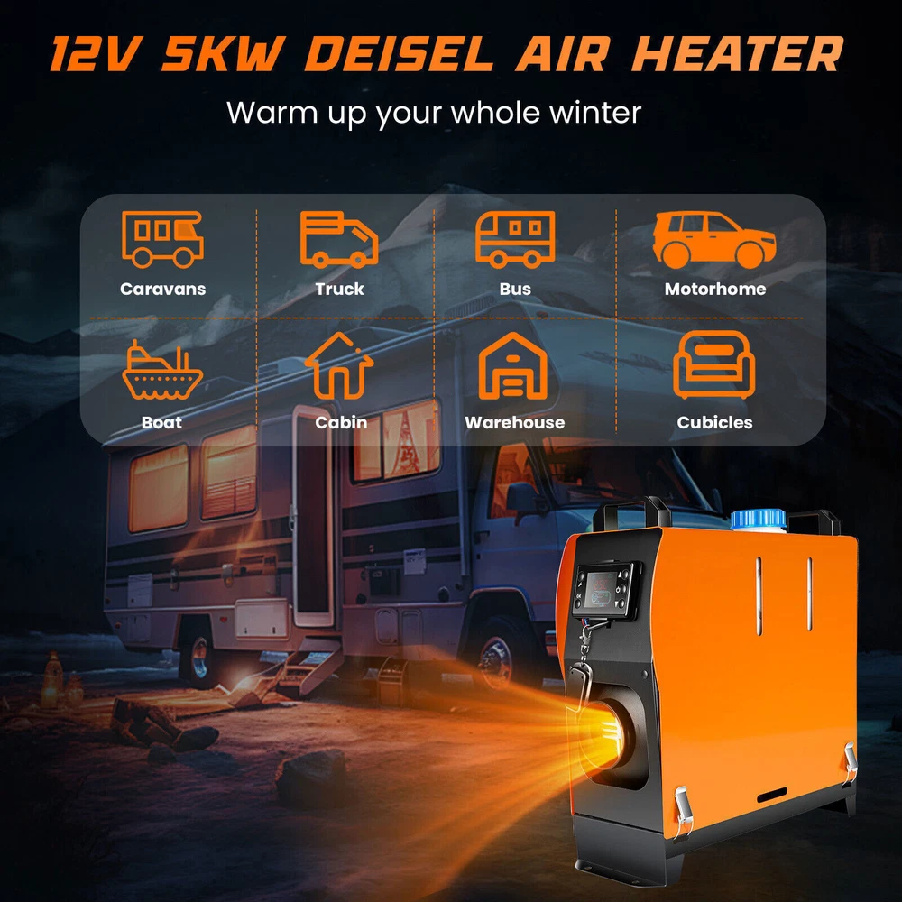 5-8KW 12V/24V/110V Car Diesel Air Heater Portable All In One Parking Heater LCD For fast and efficient heating on the go, the Giantz 5KW Portable Diesel Air Heater is a fantastic climate control solution that suits a wide variety of vehicles. Features 5KW portable diesel air heater All-in-one streamlined design Low noise Built-in 5L fuel tank Energy-saving Low fuel consumption High heat output Quick and efficient heating LCD monitor control 30-metre long-distance remote control Compact and easy installation Suitable for various vehicles like RVs, boats, buses, machinery, etc. Attention: No smoking and no open flames near the device. Note: Please read the instruction manual carefully before using the product. Specifications: Heater Power: 5KW Heating Capacity:5-8KW adjustable Fuel: Diesel (5L) Rated Voltage: 12V starting current:15A Color: Black + Red Material: Metal + ABS Plastic Car Air Conditioning Type: Heating Switch Type: LCD Switch Rotated Speed: 4500-4700(r/m) Remote Control Distance: 30m(Without Obstacle) Fuel Consumption: 0.23-0.51L/h Rated Power: 20-50W Working Temperature of the Heater: -40 to +50 Celsius degree Working Temperature of the Oil Pump: -40 to +40 Celsius degree Product Dimension: L:41.5cm/ 16.33" W:15.5cm/6.1" H:40.5cm/ 15.94" Product Weight: 8kg Remote control battery type : 23A Application : Motorhome, camper trailer, truck, van, boat, excavating machinery, agriculture machinery, caravan, bus, etc. SHIPPING ABOUT US PAYMENT RETURNS CONTACT SHIPPING Please be aware that PO Box cannot receive items,please DO NOT fill in the PO Box address. DELIVERY DAYS: 3-7 BUSINESS DAYS 3 BUSINESS DAYS SHIPPING OUT SHIP FROM CA & TX & NJ & GA & NC &OR WAREHOUSE California Warehouse: City of Industry, CA Texas Warehouse : Houston, TX New Jersey Warehouse : Perth Amboy, NJ New York State Warehouse: Perth Amboy, NJ Georgia Warehouse: Austell,GA North Carolina Warehouse: Grove NC Oregon Warehouse: AIRPORT WAY Portland,OR ABOUT US Welcome to our eBay store. As a leading and emerging company in manufacturer and exporting business, we are specialized in Business and Industrial Products, Sporting Goods, Pet Products, Home and Garden products for more than 10 years. We believe that it is our vision and mission to provide innovative products with best service and competitive price to satisfy you. Our goal is to make sure that you can find exactly what you are looking for and make it easy for you to place your orders. PAYMENT We accept PayPal payment,PayPal Credit,Credit card or debit card and so on. Payment should be completed within 4 (Four) days of auction closing. Or unpaid dispute will be filed for closing auction. We will leave a positive feedback immediately after payment is received. We appreciate a positive feedback as much as you do. If for some reason there is any issue with the purchase, please contact us prior to leaving feedback, we will be glad to work together and provide a satisfying solution. RETURNS All of our items are backed with a 30-day return policy. We ensure all our items are new and in excellent condition prior to shipping. In case you receive the item that is not to the standards above, please contact us via e-Bay messages. All returns must be in new original condition as received and should be shipped with delivery confirmation Please note that all returns must be pre-approved by us. Unauthorized returns will not be accepted. If you need to return, please check twice to confirm the item not work and contact our customer service representative, let us know the detailed problem and send us some pictures for confirmation. We ONLY accept returns with original package. Please make sure that item has NO man-made sabotage. Used items will not be accepted for return. CONTACT Email Customer Support: 9:00am-2:00am PST Sunday-Friday All emails will be responded to within 12-24 hours