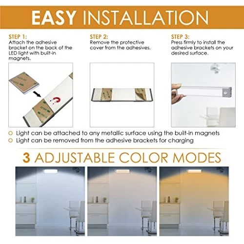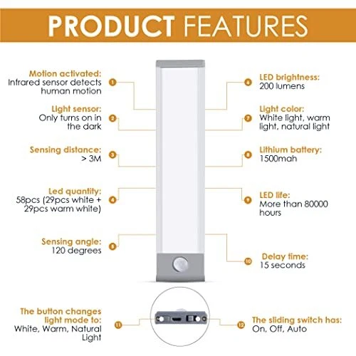Return Policy Fast Delivery Trusted seller 58-LED Motion Sensor Light Indoor, Motion Activated Closet Light, USB Rechargeable Wireless LED Light for Kitchen, Wardrobe and Cabinet, 1500mah, Warm and Natural White, 2 Pack Product Description AUTOMATIC MOTION SENSOR: Our under cabinet light with passive infrared technology (PIR) detects human motion to automatically turn on in the dark. These motion sensor closet lights automatically turn off after 20 seconds with no motion or if other light sources are detected. This battery-powered light works in the dark only – the light sensor detects other lights and won’t switch on in the light. EASY TO INSTALL: These led bar motion sensor lights include a magnetic strip with an adhesive backing for easy peel-and-stick installation. The LED cabinet lights attach to the magnetic strip for easily detaching and battery replacement. No tools, screws, or nuts are required. Mount the locker lights on any dry, clean, and flat surface. BRIGHT UNDER THE COUNTER LIGHTS: These indoor motion sensor lights for the kitchen are brighter than other similar lights. With 58 LEDs in each light, our magnetic locker lights provide enough light to make sure you never stumble in the dark. This stick-on light has the function of adjustable color modes. USB RECHARGEABLE AND ENERGY SAVING: Our under-counter lights are completely wireless for an easy and neat installation. Each wireless LED light bar is powered by a1500mAh high-capacity rechargeable battery, easily charged via the USB cable (included). Simply detach the lights from the magnetic strip for quick battery replacement. Built-in daylight sensor ensures a long battery life by not turning on when other light sources are detected. MULTI-PURPOSE AND DURABLE: This battery LED light can be used in the kitchen, closet, pantry, hallway, bathroom, safe, drawers, attics, basements, kid's room, cupboard, emergency supplies storage room, garage, medicine cabinet, storm cellar, storage unit, vanity mirror, workstation, and anyw you need hands free lights. Shipping Returns Payment Shipping Shipping is FREE to all addresses other than APO/PO boxes in the lower 48 states. All our stock ships from US-based warehouses. Shipped via USPS or UPS (depending on location and package weight) Unless stated otherwise, all orders will ship within 24-72 hours of your payment being processed. Check our feedback to see the great reviews of FAST shipping we offer. Returns Seller does not accept returns Payment We currently accept payment via eBay managed payments only. Once payment is cleared, we will dispatch your shipment within 1-3 business days. Please refer to the "Shipping" tab for more information regarding shipping speed to your destination.