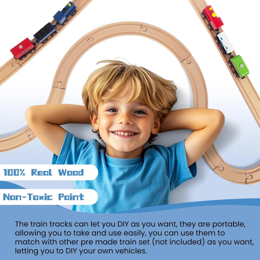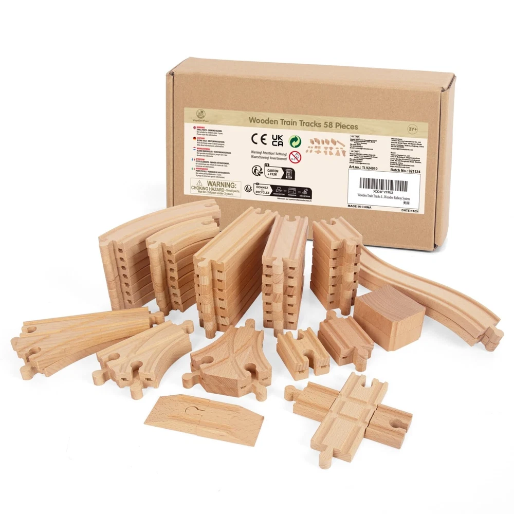 Wooden Train Tracks 58 Piece Set, Track Expansion and 9 Distinct Pieces - 100% Compatible with All Major Brands Including Thomas Wooden Railway System Product Details Style: 58 Pcs Brand: WoodenEdu MPN: 42007-RL-42008 UPC: 741654624661 EAN: 0741654624661 Product Dimensions: 10 x 5 x 3 inches Item Weight: 4.71 pounds Country of Origin: China Manufacturer recommended age: 3 years and up Manufacturer: WoodenEdu 58 Pieces of Premium Wood Train Tracks Work with All Major Brands of Trains and Track The Easiest Way to Expand Your Train Track Collection Includes Straight Track, Curved Track, and Curved Switch Track Premium Wood Craftsmanship: With a smooth edge and non-toxic water-based paint, all wood of the kid's train expansion set is made of 100% beech wood from Australia.