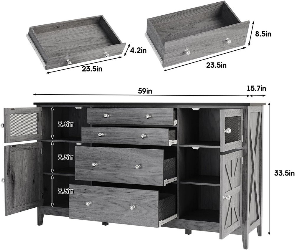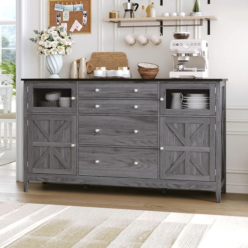 59" Farmhouse Buffet Cabinet with Storage,Sideboard Buffet Table with 6 Drawers & 2 Barn Door,Coffee Bar Cabinet with Adjustable Shelf for Kitchen,Living Room (Dark Grey, L59*W15.7*H33.5in) Product Description About this item Buffet cabinet With Spacious Space:This storage cabinet amazes with its large capacity. There are 2 visible drawers to keep frequently used cooking utensils and ingredients at a glance. There are also 2 different sizes of drawers and 2 Storage cabinet with doors, which in turn keeps less frequently used items well hidden and maintains a tidy look in the kitchen. Farmhouse Buffet Cabint:The Classic Farmhouse style sideboard seamlessly combines functionality,aesthetics, and space utilization.Both practical storage tool,but also for the kitchen to add retro style decorative goodies,so that you are cooking as if in a leisurely American country life,enjoy that unique warmth and comfort. Multi-purpose Storage Cabinet:This 59-inch large buffet,it seamlessly transforms into a dining room sideboard, kitchen or hallway storage cabinet. Great Quality & Excellent Workmanship: This buffet sideboard is made of HIGH-QUALITY materials, which are finely treated to ensure both strength and good texture. Moreover, it is full of details that show the quality, exquisite pull handles and iron mesh drawers, each of which adds to your experience. Easy to Assemble:This sideboard table comes with detailed Installation Instructions, all parts and accessories are easily identified with numbered stickers for easy recognition and.We will do a good check before delivery,please don't hesitate if you meet any problems with our products,we will provide you with a satisfactory solution. American country kitchen storage cabinets are both practical storage tools and decorative goodies that add a vintage touch to the kitchen. Sideboard Buffet Cabinet With Different Size drawers In order to separate the different sizes of cutlery, the drawers of this storage cabinet are divided into 2 sizes, the top 2 drawers for cutlery and the bottom one for larger dishes, jars. Product Features Side Cabinet With Door Adjustable dividers allow you to store different sizes of kitchenware. Spacious tabletop Not only is there storage for a multitude of different functions, but the huge table top is big enough to hold all your kitchen supplies, or a huge TV. Visual Cabinet The wire mesh design is not only more rustic but you can see what you need at a glance. Round Metal Handle High-quality metal round handles, feel great in your hand, rounded shape won't get hurt Farmhouse Decor The rustic design of the side X is not only aesthetically pleasing, it makes the whole table more solid. Adjustable dividers The 2 storage cabinets on the top and bottom of the side can accommodate different sizes of kitchen supplies.