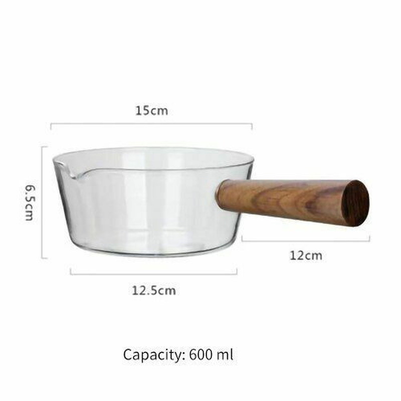 size: 15*12.5*6.5cm/5.91*4.92*2.56in Glass cookware with many uses as a saucier, salad bowl, chocolate melting pot, butter warmer, milk pot, milk pan, milk warmer pot, matcha bowl, matcha tea set, tea ceremony set, gravy boat, Japanese bowl, pho bowl, parfait glass, kitchen gift, housewarming gift, petit pot, petit pot pour bébé, baby pot. Sleek modern design makes this a beautiful piece in the kitchen or on your dinner table. Features a convenient spout for pouring and ergonomically designed wooden handle for comfort and safety Suitable for glass-ceramic stovetop, electric stovetop, halogen stovetop, induction stovetop. Cookware pieces that contain wood in their design should not be placed in the oven. Do not use it on a gas stovetop. Package includes: 1 x Wooden Handle Glass Cooking Pot with lid