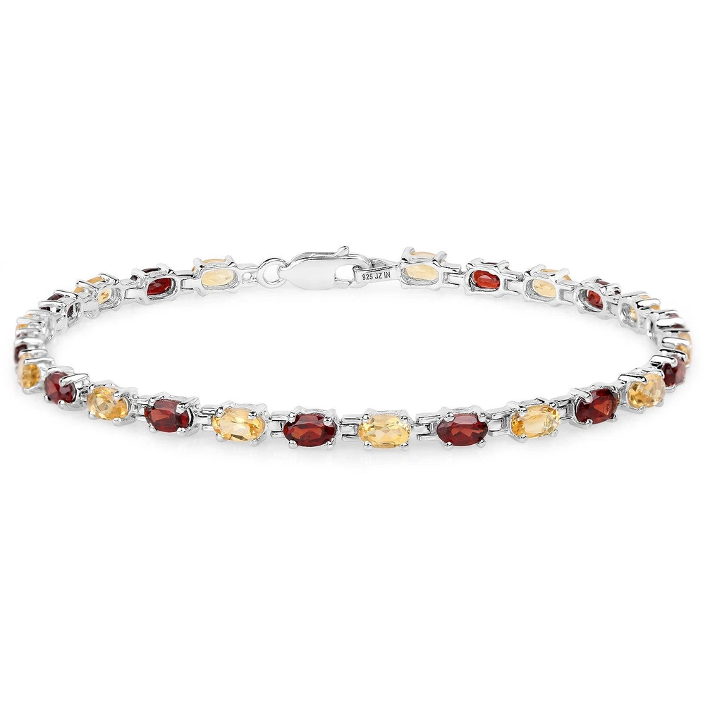 Citrine:Oval/5x3mm 13/2.60 ctw + Garnet:Oval/5x3mm 12/3.36 ctw Specifications: Gem wt. (Carat): 5.96 Gross wt. (gms): 7.34 Height: 0.13 Inches Length: 7.50Inches Metal: .925 Sterling Silver Metal wt. (gms): 6.15 Width: 0.15 Inches