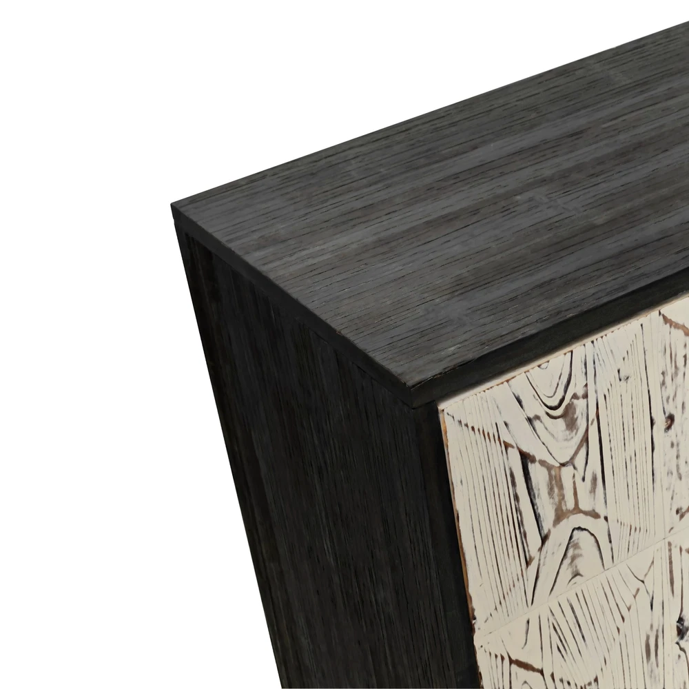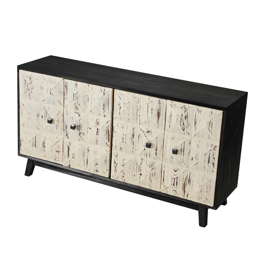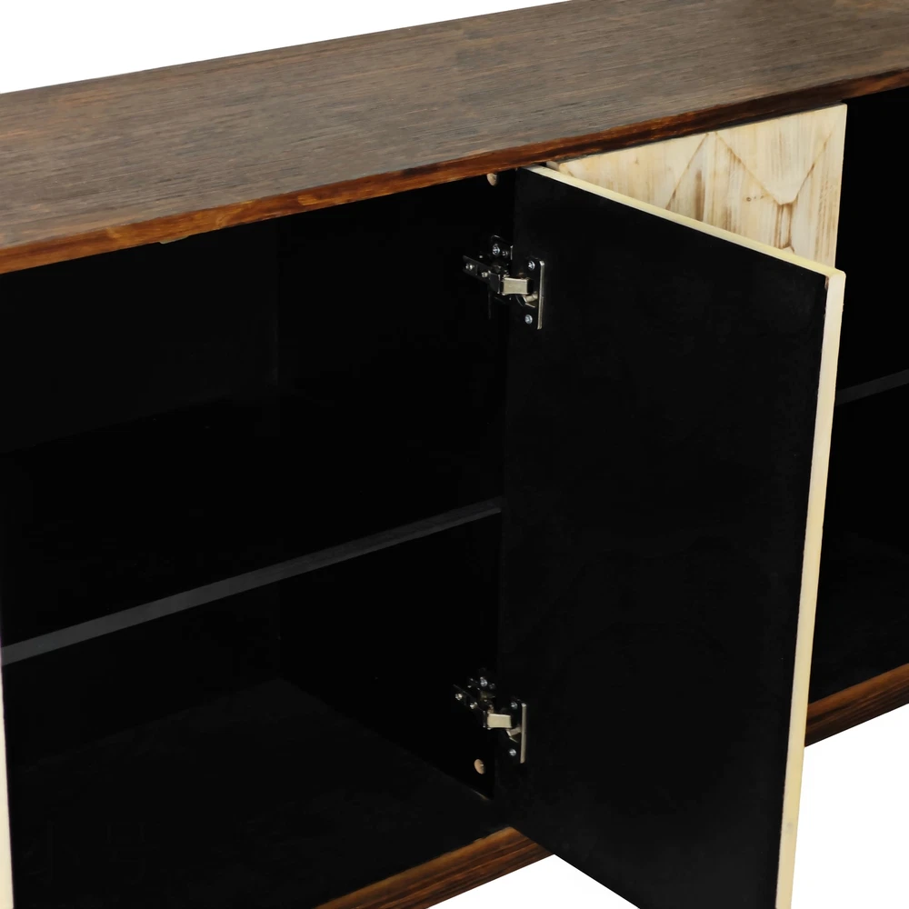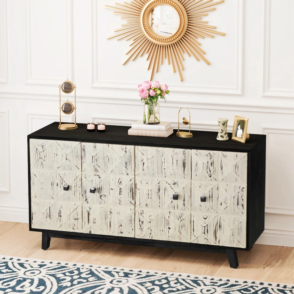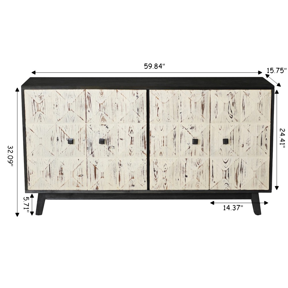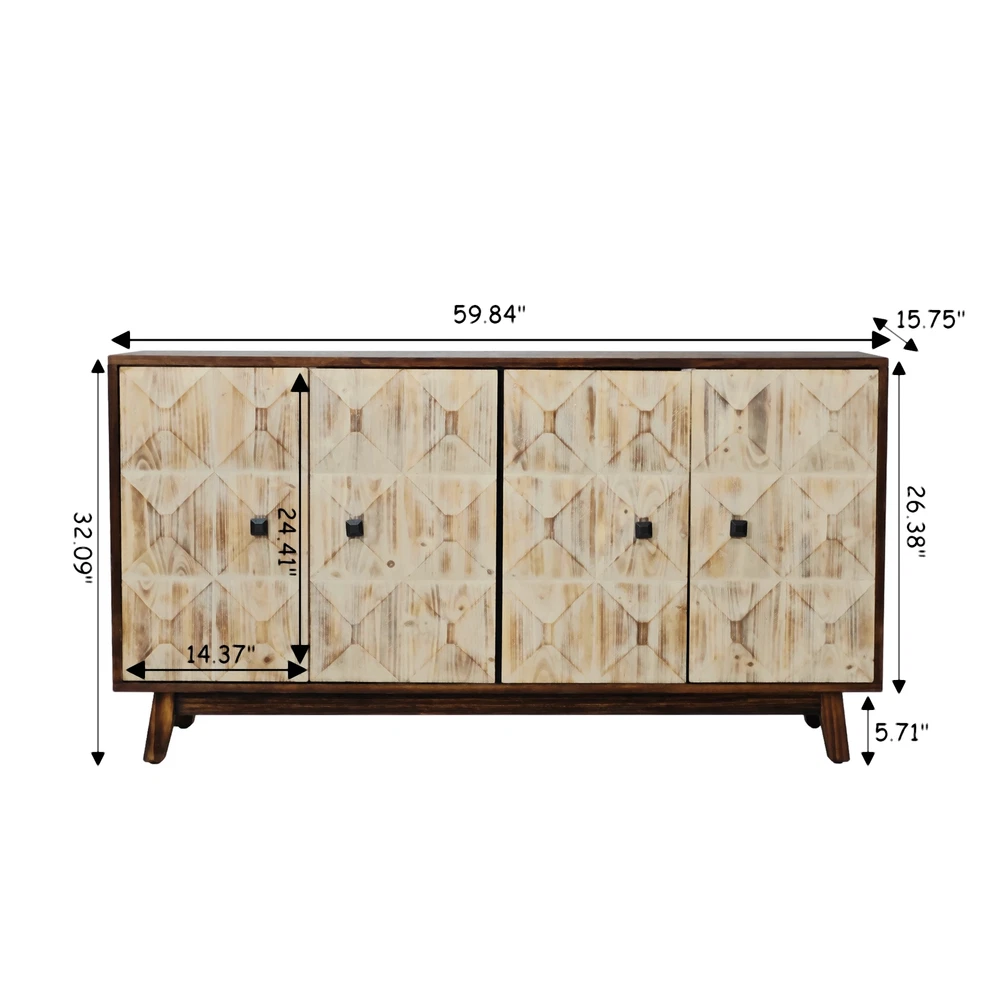 Product Features Retro and fashionable design: The cabinet door is adorned with raised three-dimensional relief patterns and metal handles, paired with pine legs to create a clean three-dimensional aesthetic, providing a texture and timeless appearance. The fire washed antique finish on the cabinet adds a sense of simplicity, complementing various styles. Whether placed in the kitchen, entryway, or living room, this vintage style cabinet can inject warmth and warmth into your home. Durable Structure: This cabinet is made of a combination of elm, fir, density board, and solid wood support legs, providing higher stability and durability. The top plate of the cabinet is made of elm wood, which can bear a weight of 220 pounds, and the layer board is made of MDF board, which can bear a weight of 121 pounds. Adequate Storage Space: This dining cabinet comes with two large-sized cabinets, which can meet all your storage needs. Easily organize kitchen appliances, tableware, glassware, etc. The built-in shelves can be customized to accommodate items of various sizes, providing flexibility and convenience. Easy to assemble : Although this retro sideboard is full of fashion, it is easy to assemble. This product includes detailed instructions to guide you through each step of the assembly process. With clear instructions, you can quickly install the cabinets and easily enhance your living space. Description Feature: This 59.84-inch long 4-door buffet cabinet combines vintage elegance with fashionable design, adding a touch of brightness to your home. This dining cabinet features a beautiful three-dimensional relief finish and stylish metal handles, adding a touch of delicacy to any living room or corridor. This sideboard buffet cabinet is not limited to living rooms or corridors, but can also be used as a kitchen buffet cabinet or entrance aisle cabinet. Its versatility makes it a magical piece of furniture that can fit any room in the home. Specifications: Color Black/Natural Material Panel:elm Door plank:Fir+MDF Table legs:Pine Handle:Metal Product Dimension 59.84"L x 15.75"W x 32.09"H Weight Capacity Tabletop: 220lbs, Central Shelf: 121lbs Assembly Required Yes Package Number 1 Notice 1. Due to lighting or display, the actual product color may differ slightly from the image. 2. Manual measurement was used, and there may be some reasonable errors.