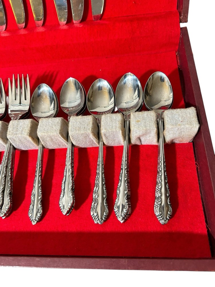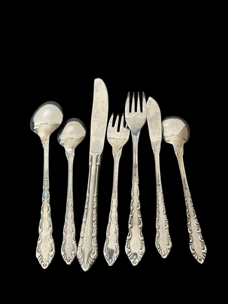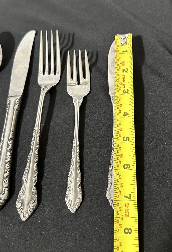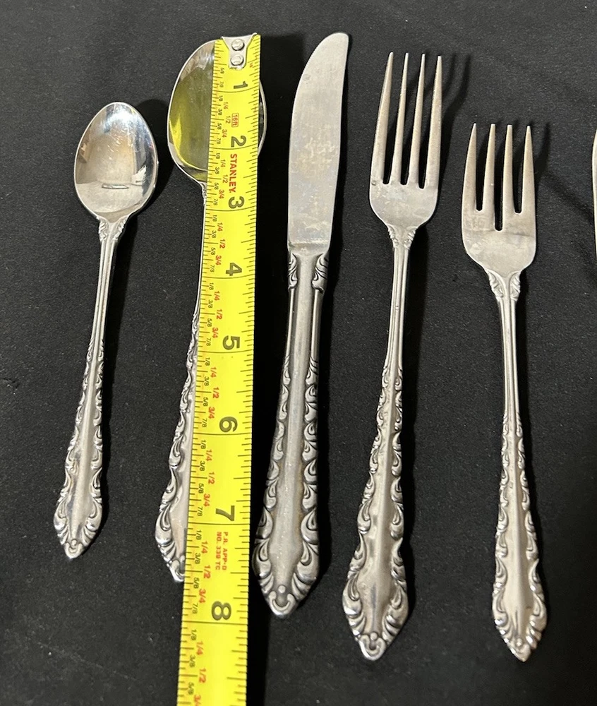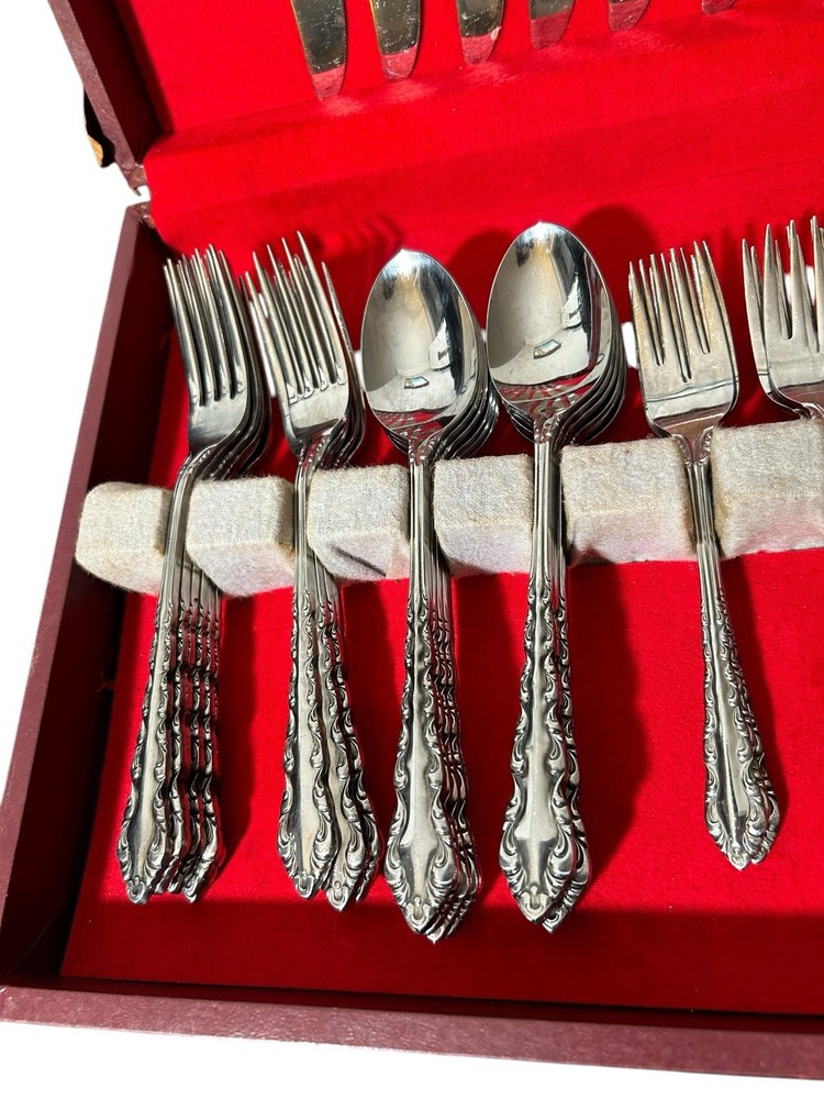 59 Pc National Stainless NS Illusion Scroll Gothic Dinner Dessert Set In Case All approximate measurements in the pictures 13 teaspoons 10 salad forks 12 dinner spoons 11 dinner forks 11 dinner knives 1 sugar spoon 1 butter knife Good vintage condition . Minimal signs of wear and use, minor scratches. The case has many signs of wear and tear, scuffs, scratches, and discolorations. The bowl of the sugar spoons has some light discolorations. Please study pictures carefully before purchasing Feel free to ask us any questions. Thank you for visiting our store! Shlv