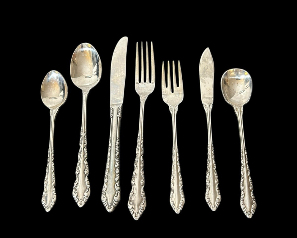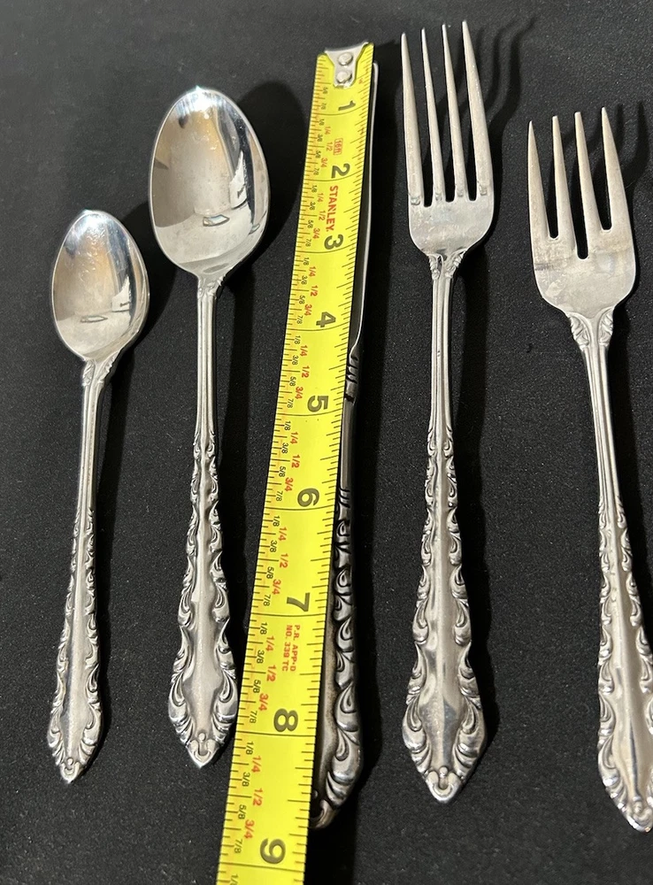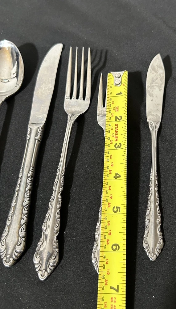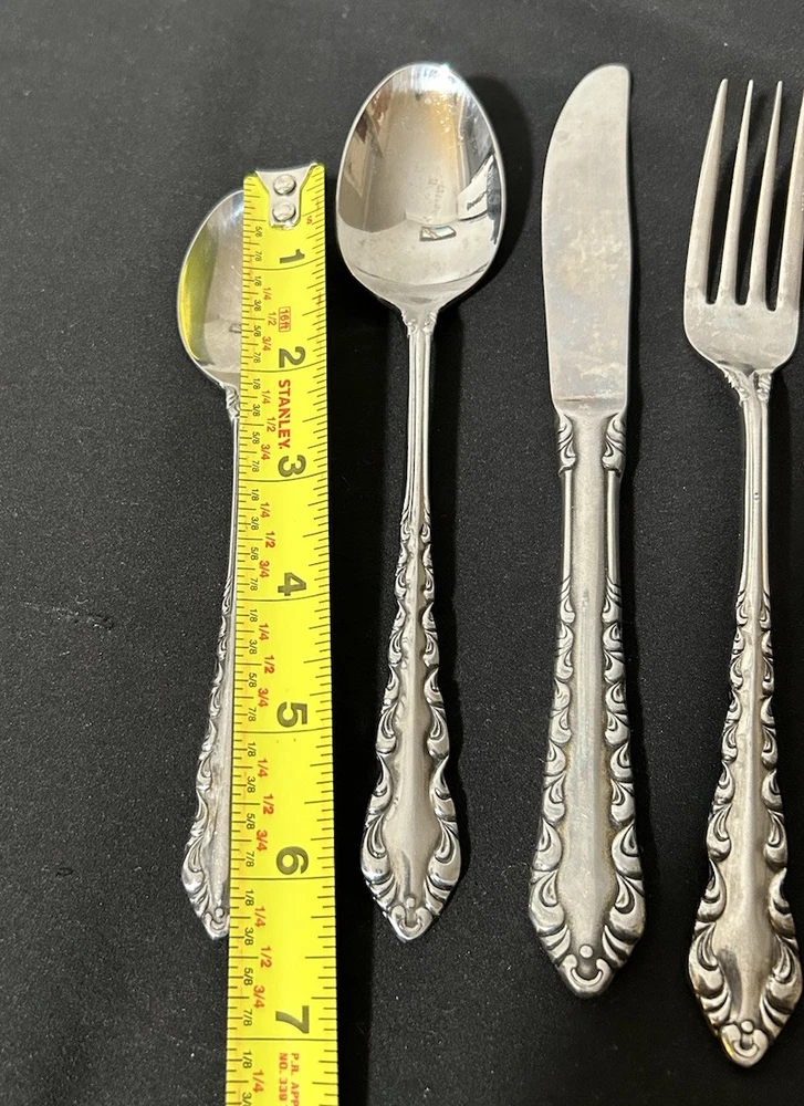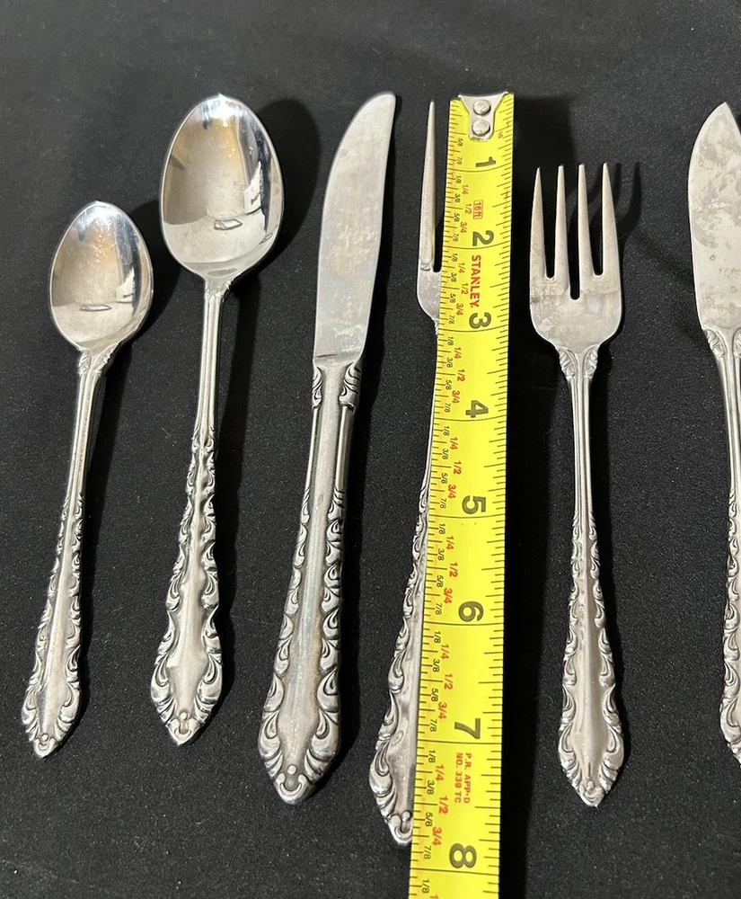 59 Pc National Stainless NS Illusion Scroll Gothic Dinner Dessert Set In Case All approximate measurements in the pictures 13 teaspoons 10 salad forks 12 dinner spoons 11 dinner forks 11 dinner knives 1 sugar spoon 1 butter knife Good vintage condition . Minimal signs of wear and use, minor scratches. The case has many signs of wear and tear, scuffs, scratches, and discolorations. The bowl of the sugar spoons has some light discolorations. Please study pictures carefully before purchasing Feel free to ask us any questions. Thank you for visiting our store! Shlv