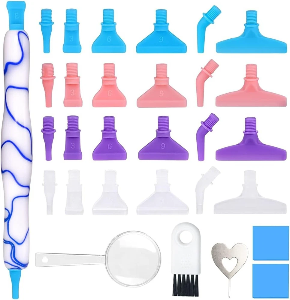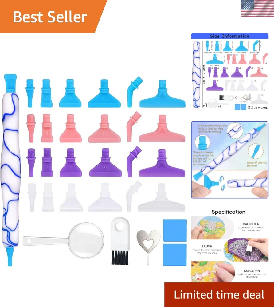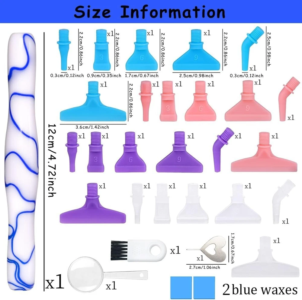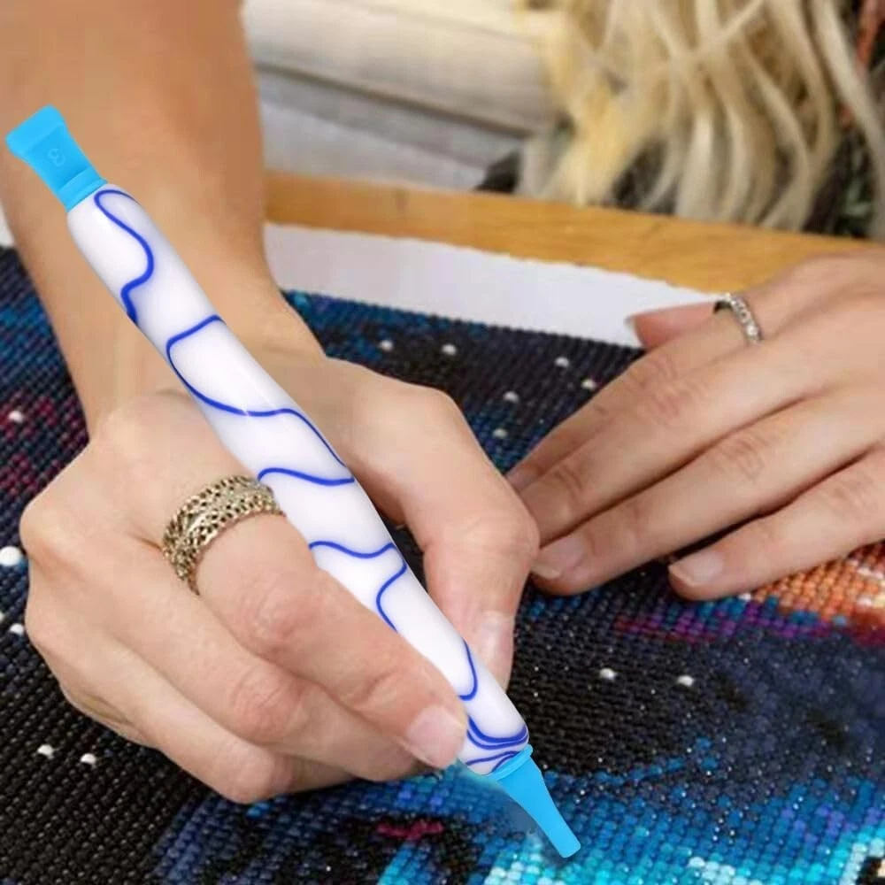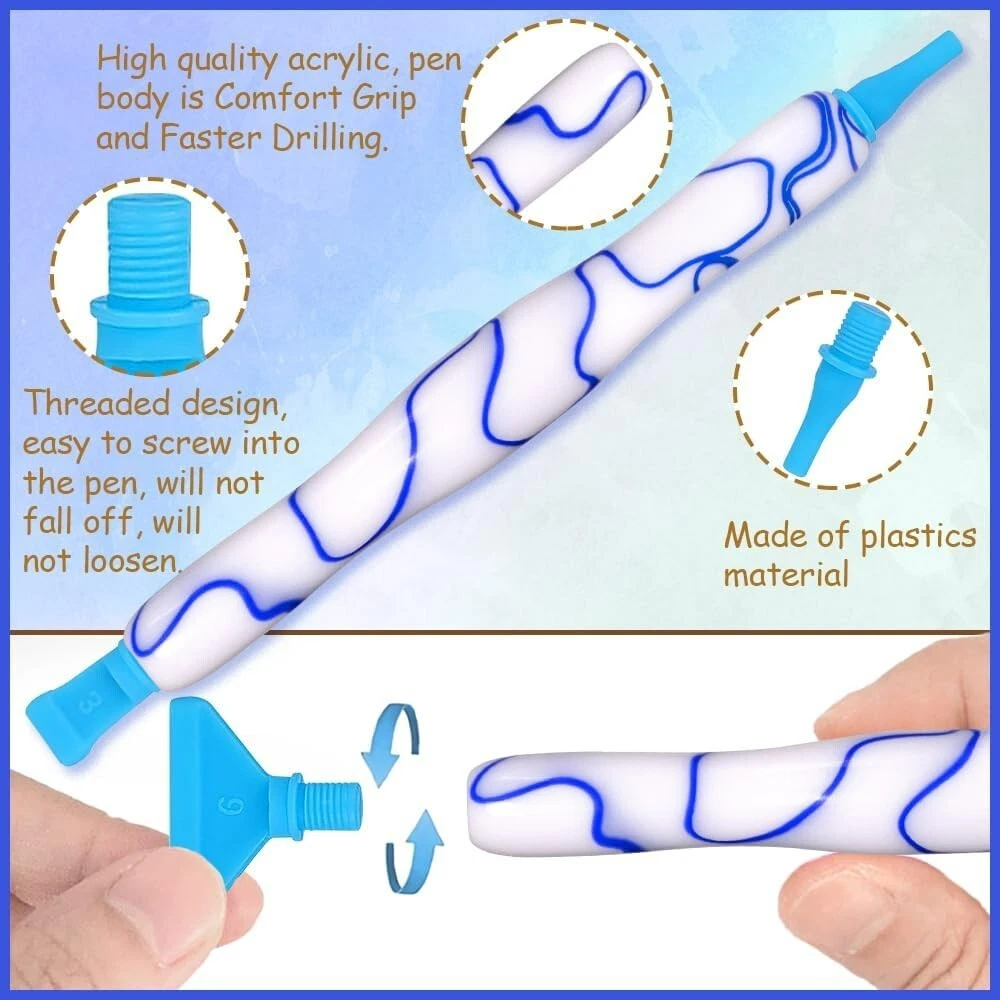 5D Diamond Painting Art Drill Dot Bead Screw Pen Only Tool Accessory Kit, Rhinestone Gem Picker for Adults Diamond Painting Nail Art Decoration WhiteBlue 【Super Comfortable Handmade Resin】The diamond painting pen is made of 100% Acrylic . It is neither thin nor too thick, Light weight ( and Super Comfortable to hold. The design makes it easy to grip! Fits hand perfectly, great to work on diamond painting with. You can diamond paint for hours with no hand cramping at all. Drilling speed up to 2 times faster than regular stylus pen. It can help you complete the 5D diamond painting kit much more easily and faster. 【Diamond Painting Pen Screw Tip Kit Package include】1PC Double-ended drill pen;4PC x1 Beads plastic Tips;4PC x1 Beads Angled plastic Tips;4PC x3 Beads plastic placer;4PC x6 Beads plastic placer;4PC x9 Beads plastic placer;4PC x plastic Correction plate;2PC x "*"Clay,1Pc tips cleaning pin,1Pc bead spread brush, 1Pc 9*4cm magnifier(3x magnification) 【Tips 】Easy to handle with all the replaceable tips and head pieces we send you! Just screw in and screw out the tips. Especially the paintings that use symbols those are similar! So our specially 1 beads angled tips are very helpful. The bend in the pen lets you see exactly where it needs to be placed. 【Diamond Art Pen Color】White Blue-screw tips 【Each Pen is A Unique Artwork】Due to the natural properties of the material, each pattern on the diamond painting pen will be slightly different, it is widely use, you can use it as 6D diamond paintings pen, nail decoration drill Pen, embroidery decoration drill pen, mosaic art craft decoration pen, ect. It is amazing gift for diamond painting lover, Arts Lover. If you have any questions or suggestions about the product, please contact me and we will provide you with quality service. Welcome Ergonomic Diamond Art Painting Pen from Our imaginative diamond painting pen is comfortable to design makes it easy to grip! You can diamond paint for hours with no hand cramping at all.Drilling speed up to 2 times faster than regular stylus pen. It can help you complete the 5D diamond painting much more easily and faster.