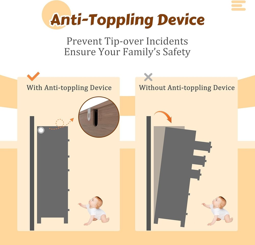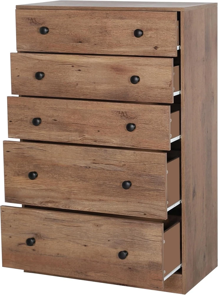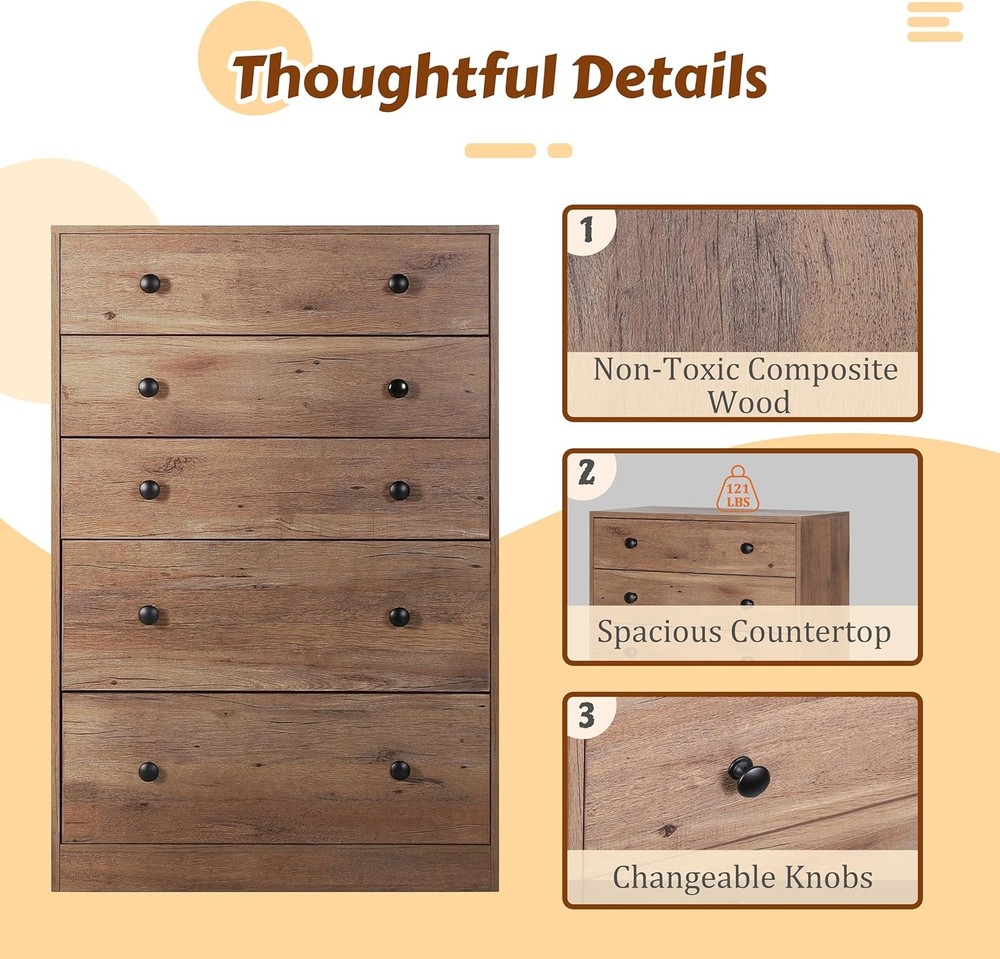 Product Description This 5 drawer dresser is designed to be oversized with larger and deeper drawers to store small and large personal items such as clothes, socks, accessories, bed sheets, books and more. This oversized dresser is the perfect solution to your daily storage needs for the limited space, which can make your living room or bedroom organized for its spacious room with five drawers! Different from other bedroom dressers, we upgraded the bottom two drawers of the 5 drawer dresser chest to larger size than the three drawers above, which is convenient for you to customize storage according to your clothing size and storage needs. The knobs for the tall dresser chest is made of metal knobs in traditional style at the same time easy to change if wish, meaning you can DIY to replace the handles. Made of non-toxic eco-friendly engineered wood without chemical smell, this bedroom chest of drawers in unique imitation wood grain oak finish with traditional leg making it suitable for anywhere and any function, such as clothing organizer for bedroom, storage cabinet for living room, display shelf for entryway and more. We have the anti-toppling kit included to secure this bedroom chest of drawers at back to the wall for safety concern. The side mounted drawer slides made of metal with a wheel on the end that glides smoothly through the rails. About this item ANTI-TOPPLING DESIGN-We have the anti-toppling kit included to secure this bedroom chest of drawers at back to the wall for safety concern. The reinforced structure with flat spacious surface tabletop would definitely provide you a safer using experience for better weight capacity to place a small TV, photo frames, small plants or decorations on it. MULTI-FUNCTIONAL DRESSER-Made of non-toxic eco-friendly engineered wood without chemical smell, this bedroom chest of drawers in unique imitation wood grain oak finish with traditional leg making it suitable for anywhere and any function for bedroom, storage cabinet for living room, display shelf for entryway and more. UPGRADER DETAILS FOR DRESSER-Different from other bedroom dressers, we upgraded the bottom two drawers of the 5 drawer dresser chest to larger size than the three drawers above, which is convenient for you to customize storage according to your clothing size and storage needs. Meaning you can DIY to replace the handles. OVERSIZED DRESSER FOR BEDROOM-This 5 drawer dresser is designed to be oversized with larger and deeper drawers to store small and large personal items such as clothes, socks, accessories, bed sheets, books and more. This oversized dresser which can make your living room or bedroom organized for its spacious room with five drawers! DIMENSIONS-The overall size of 5 drawer dresser: 31.5'' W x 15.7'' D x 48.2'' H. The size of table top: 31.5'' W x 15.7'' D. The size of upper three small drawers: 28.3'' W x 12.3'' D x 4.4'' H. The size of bottom two lager drawers: 28.3'' W x 12.3'' D x 7.8'' H. The weight capacity of table top: 150lbs. The weight capacity of drawers: 45lbs/77lbs. On Aug 7, 2025 at 01:57:44 PDT, seller added the following information: