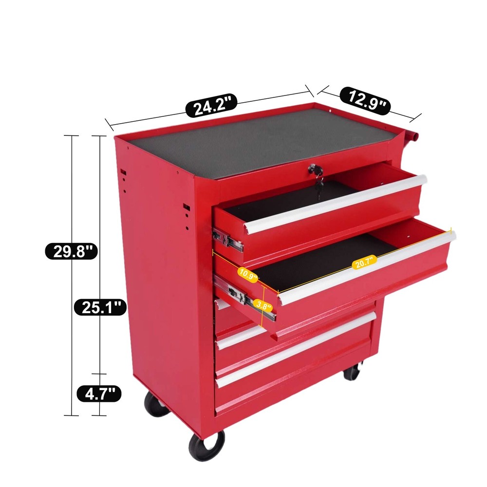 Features and Details: [Locking Function] The toolbox is equipped with a lock to protect tools from theft and damage, ensuring their safety. [High-Strength Structure] Made of thickened cold-rolled steel and triple-layer powder coating, it offers exceptional strength and durability, capable of withstanding heavy weights and pressure for secure tool storage. [Easy Assembly] The toolbox is designed for straightforward installation, with detailed instructions and instructional videos included to guide you through the process. Perfect for home workshops or professional environments, this rolling toolbox can be easily set up in garages, workshops, warehouses, and more [Removable & Non-Slip] The toolbox features 4 premium universal casters, with 2 wheels having a locking mechanism, allowing for easy mobility in the workplace and improving work efficiency. Each drawer is equipped with EVA anti-slip mats to protect your tools during movement. [Large Capacity Storage] The seven-drawer toolbox provides multiple drawers to accommodate various tools, parts, and accessories, greatly saving space. Specification: Color: Red Main Material: Steel Product Dimensions:24.21"L×12.91"W×29.88"H Weight (lbs.): 50.6