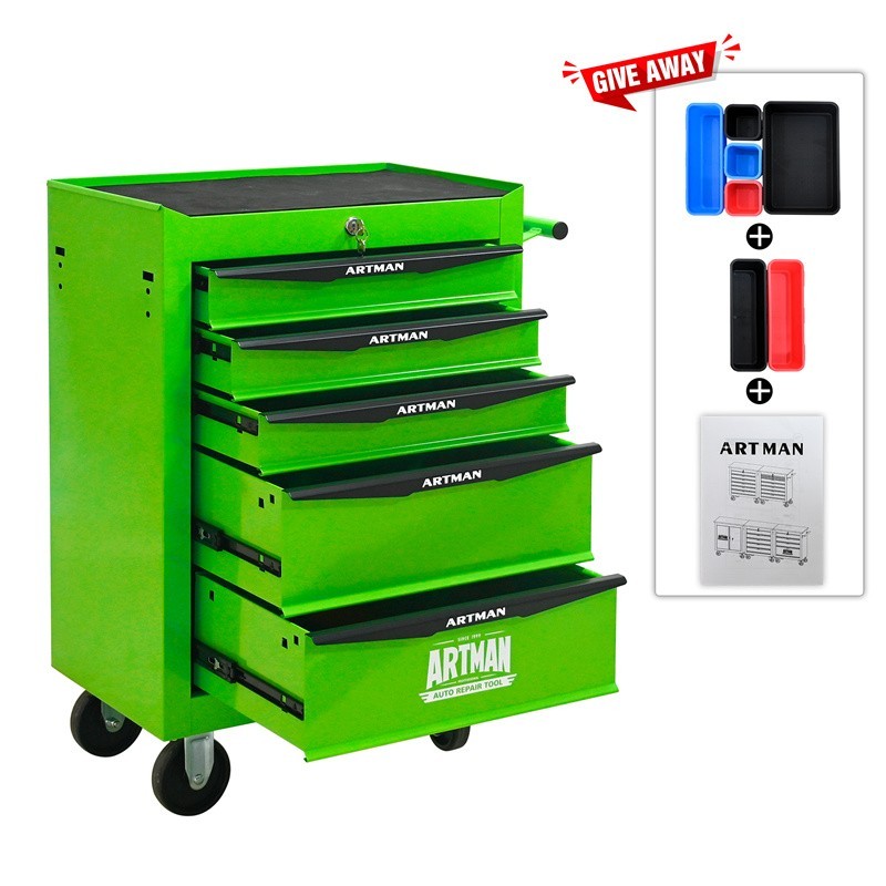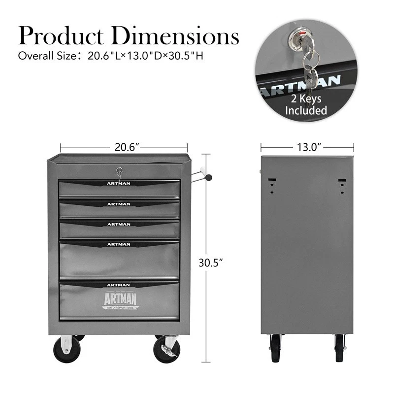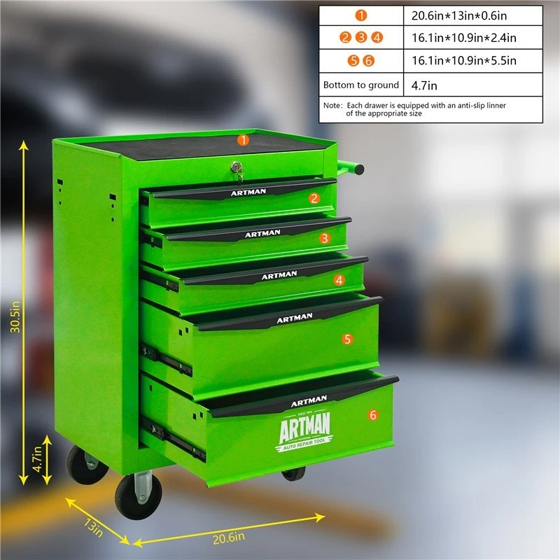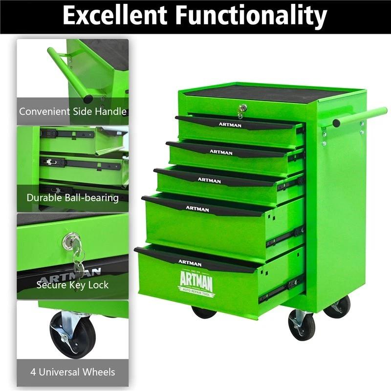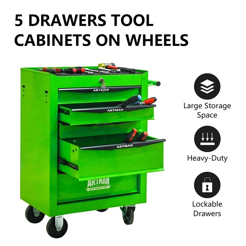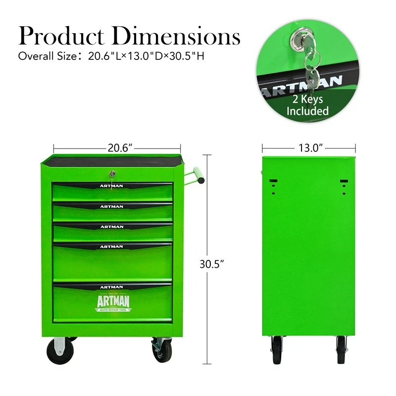 Features & Details: 5 Drawers mutifunctional tool cart with wheels. This assembly trolley has 4 steering wheels, 2 of which with parking brakes, so you can move the trolley freely in the garage, but also stop in one place. The tool box is also lockable and can be used as a removable, attachable and mobile case The opening and closing of the drawers of the tool cabinet is very gentle thanks to the ball-bearing drawers The robust and powder-coated steel construction is used for high wear resistance. This assembly trolley has 4 steering wheels, 2 of which with parking brakes, so you can move the trolley freely in the garage, but also stop in one place Specification: Material: Cold Rolled Steel Color: Green / Silver Surface Finish : Powder Coating Casters: 4" Casters (2PCS with brake and 2PCS without brake) Product Size (with wheels ): 20.63*12.99*30.59INCH Product Size: 20.63*12.99*25.83INCH Net Weight: 48.72LBS