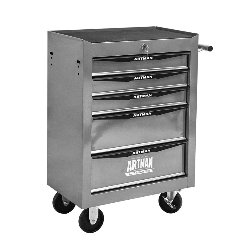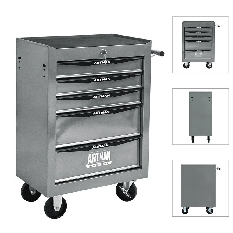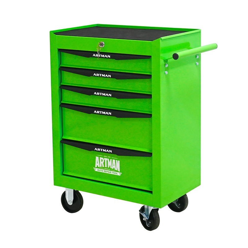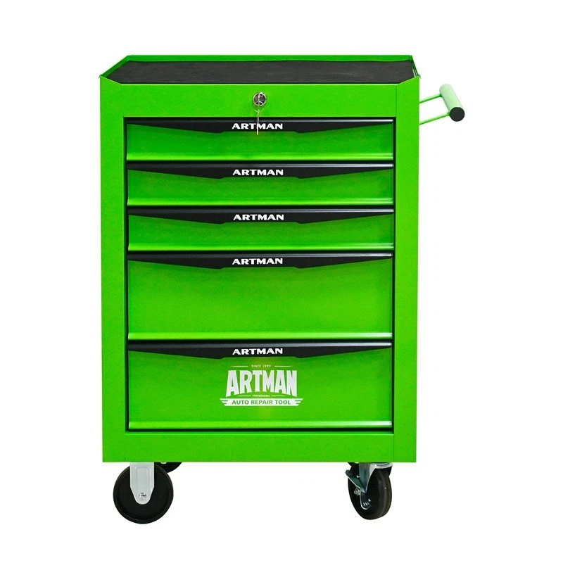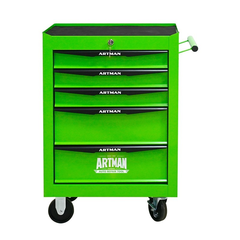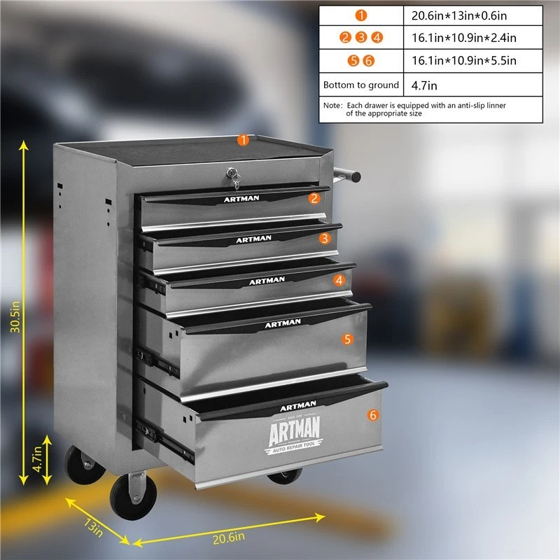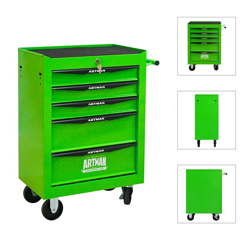 Features & Details: 5 Drawers mutifunctional tool cart with wheels. This assembly trolley has 4 steering wheels, 2 of which with parking brakes, so you can move the trolley freely in the garage, but also stop in one place. The tool box is also lockable and can be used as a removable, attachable and mobile case The opening and closing of the drawers of the tool cabinet is very gentle thanks to the ball-bearing drawers The robust and powder-coated steel construction is used for high wear resistance. This assembly trolley has 4 steering wheels, 2 of which with parking brakes, so you can move the trolley freely in the garage, but also stop in one place Specification: Material: Cold Rolled Steel Color: Green / Silver Surface Finish : Powder Coating Casters: 4" Casters (2PCS with brake and 2PCS without brake) Product Size (with wheels ): 20.63*12.99*30.59INCH Product Size: 20.63*12.99*25.83INCH Net Weight: 48.72LBS