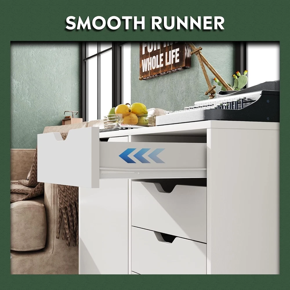 Product details: MULTIFUNCTIONAL & STYLISH: This chest of drawers with storage spaces, 5 drawers storage cabinet can perfectly match with any color schemes and tones, simple design and practicality is perfect for home office, study room, living room. AMPLE WORKSPACE: Spacious desktop can hold your printer or scanner, while one door with storage shelves can easily isolate the space according to your usage. SELECTED MATERIAL: Crafted from durable particle board for a long-term use, ECO-friendly board is scratch resistant and water resistant. EASY TO MOVE: Rolling on four wheels, this printer stand can be moved and adjusted in position freely. Built-in brakes on front two casters to keep it in position and add stability. HEAVY DUTY & EASY ASSEMBLE: This solid constructed dresser with evenly distributed maximum weight capacity of 100lbs. Overall dimension: 30.8"W x 15.8"D x 25.5"H (including casters), easy assembly with tools and instruction included. If you have quality problems, just contact us. Brand DEVAISE Product Dimensions 15.75"D x 30.71"W x 25.43"H Color White Mounting Type Floor Mount Room Type Home Office Material Engineered Wood Finish Type 1 Number of Drawers 5 Style Modern